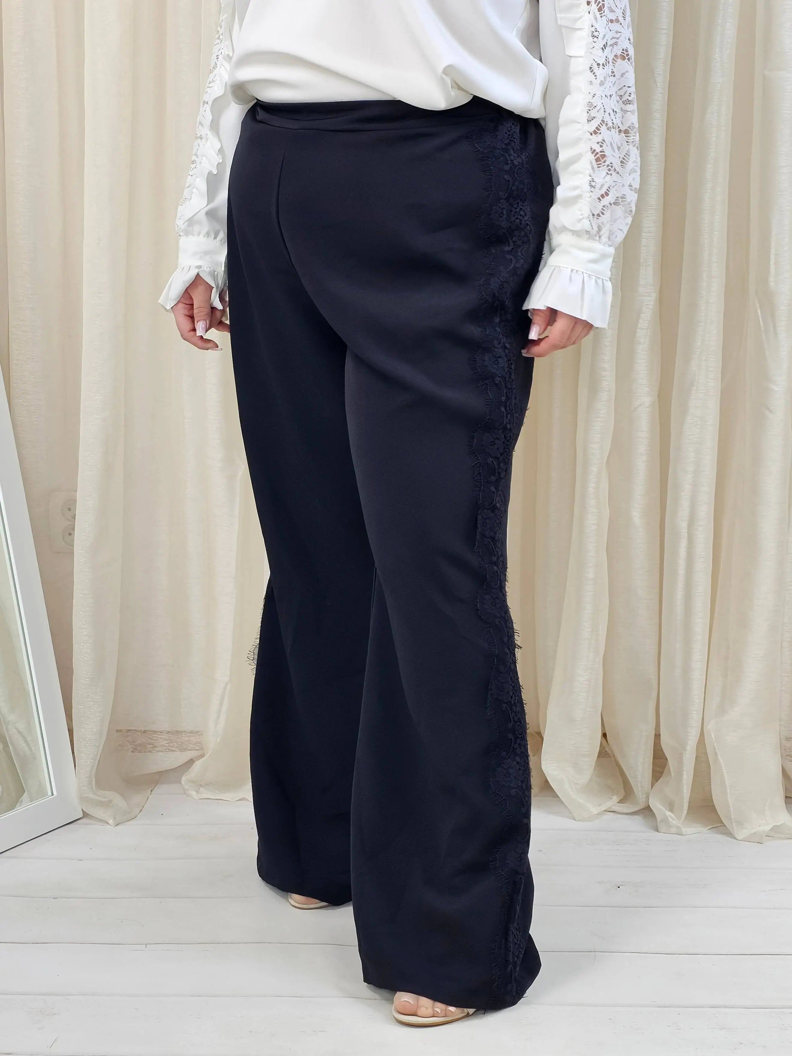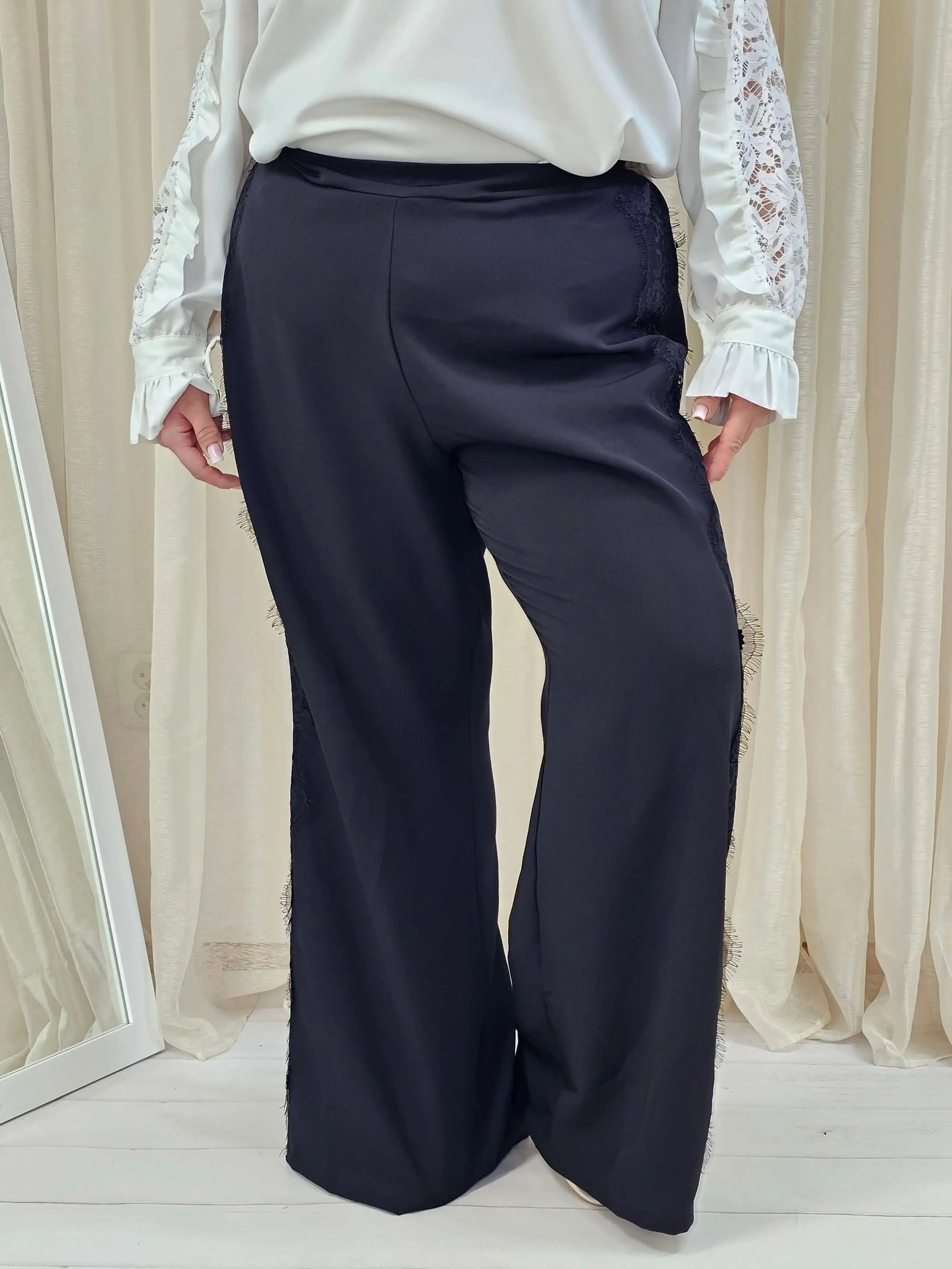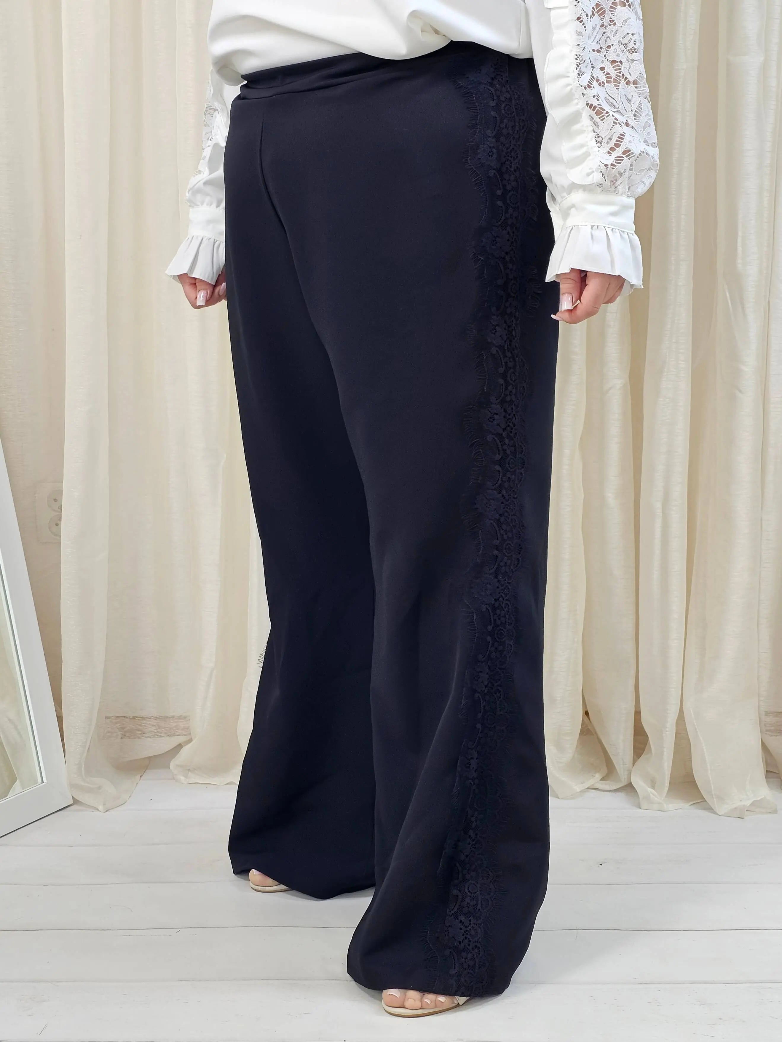 Wyjątkowym elementem są delikatne koronkowe lampasy po bokach, które dodają całości kobiecego charakteru i subtelnej elegancji. To spodnie plus size, które sprawdzą się zarówno w stylizacjach codziennych, jak i bardziej formalnych.