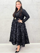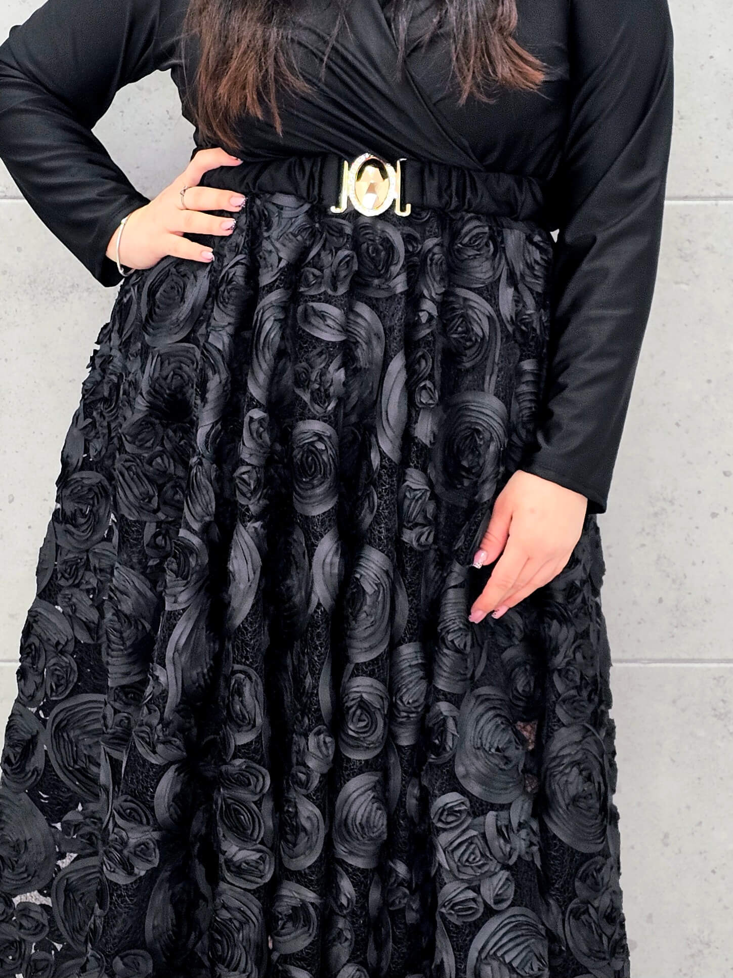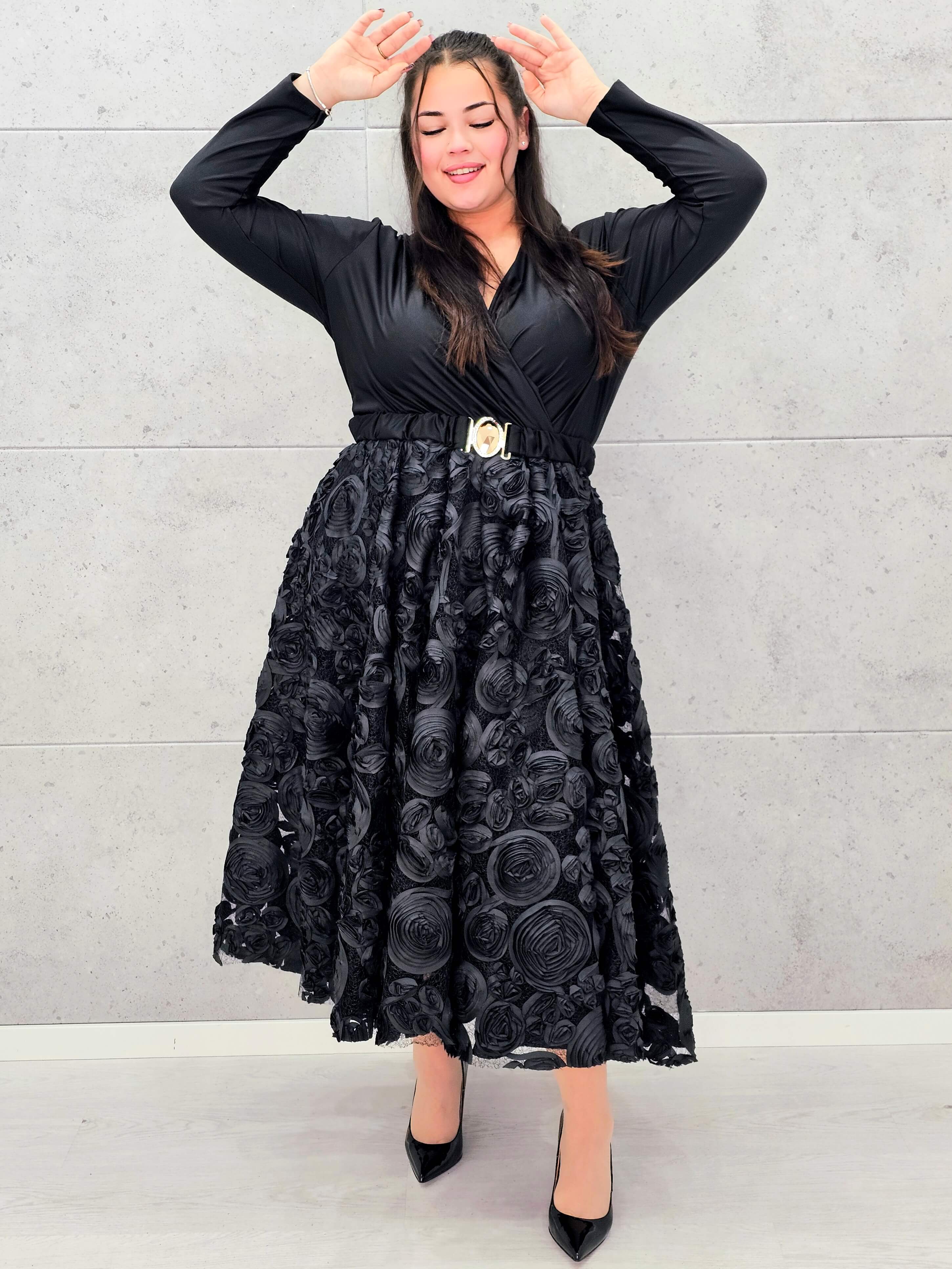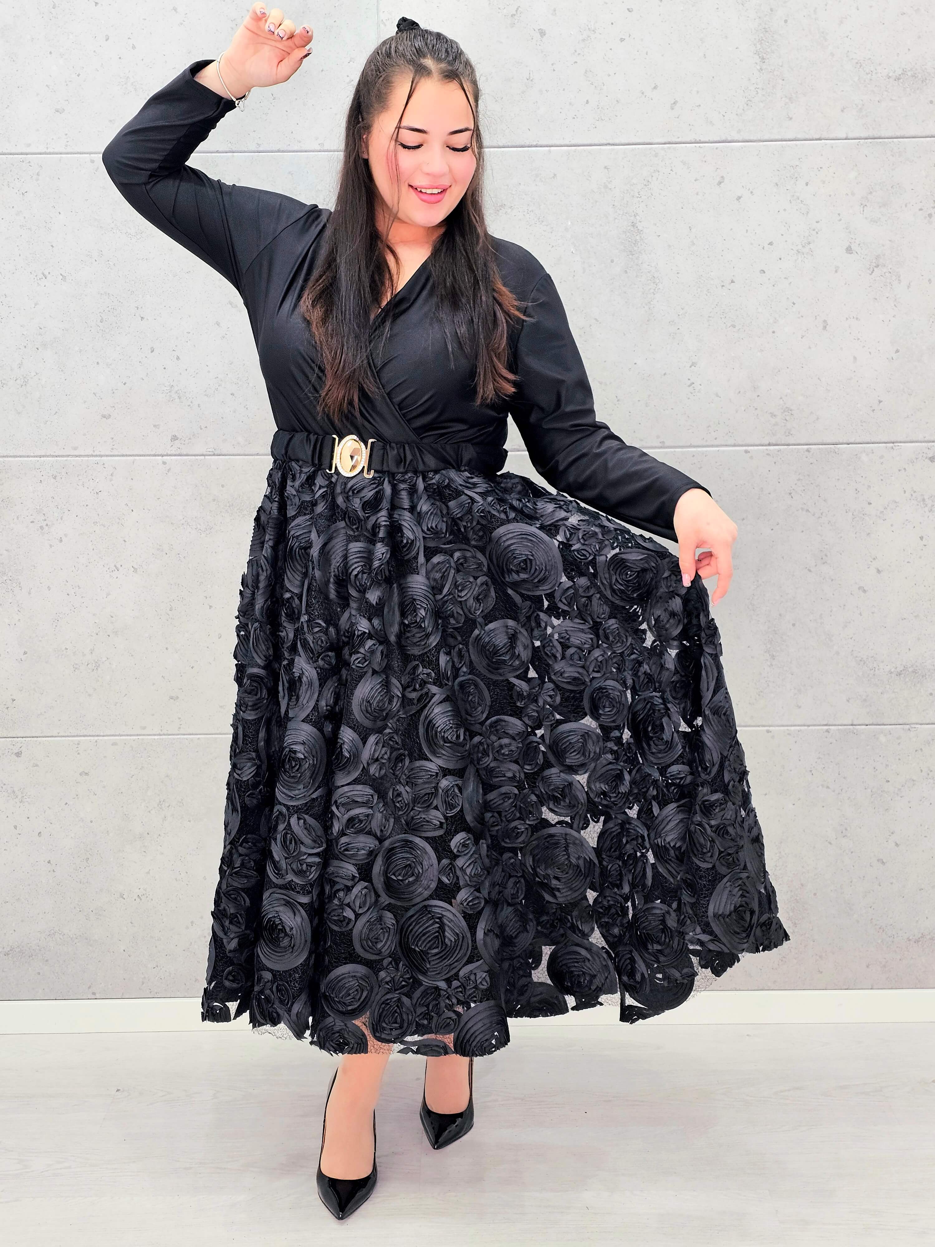 Sukienka elegancka plus size wieczorowa XXL w klasycznej czerni to propozycja stworzona dla kobiet, które kochają elegancję, wygodę i dopracowane detale. Kopertowa góra pięknie układa się na biuście, wysmuklając sylwetkę, a rozkloszowany dół z przestrzennym, kwiatowym wzorem 3D dodaje całości wyjątkowego charakteru. Model doskonale sprawdzi się jako sukienka na wesele plus size, na święta, gale, rodzinne uroczystości i wieczorne wyjścia. To idealna propozycja dla kobiet, które oczekują czegoś więcej niż klasyki – ten projekt zdecydowanie należy do wyjątkowej kolekcji Stylowa XL.