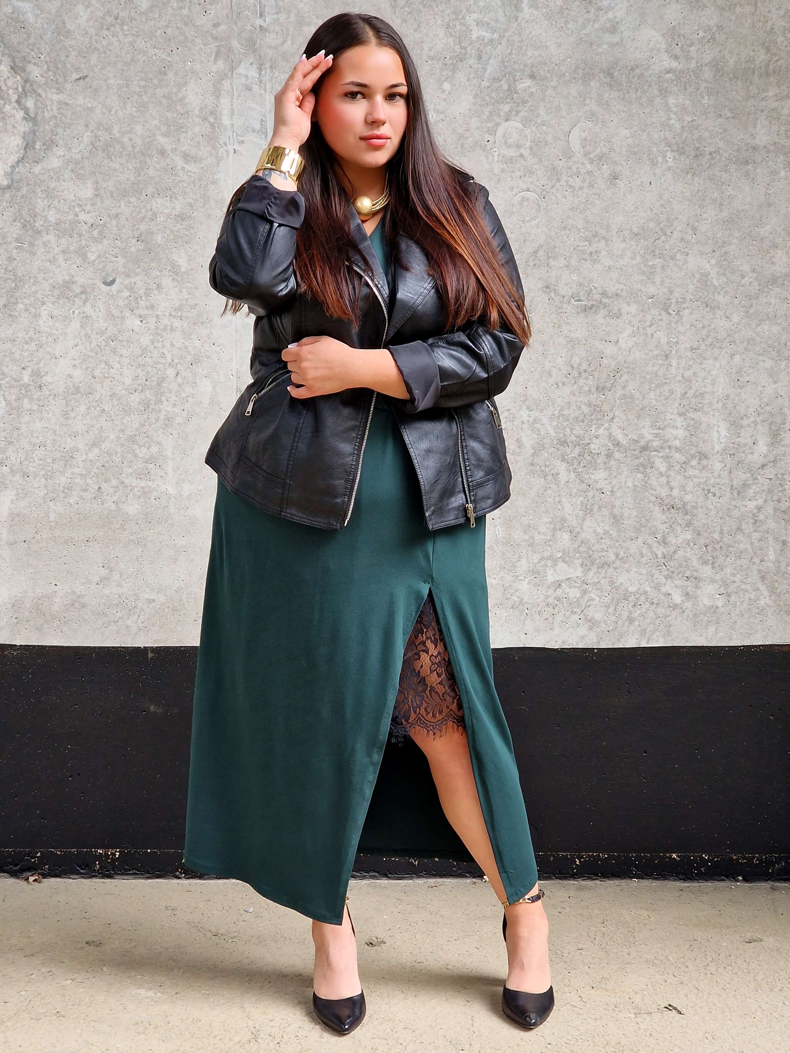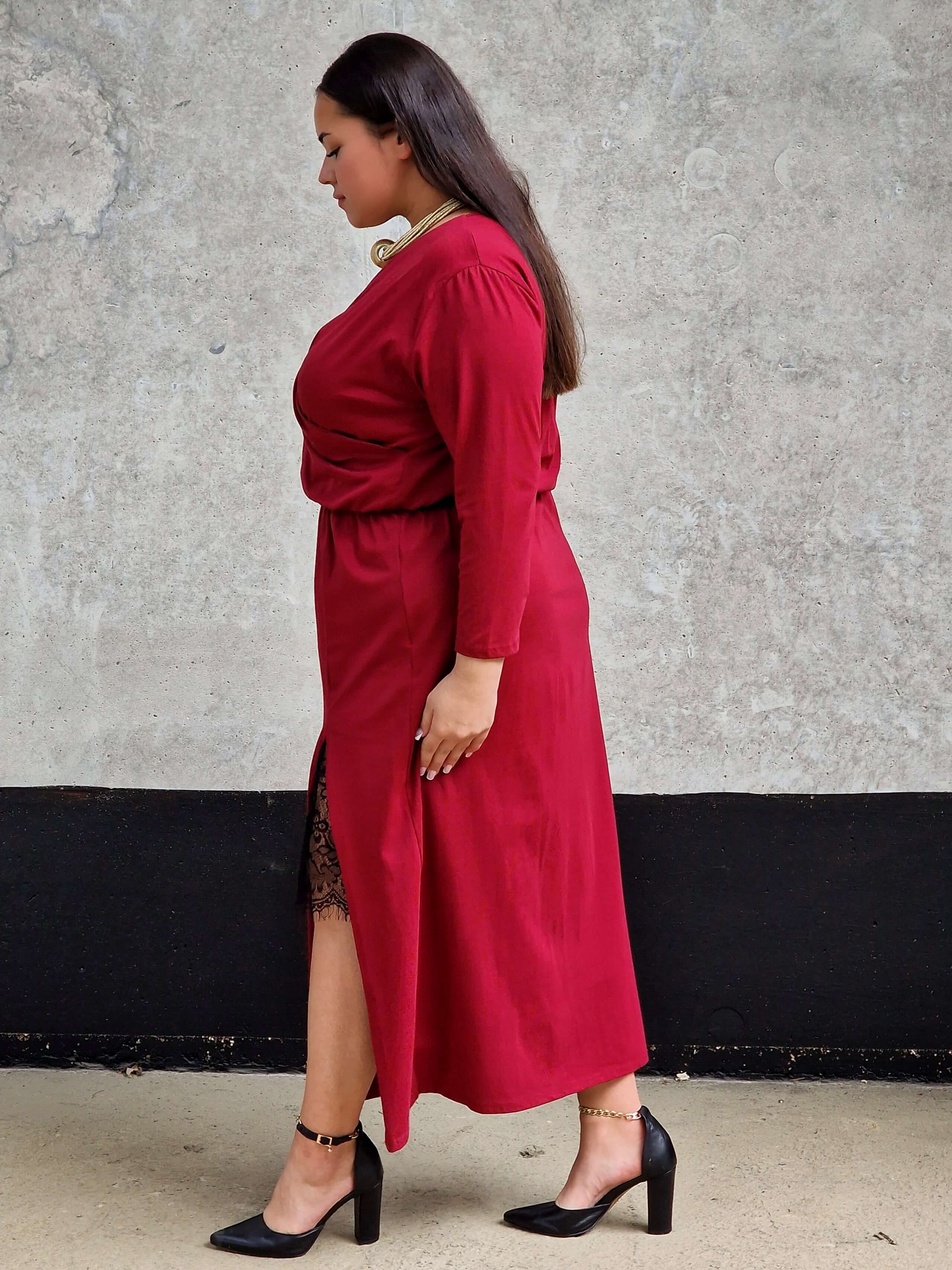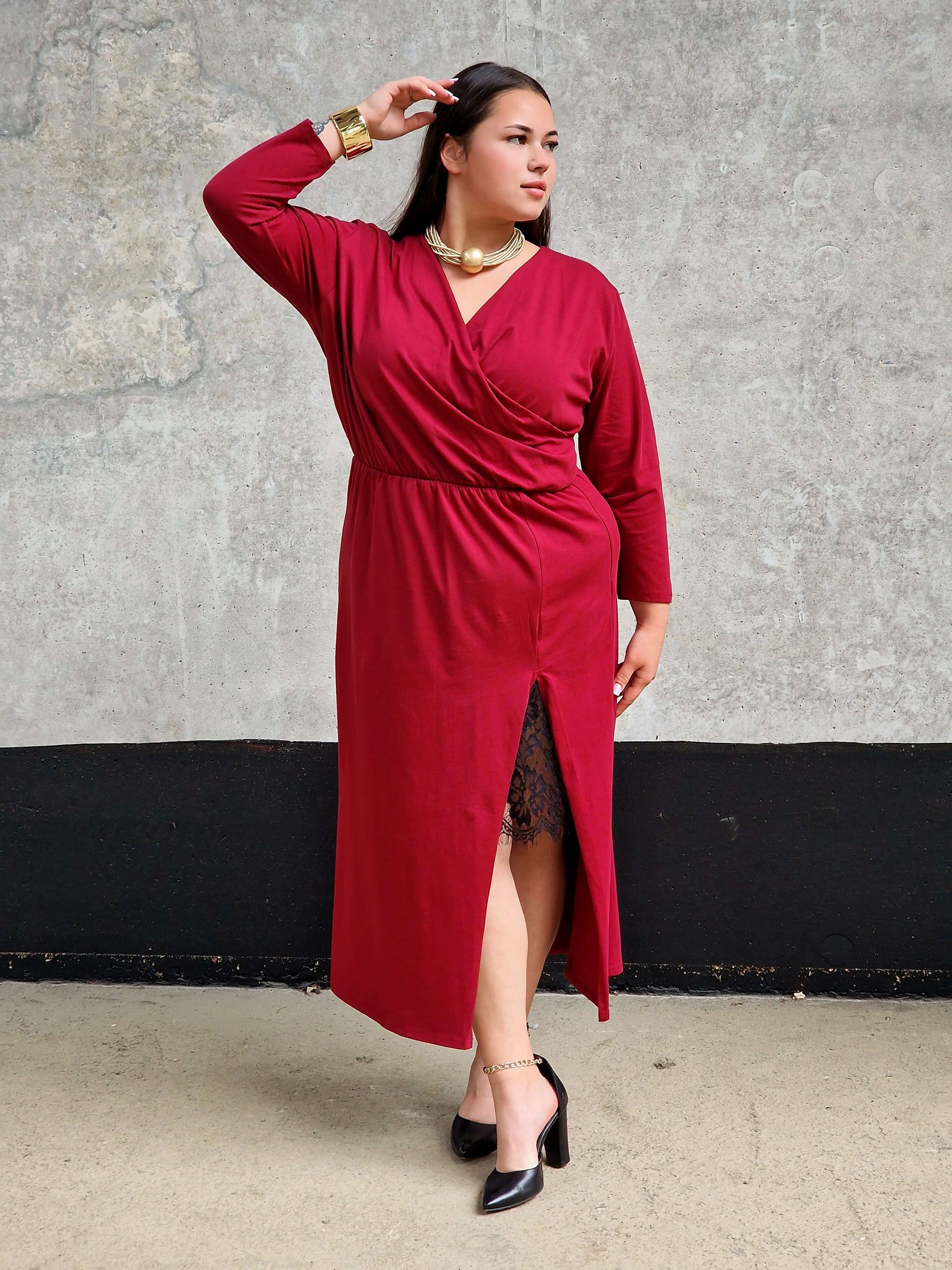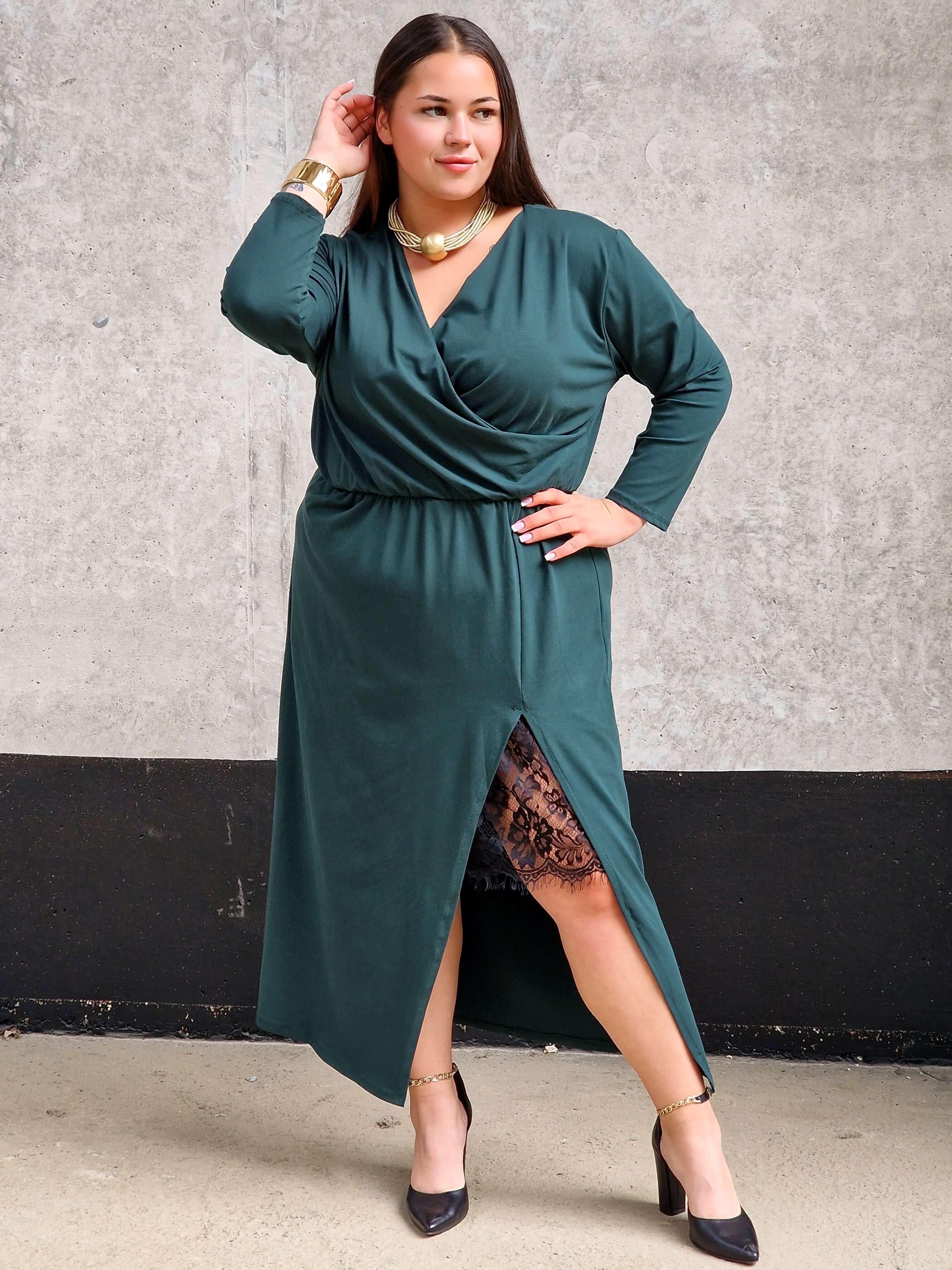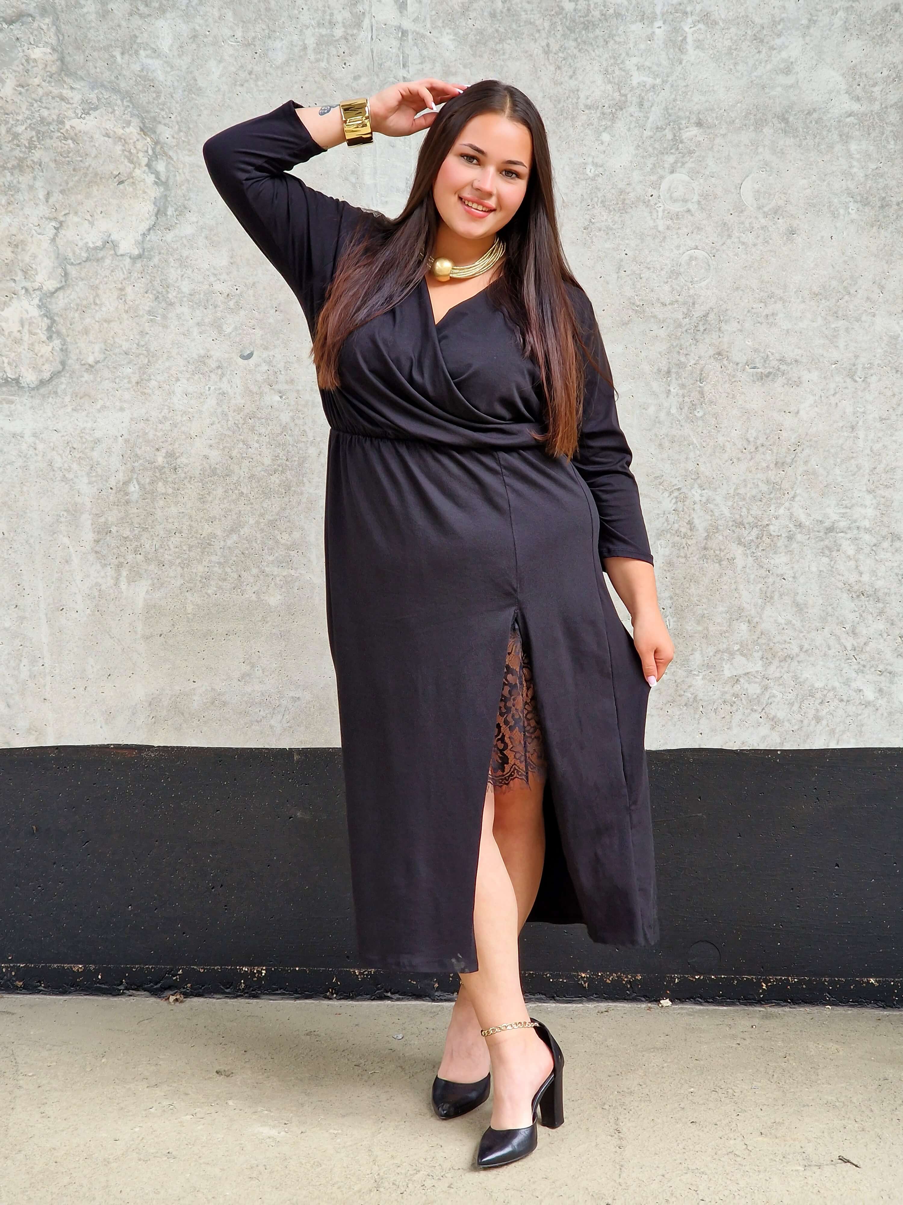 Ta sukienka to połączenie klasyki i kobiecego wdzięku. Kopertowy dekolt pięknie podkreśla biust, a delikatna koronka dodaje całości nuty zmysłowości . Elastyczna talia sprawia, że sukienka doskonale dopasowuje się do sylwetki, a rozcięcie na nodze optycznie ją wydłuża. Idealna na wyjątkowe okazje – od rodzinnych uroczystości po eleganckie wieczorne wyjścia.