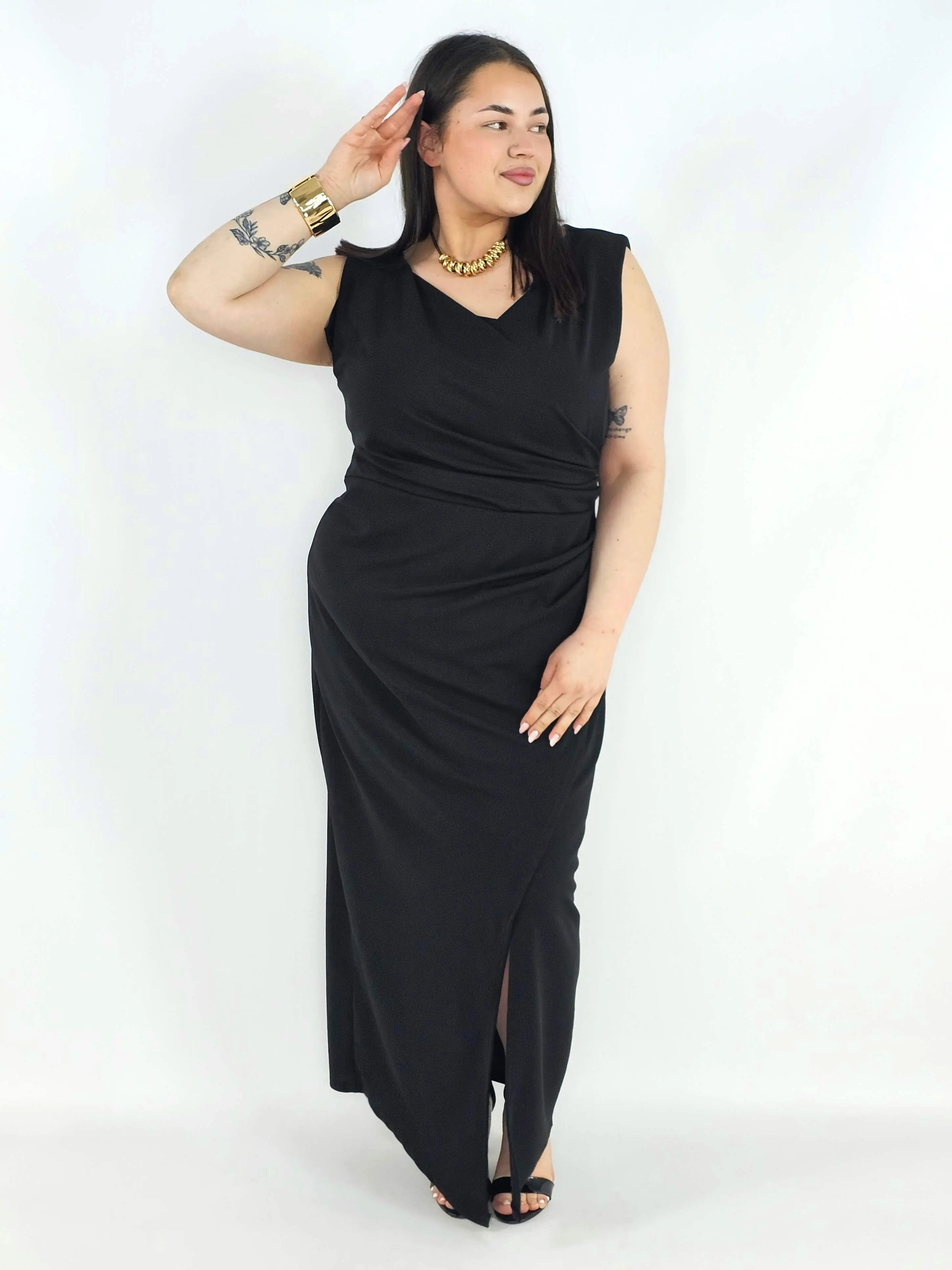 Sukienka plus size elegancka z marszczeniem – długa sukienka damska XXL z dekoltem V