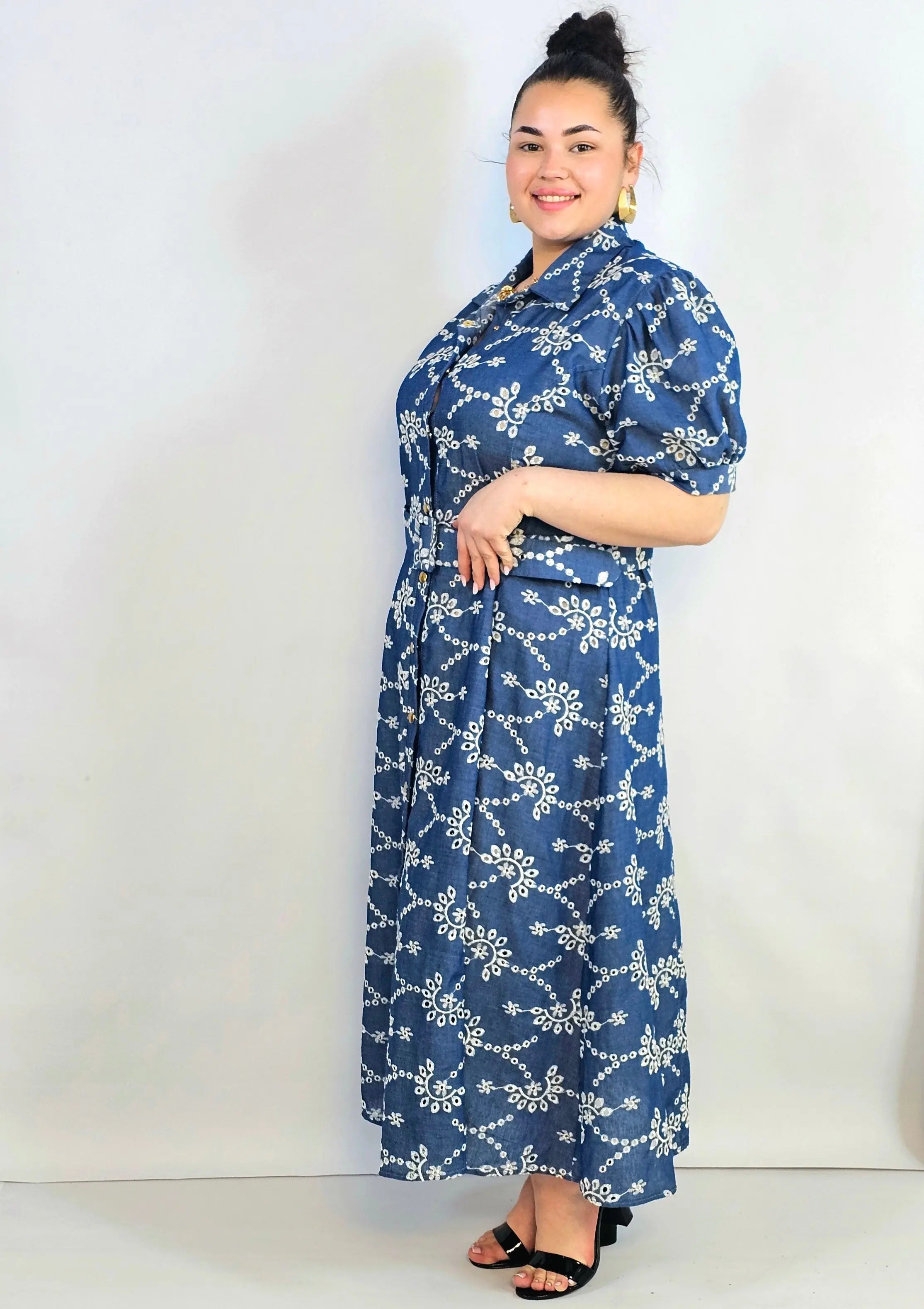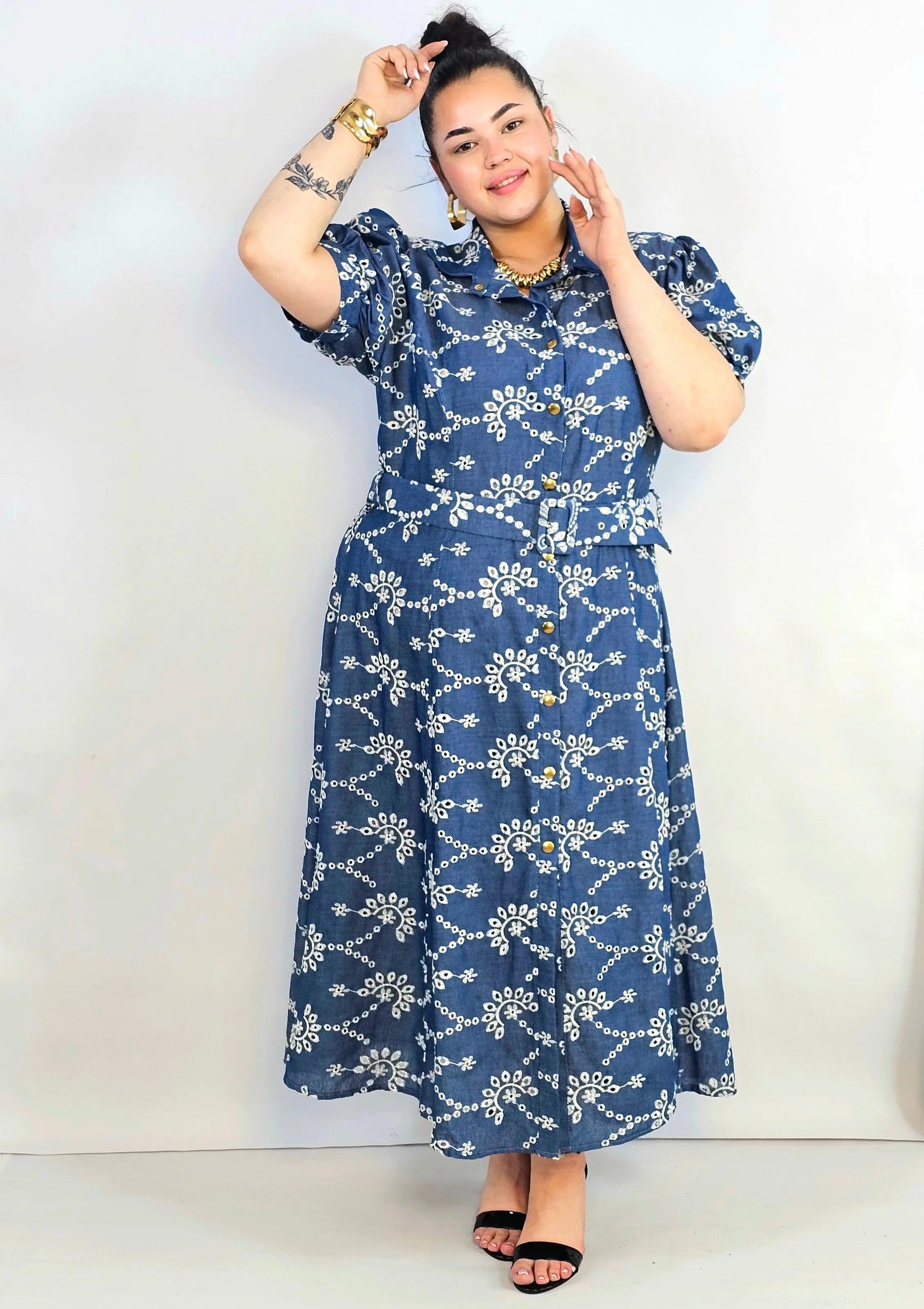Sukienka plus size o długości midi wykonana z lekkiej tkaniny o jeansowym charakterze została ozdobiona delikatnym, ażurowym haftem tworzącym regularny, ornamentalny wzór. To model, który łączy wygodę codziennego fasonu z dopracowanymi detalami.