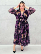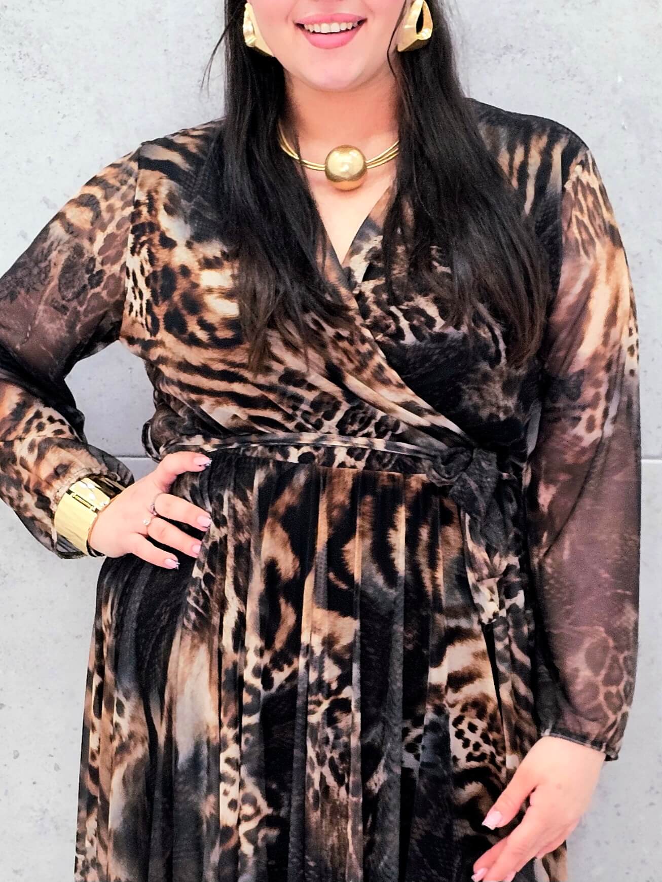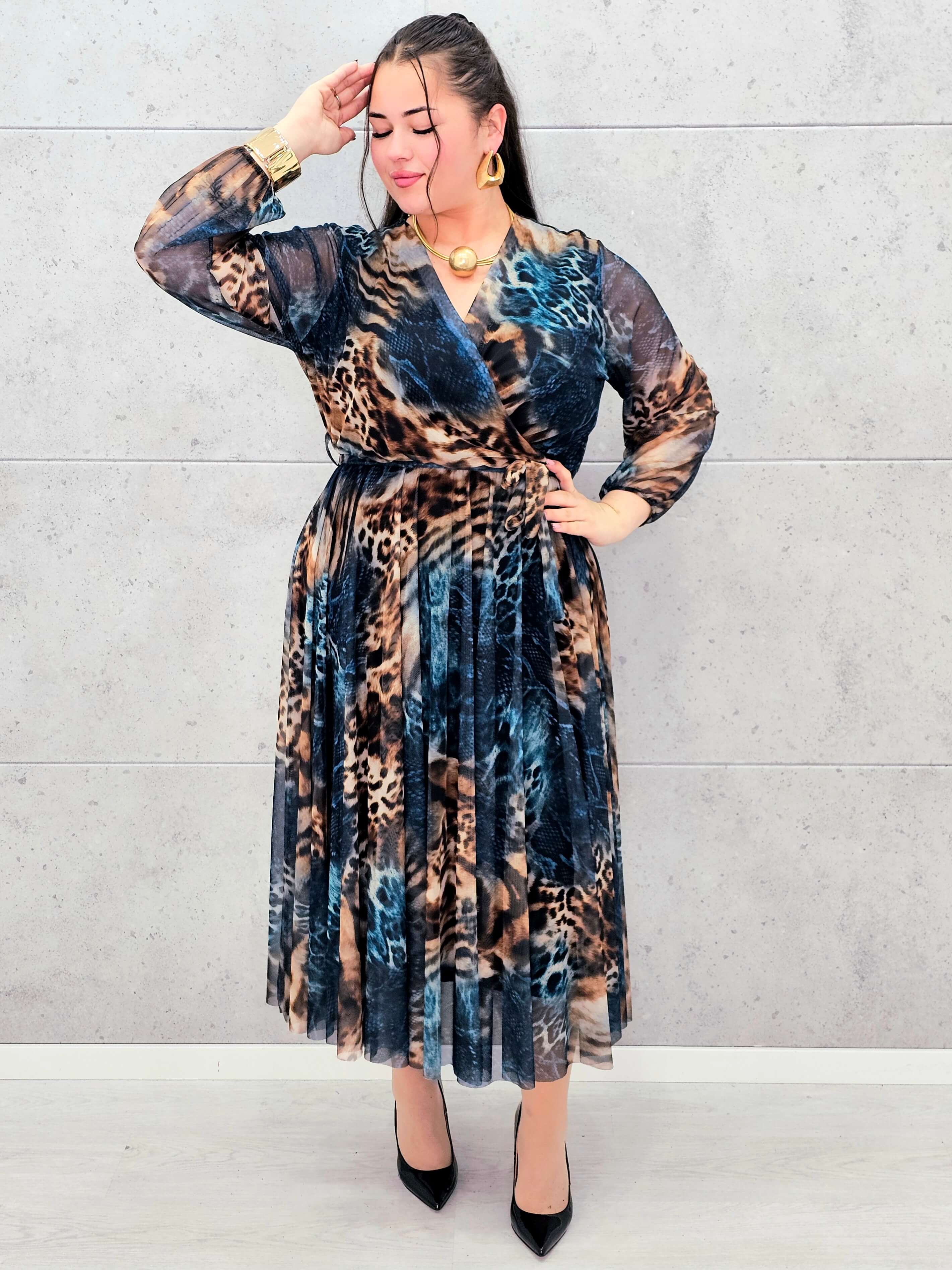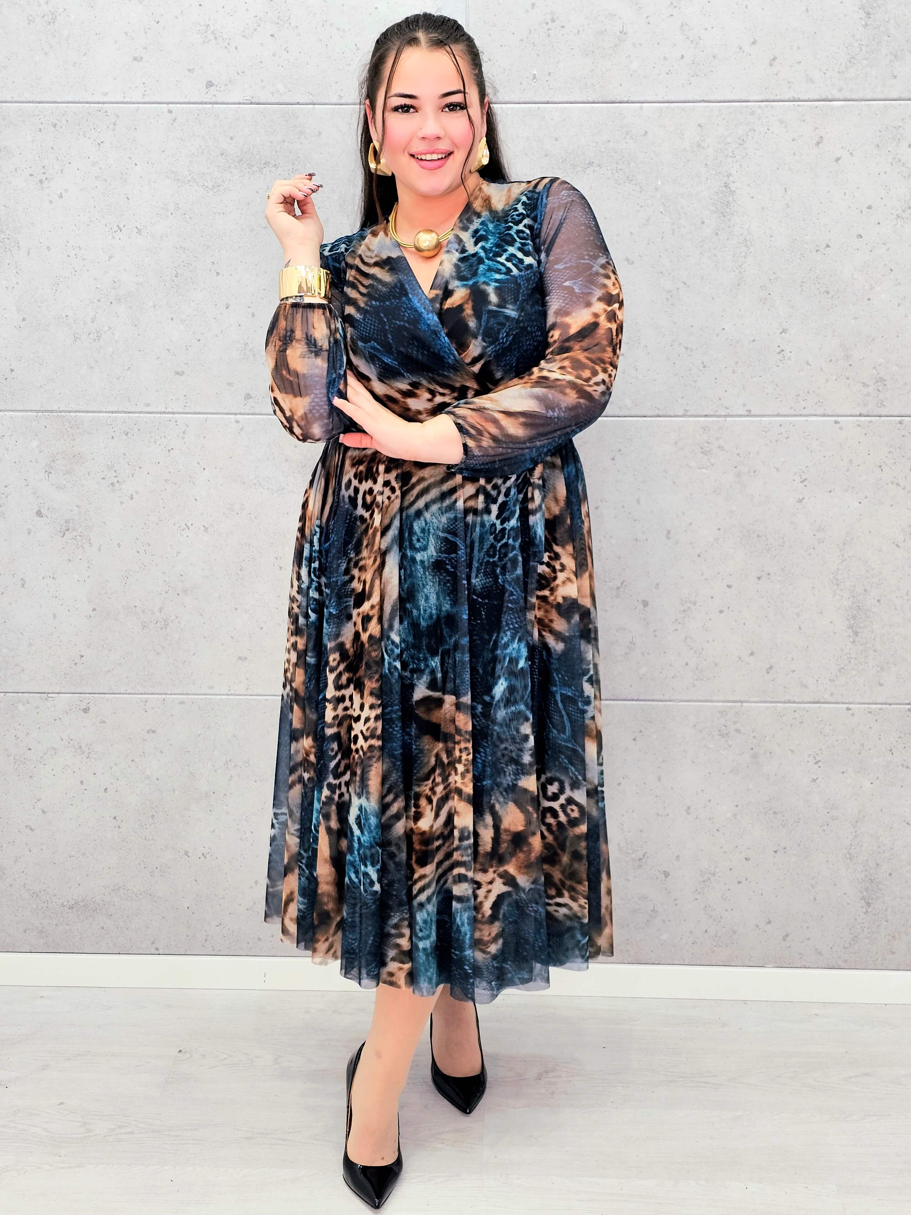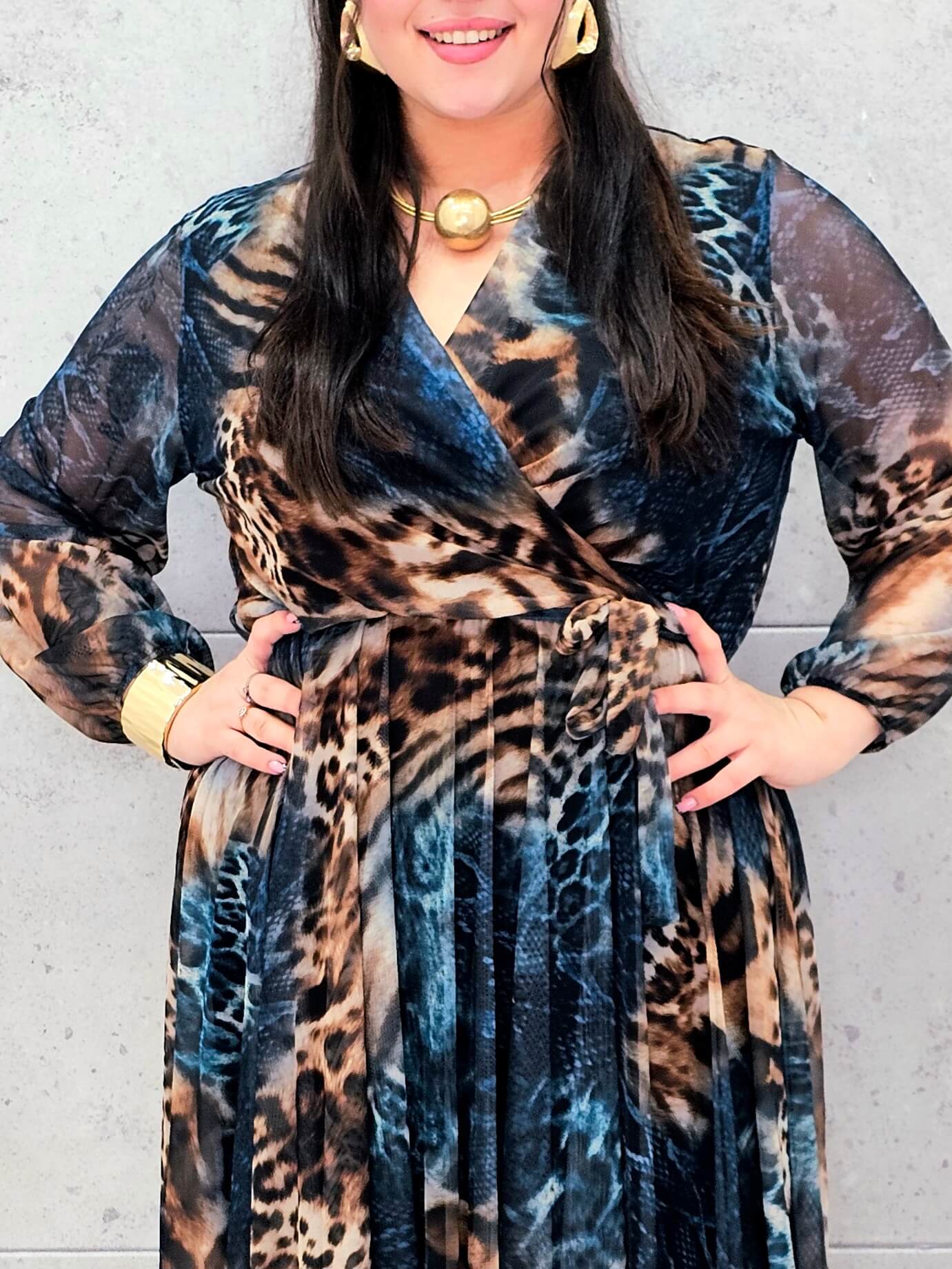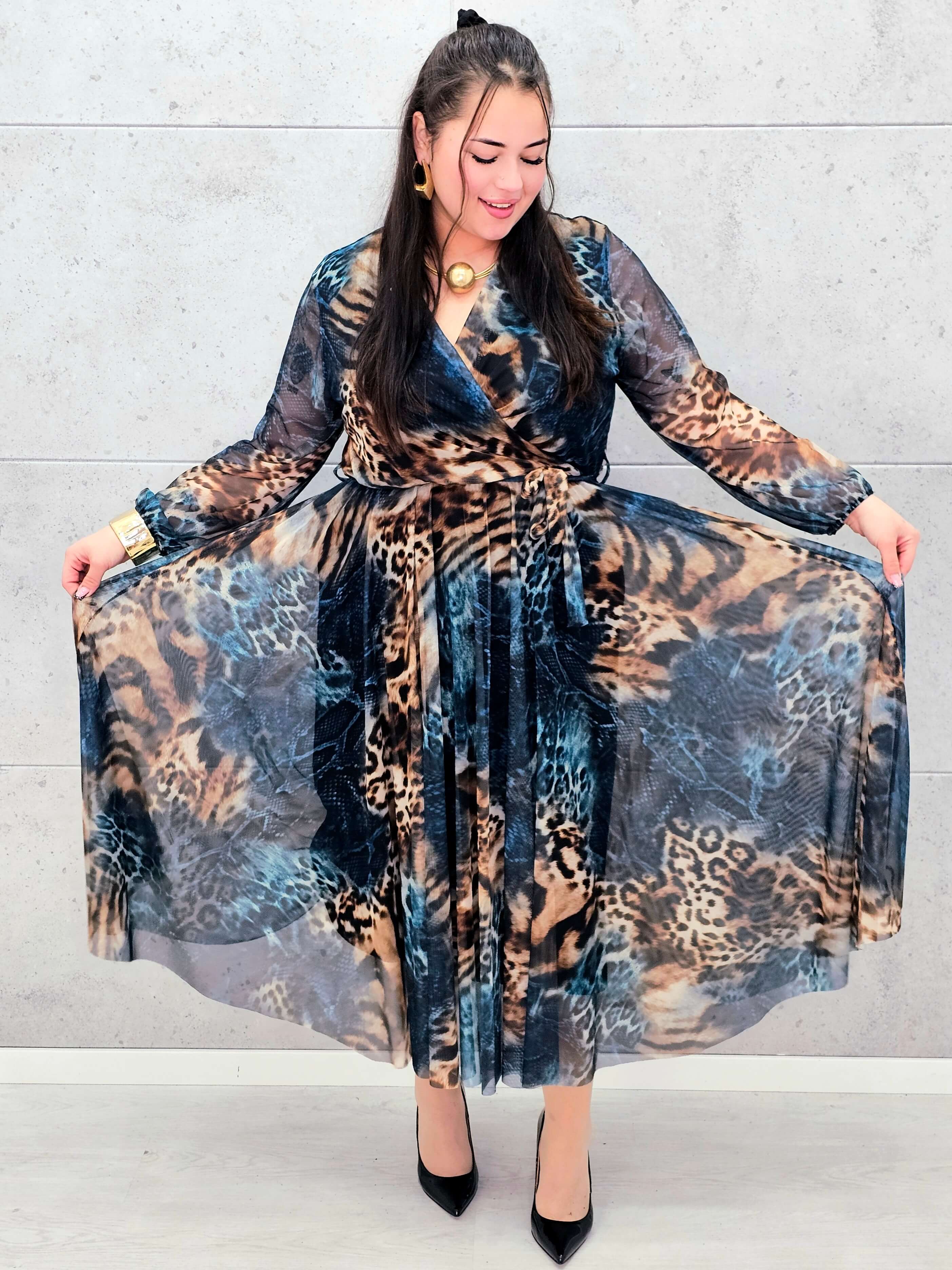 Sukienka plus size w efektowny artistic print to propozycja, która łączy lekkość, elegancję i nowoczesny charakter. Sukienka XXL została zaprojektowana tak, aby idealnie układać się na sylwetce plus size — dzięki kopertowemu dekoltowi, przewiązywanemu paskowi i miękko układającym się warstwom materiału podkreśla biust, talię i proporcje figury.