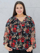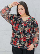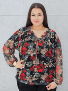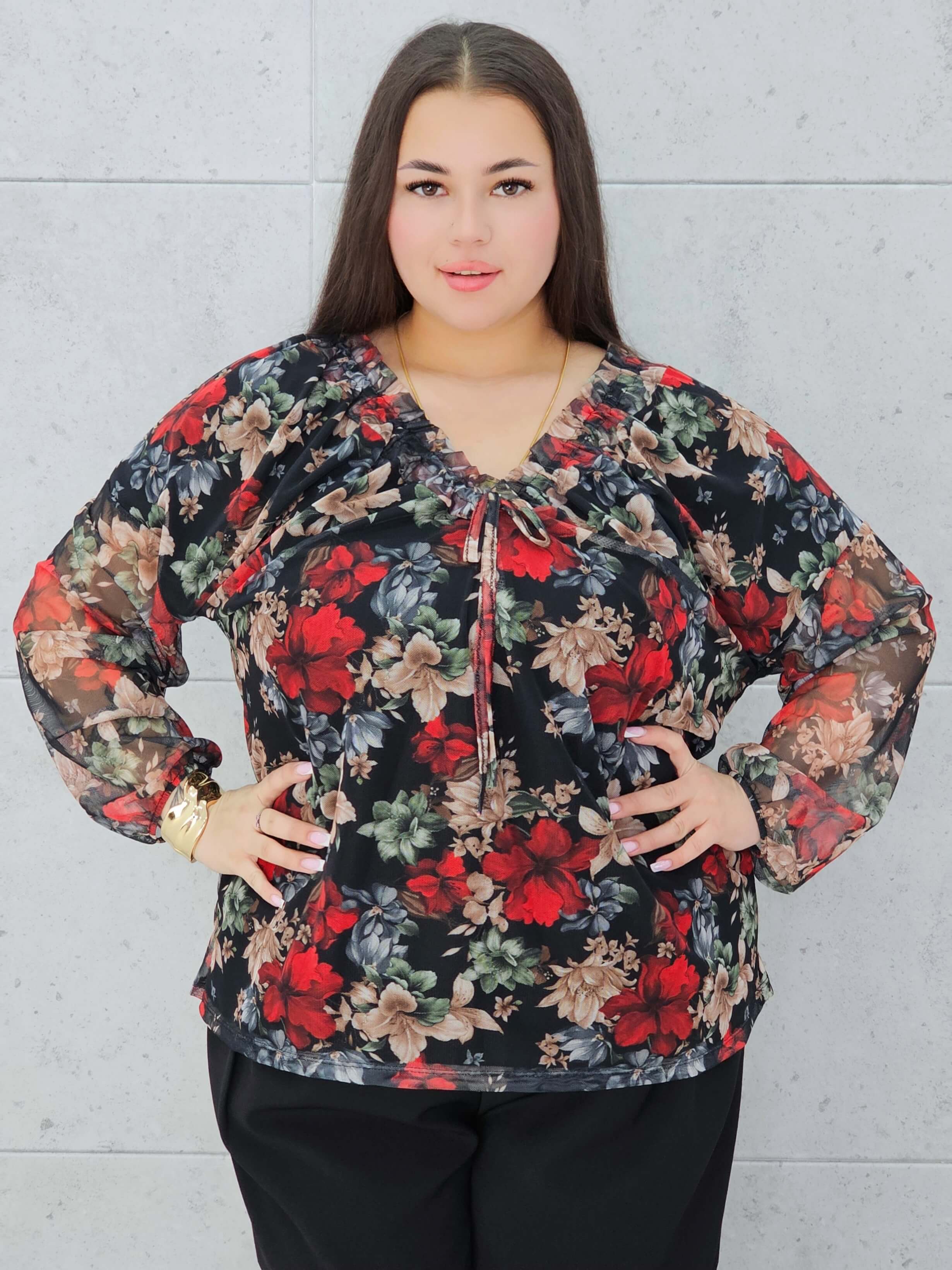 Ta bluzka to prawdziwy ukłon w stronę elegancji i subtelnego stylu  Lekki, półtransparentny szyfon z kwiatowym printem w odcieniach czerwieni, beżu i zieleni sprawia, że każda stylizacja nabiera wyjątkowego charakteru  Luźny fason pięknie układa się na sylwetce, zapewniając swobodę ruchów i komfort przez cały dzień. Idealna zarówno do pracy, jak i na spotkania w gronie przyjaciół
