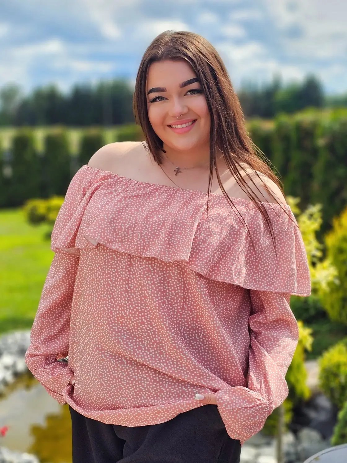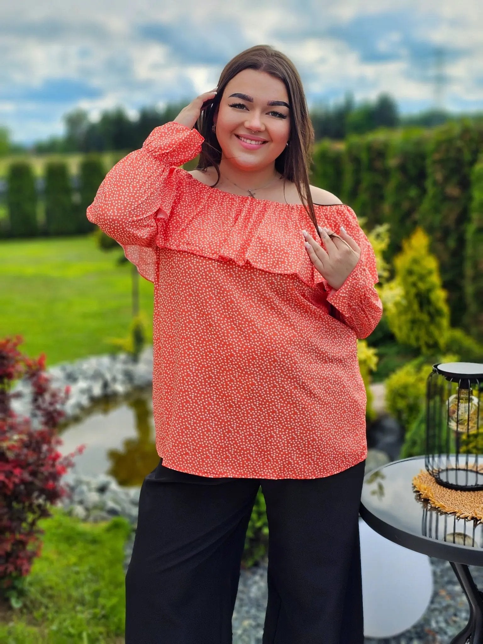 Stylowa bluzka w kroju hiszpanki, która łączy kobiecość z nutą romantyzmu. Jej luźny fason zapewnia komfort noszenia, a zwiewny materiał doskonale układa się na sylwetce, dodając lekkości i wdzięku.