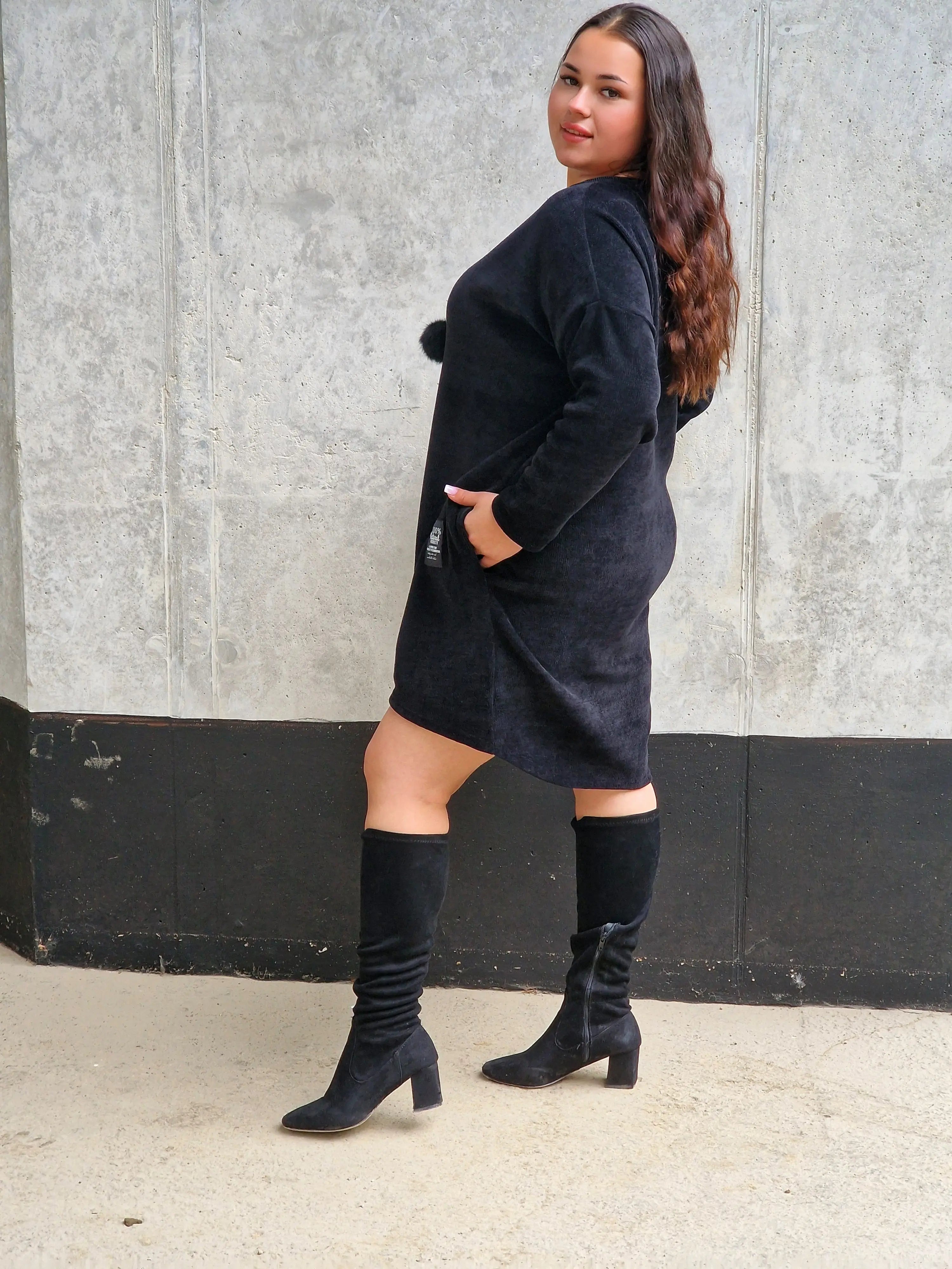 Ta wyjątkowa czarna sukienka plus size łączy prostotę z elegancją, tworząc idealną bazę do codziennych i casualowych stylizacji. Możesz nosić ją z trampkami dla luzu, z kozakami dla miejskiego szyku lub z botkami, by uzyskać kobiecy, jesienny look.