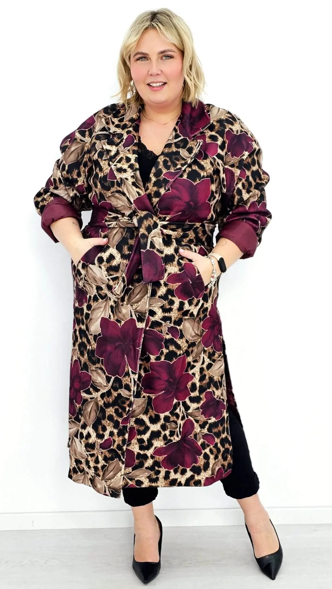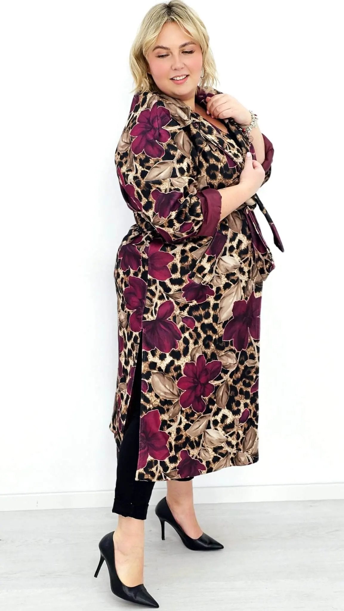 Przyciągnij uwagę wyjątkowym płaszczem, który łączy w sobie dwa wyraziste wzory: klasyczną panterkę i kwiatowy motyw. Ten niezwykły model to idealny wybór dla kobiet, które lubią eksperymentować z modą i wyrażać swoją osobowość. Płaszcz ma prosty krój z wiązaniem w talii, co podkreśla sylwetkę, a szerokie mankiety i wyrazisty kołnierz dodają elegancji. Zrównoważenie dzikiego wzoru panterki z delikatnymi kwiatami tworzy unikalną stylizację, która będzie wyróżniać Cię na każdym kroku.