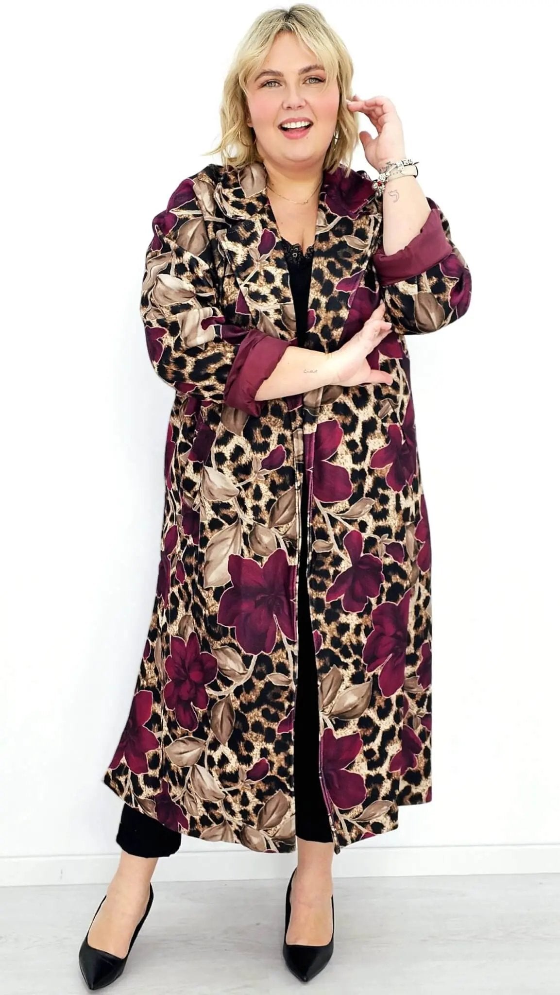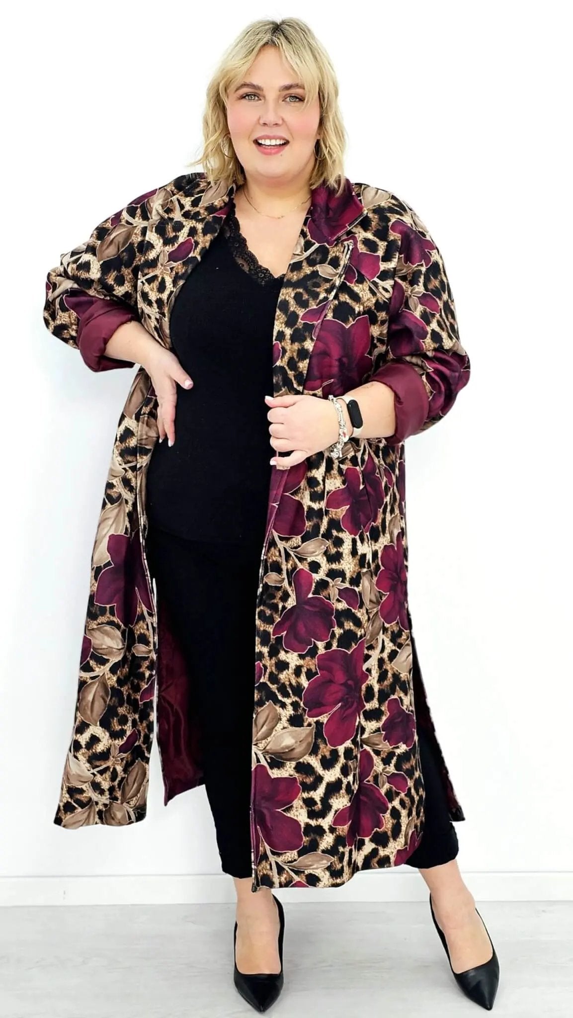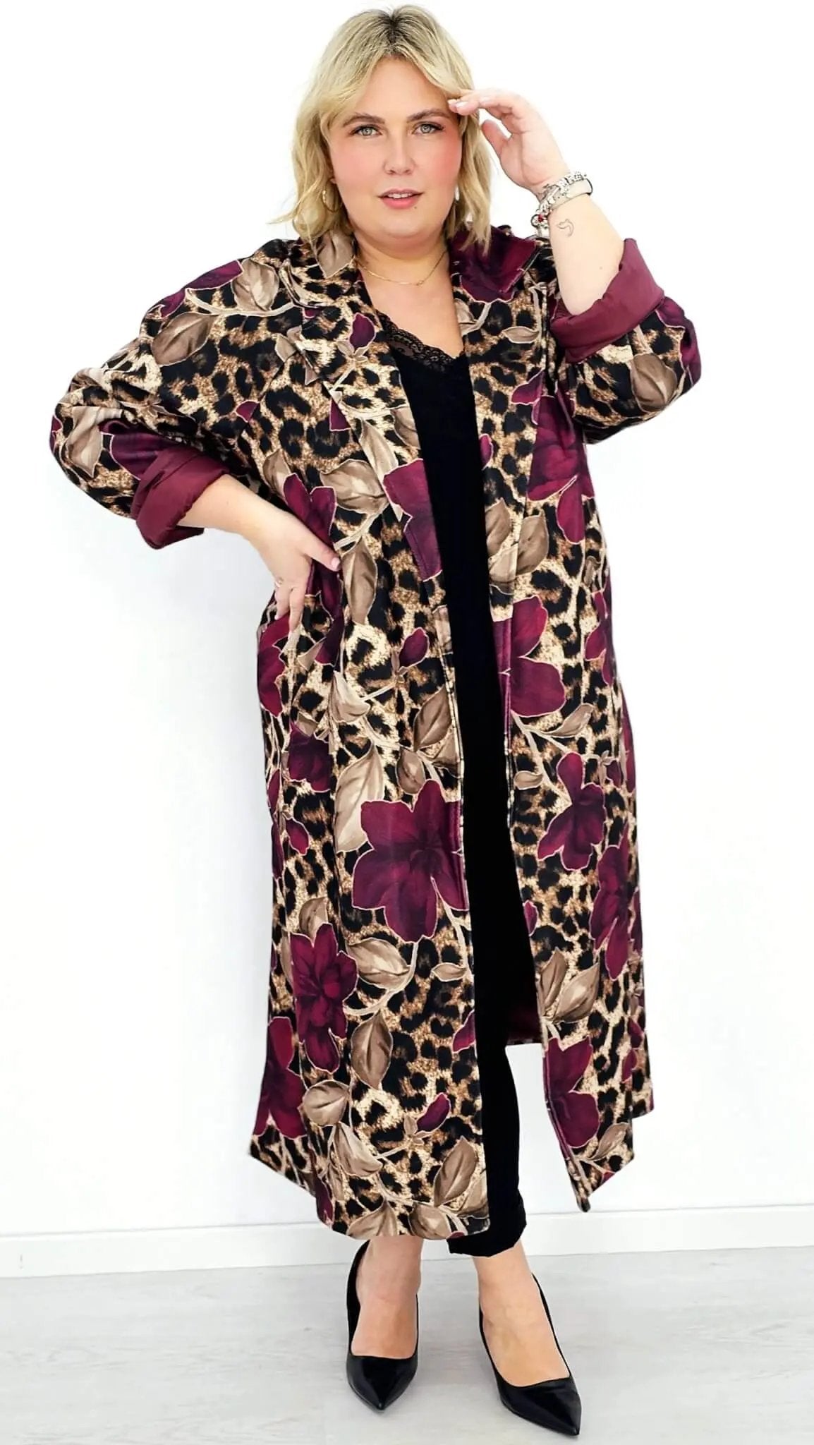 Płaszcz damski bordowy w kwiatowy wzór i panterkę