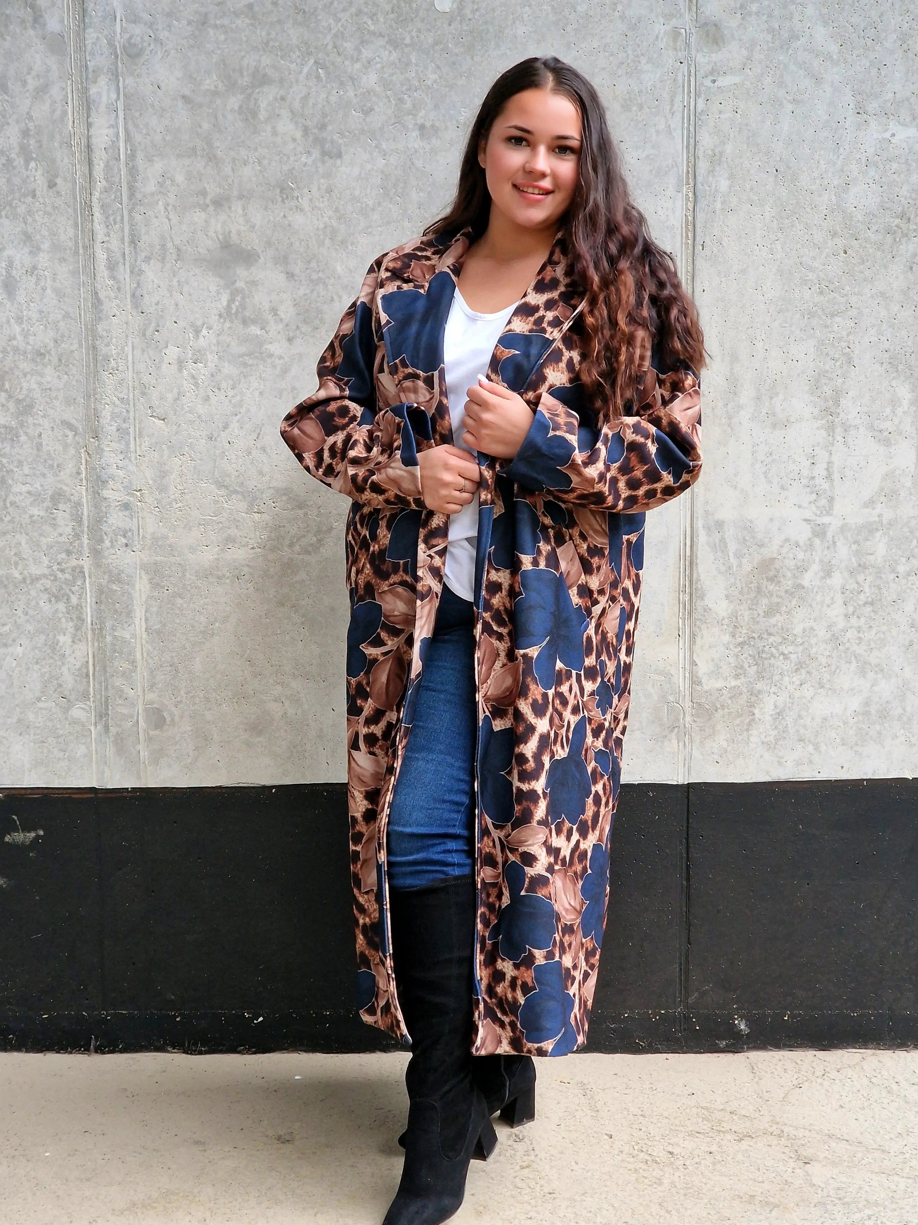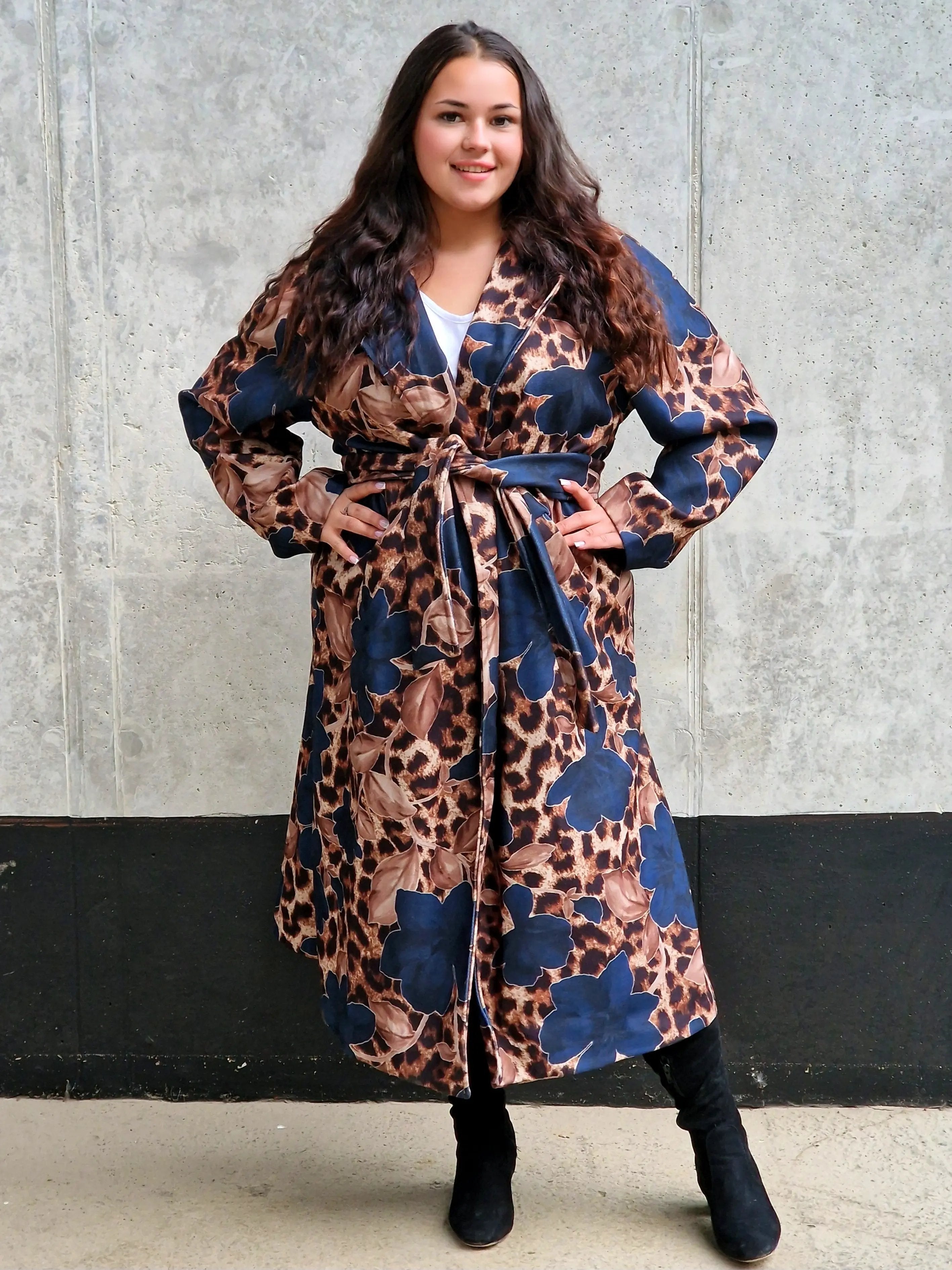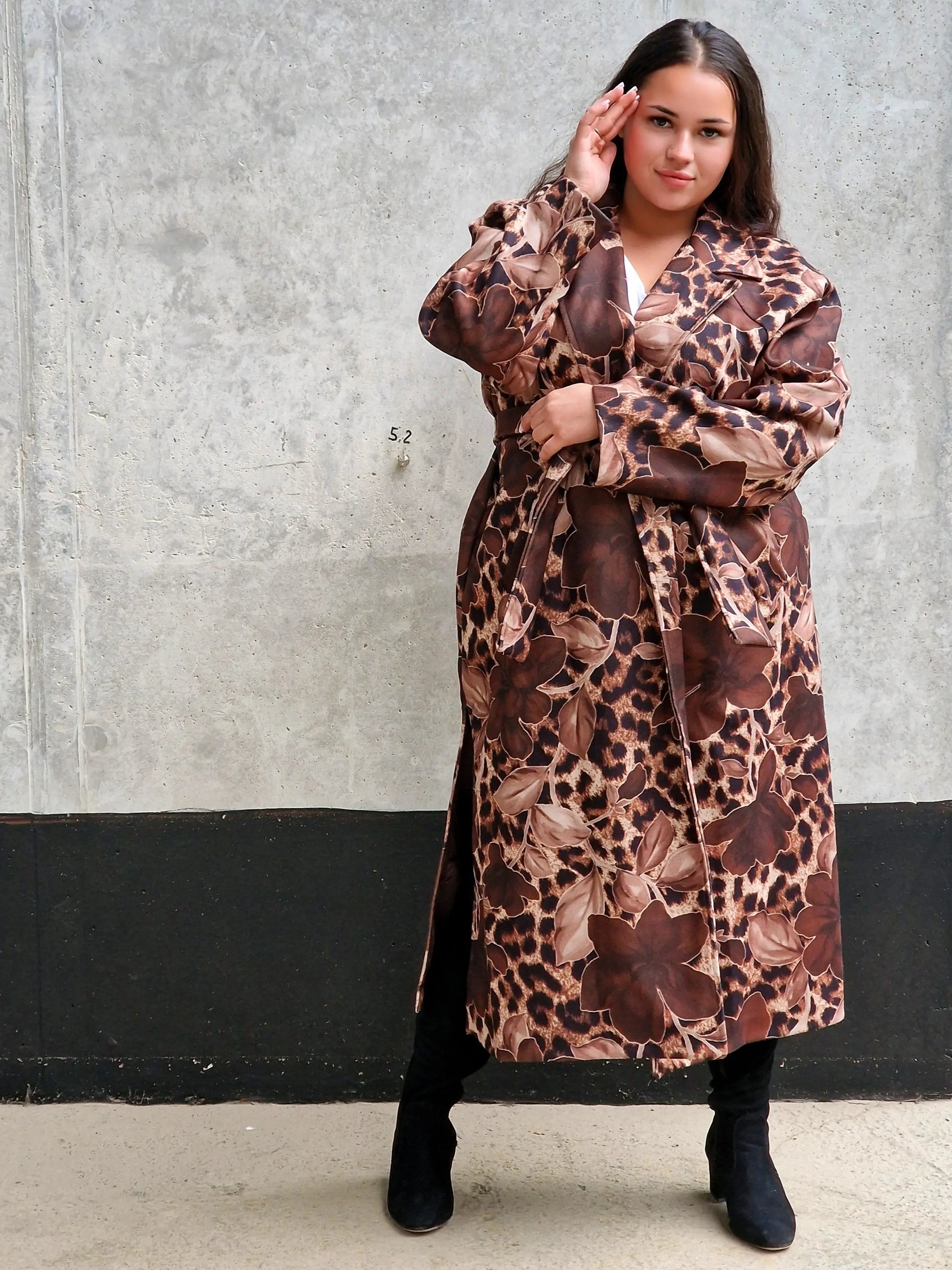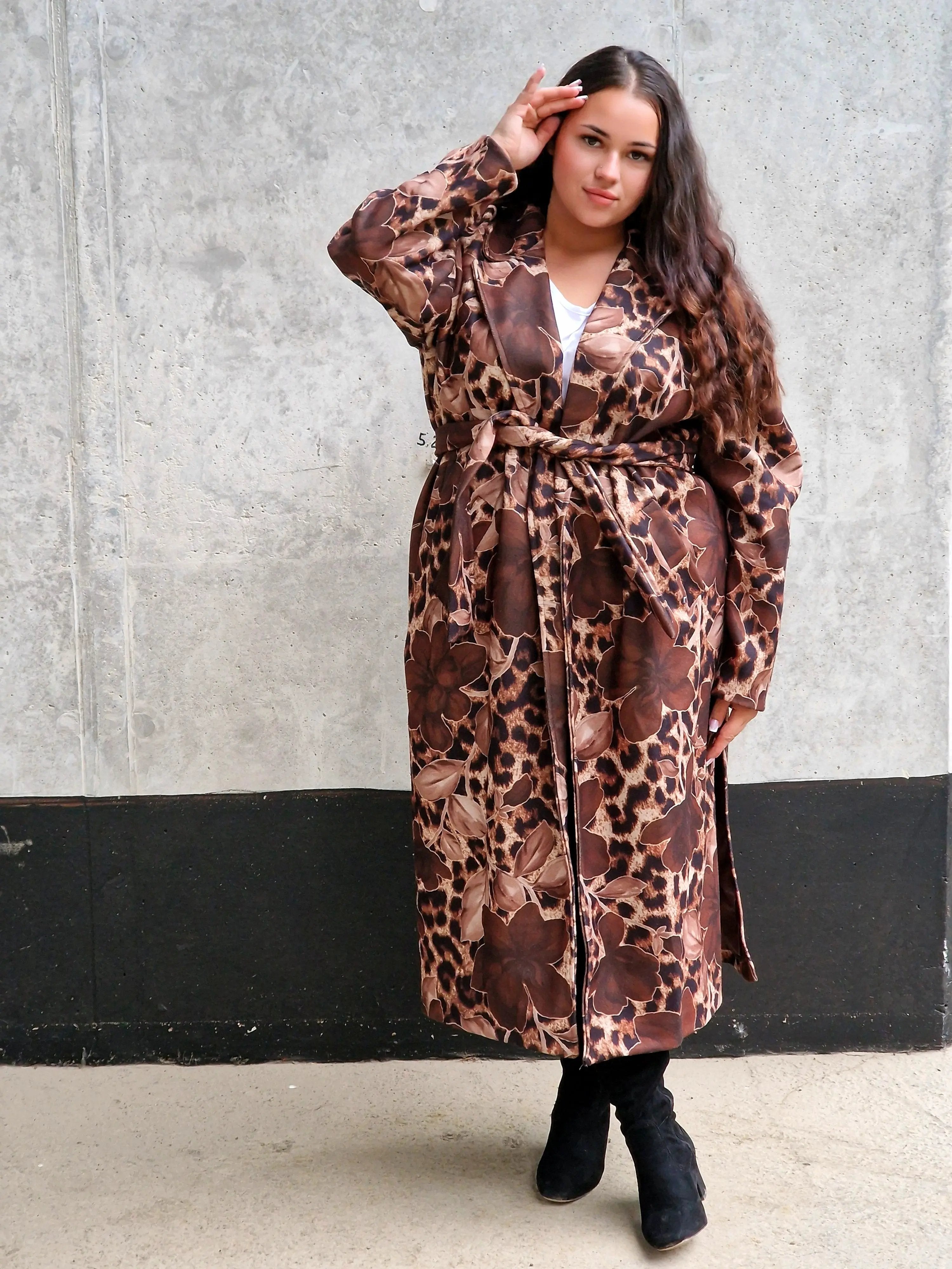 Przyciągnij uwagę wyjątkowym płaszczem, który łączy w sobie dwa wyraziste wzory: klasyczną panterkę i kwiatowy motyw. Ten niezwykły model to idealny wybór dla kobiet, które lubią eksperymentować z modą i wyrażać swoją osobowość. Płaszcz ma prosty krój z wiązaniem w talii, co podkreśla sylwetkę, a szerokie mankiety i wyrazisty kołnierz dodają elegancji. Zrównoważenie dzikiego wzoru panterki z delikatnymi kwiatami tworzy unikalną stylizację, która będzie wyróżniać Cię na każdym kroku.