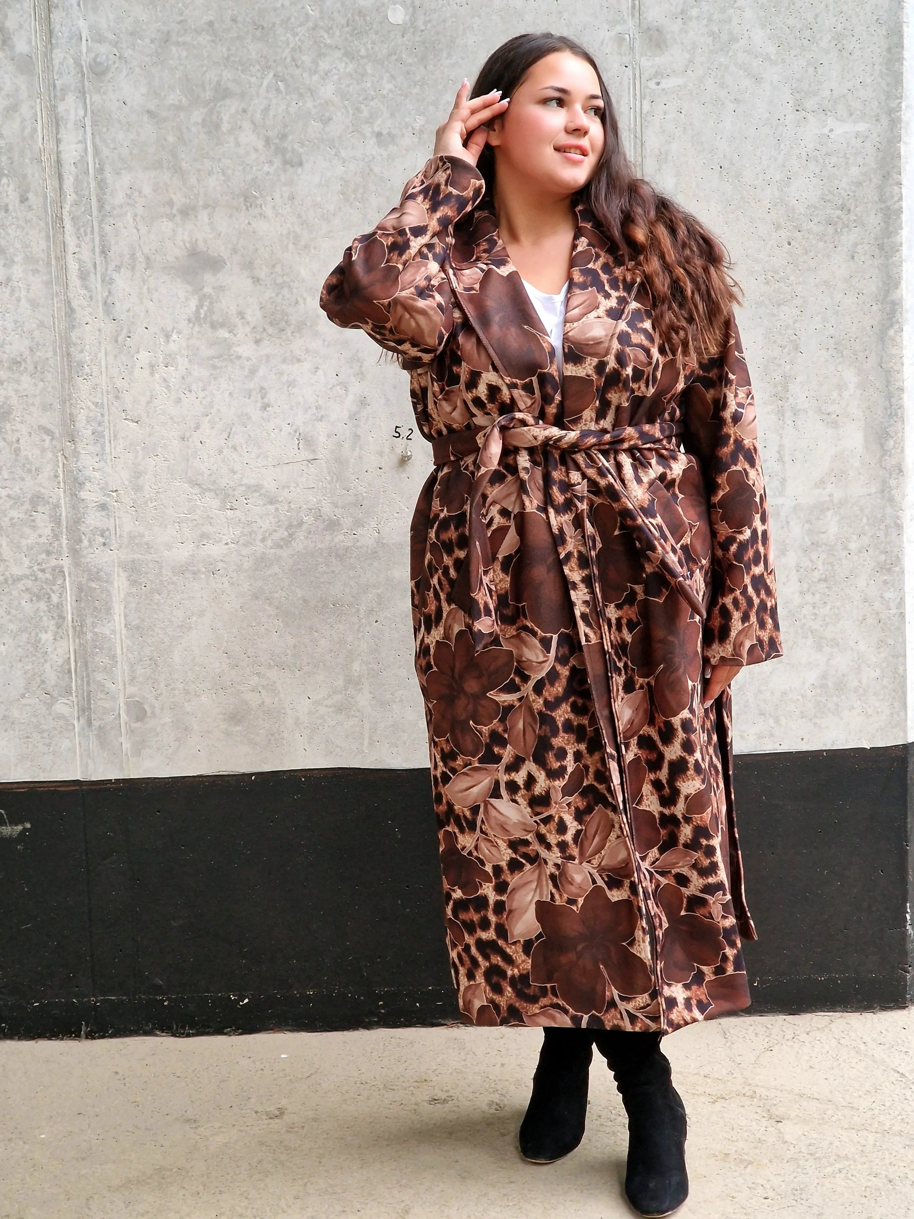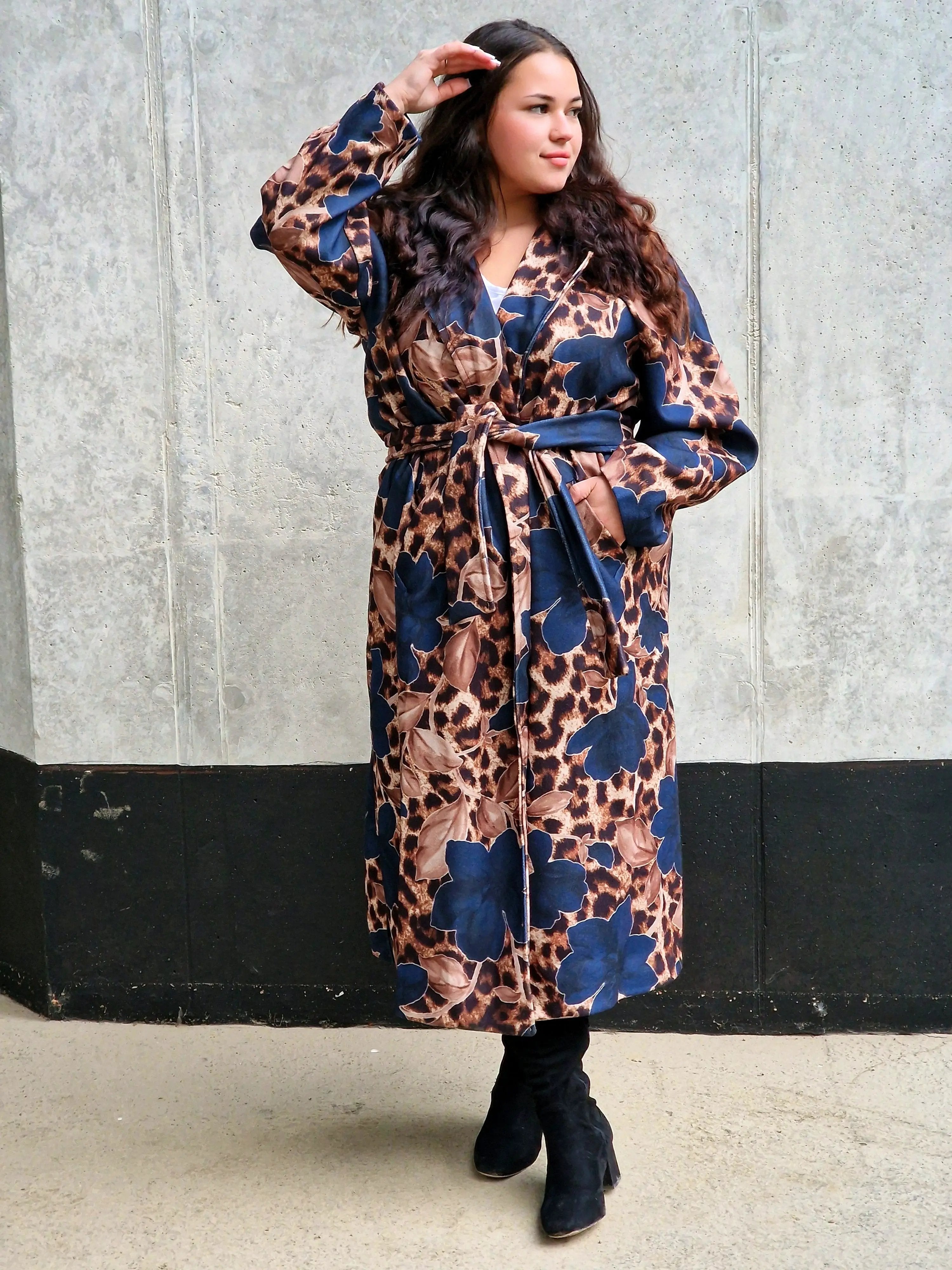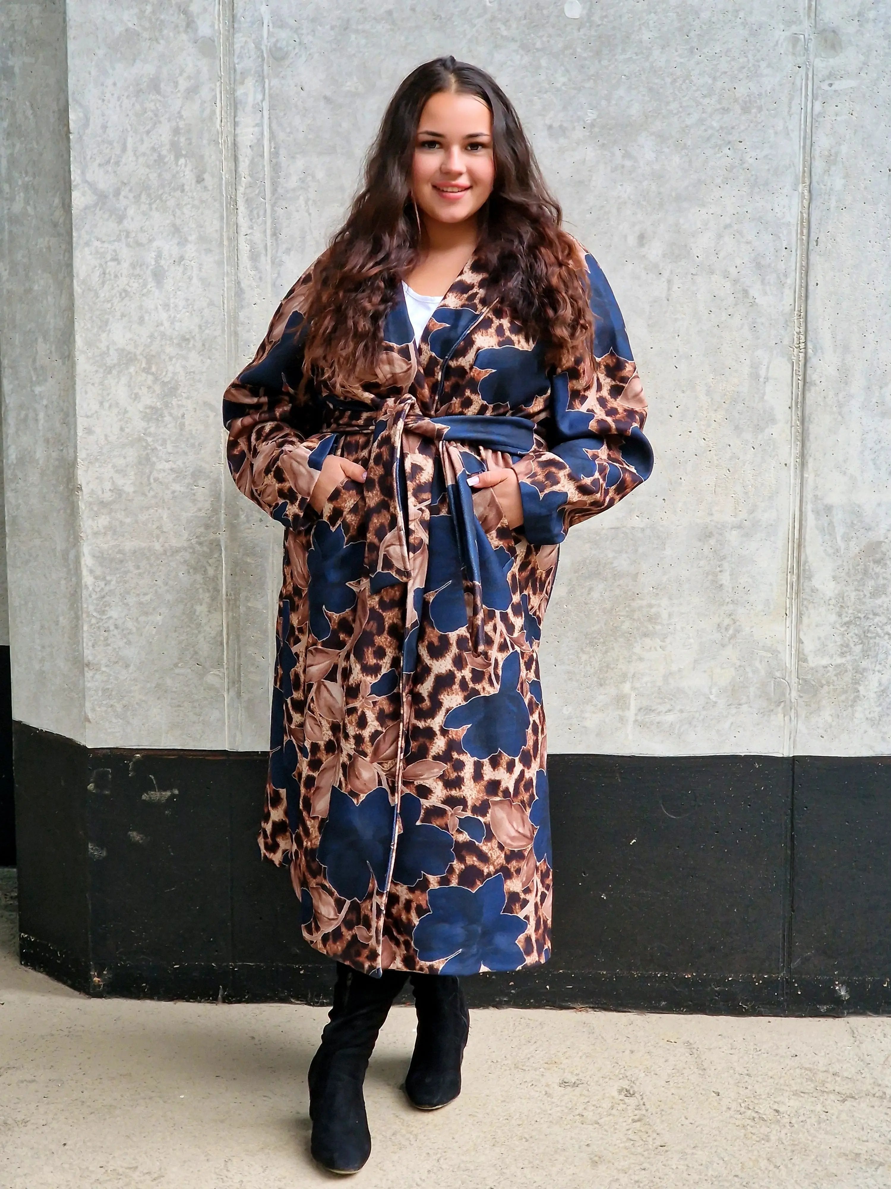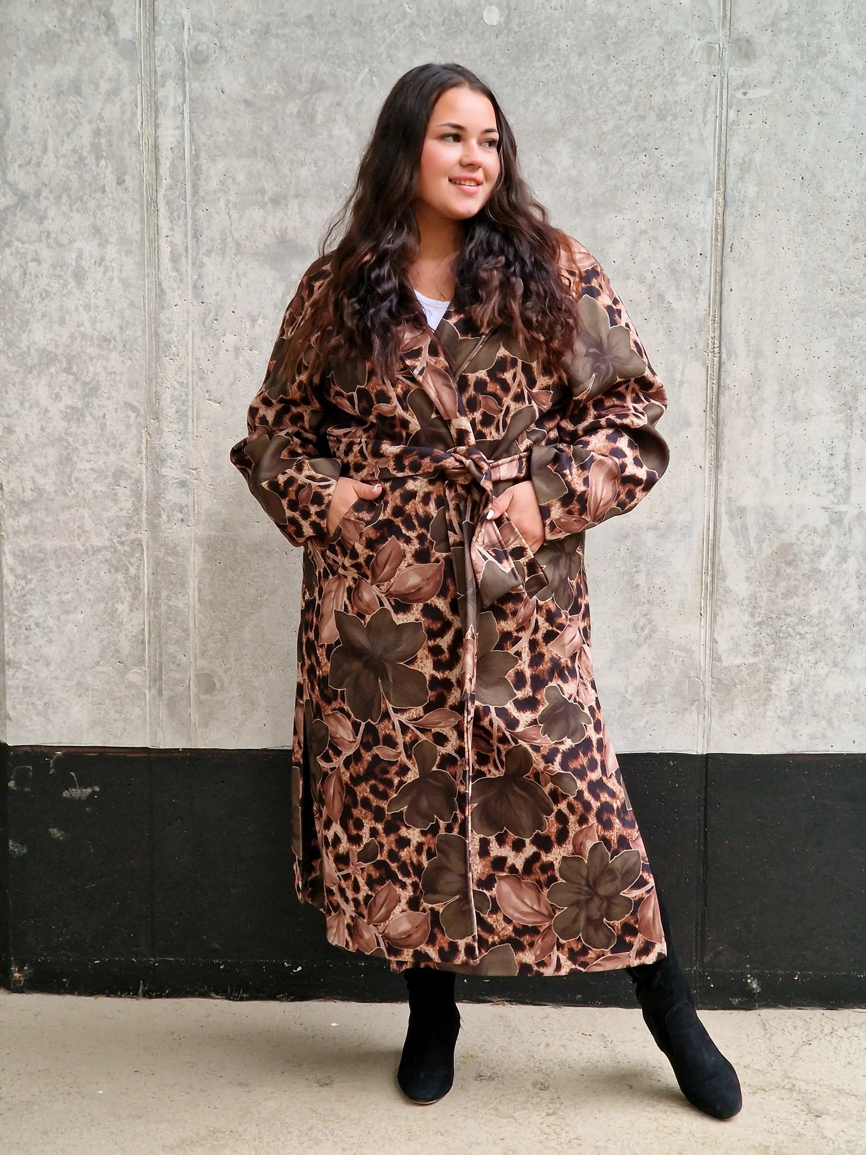 Przyciągnij uwagę wyjątkowym płaszczem, który łączy w sobie dwa wyraziste wzory: klasyczną panterkę i kwiatowy motyw. Ten niezwykły model to idealny wybór dla kobiet, które lubią eksperymentować z modą i wyrażać swoją osobowość. Płaszcz ma prosty krój z wiązaniem w talii, co podkreśla sylwetkę, a szerokie mankiety i wyrazisty kołnierz dodają elegancji. Zrównoważenie dzikiego wzoru panterki z delikatnymi kwiatami tworzy unikalną stylizację, która będzie wyróżniać Cię na każdym kroku.