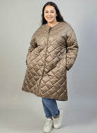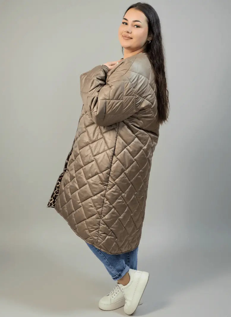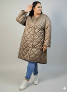 Płaszcz pikowany plus size karmelowy z przeszyciami – długi, lekki, XXL