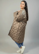 Płaszcz posiada klasyczne pikowanie w romby, które optycznie wysmukla sylwetkę. Zapinany na napy, z praktycznymi kieszeniami po bokach, świetnie sprawdzi się jako okrycie wierzchnie na wiosnę, jesień oraz cieplejsze zimowe dni. Dłuższy tył dodatkowo chroni przed chłodem i nadaje całości nowoczesnego charakteru.