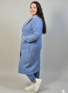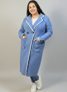 Płaszcz plus size boucle niebieski – elegancki z kontrastowym wykończeniem