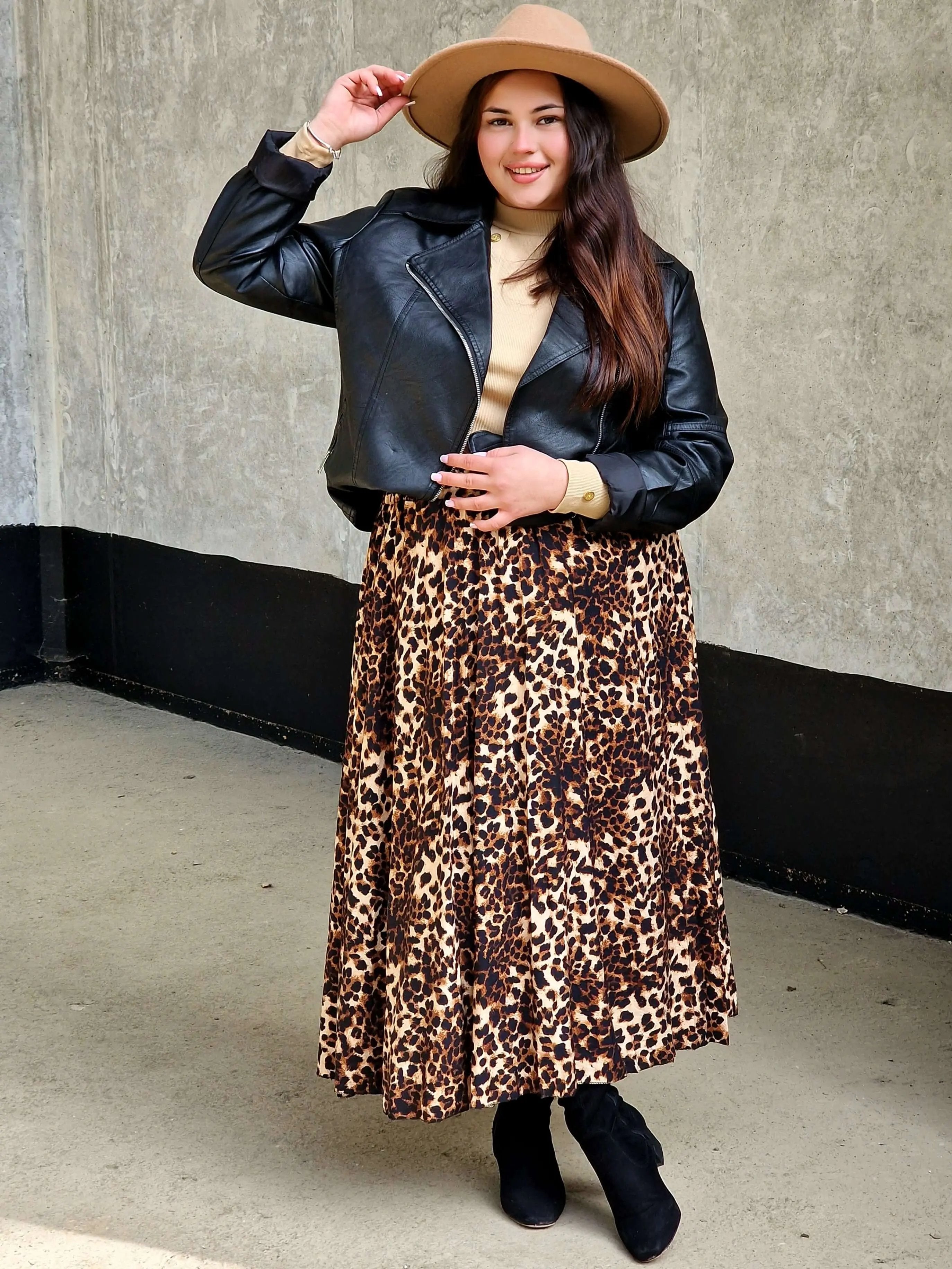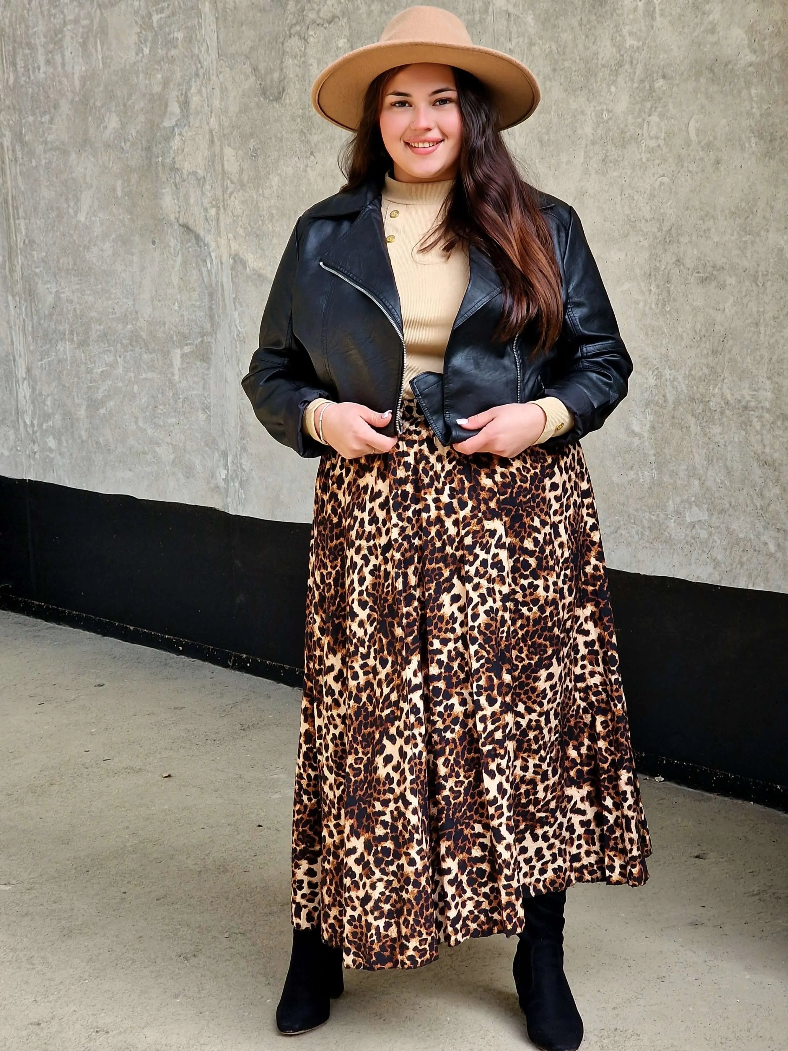 Wyjątkowa spódnica midi w ponadczasowy wzór panterki to must-have dla każdej kobiety, która pragnie wyróżniać się z tłumu, zachowując przy tym elegancję i klasę. Uszyta z lekkiego, płynnie układającego się materiału, subtelnie podkreśla sylwetkę, dodając jej lekkości i dynamizmu. Nasycone, ciepłe odcienie brązu i beżu w połączeniu z wyrazistym printem tworzą niepowtarzalną kompozycję, która idealnie wpisuje się w aktualne trendy. Spódnica ma długość midi, co sprawia, że jest niezwykle uniwersalna – możesz ją nosić zarówno do pracy, na spotkania towarzyskie, jak i na wieczorne wyjścia. Elastyczny pas w talii zapewnia komfort noszenia i doskonałe dopasowanie do sylwetki. Połącz ją z prostym topem lub elegancką bluzką, aby stworzyć stylizację, która zachwyci swoim wyrafinowanym, a jednocześnie drapieżnym charakterem. To spódnica, która dodaje pewności siebie i podkreśla indywidualny styl każdej kobiety.
