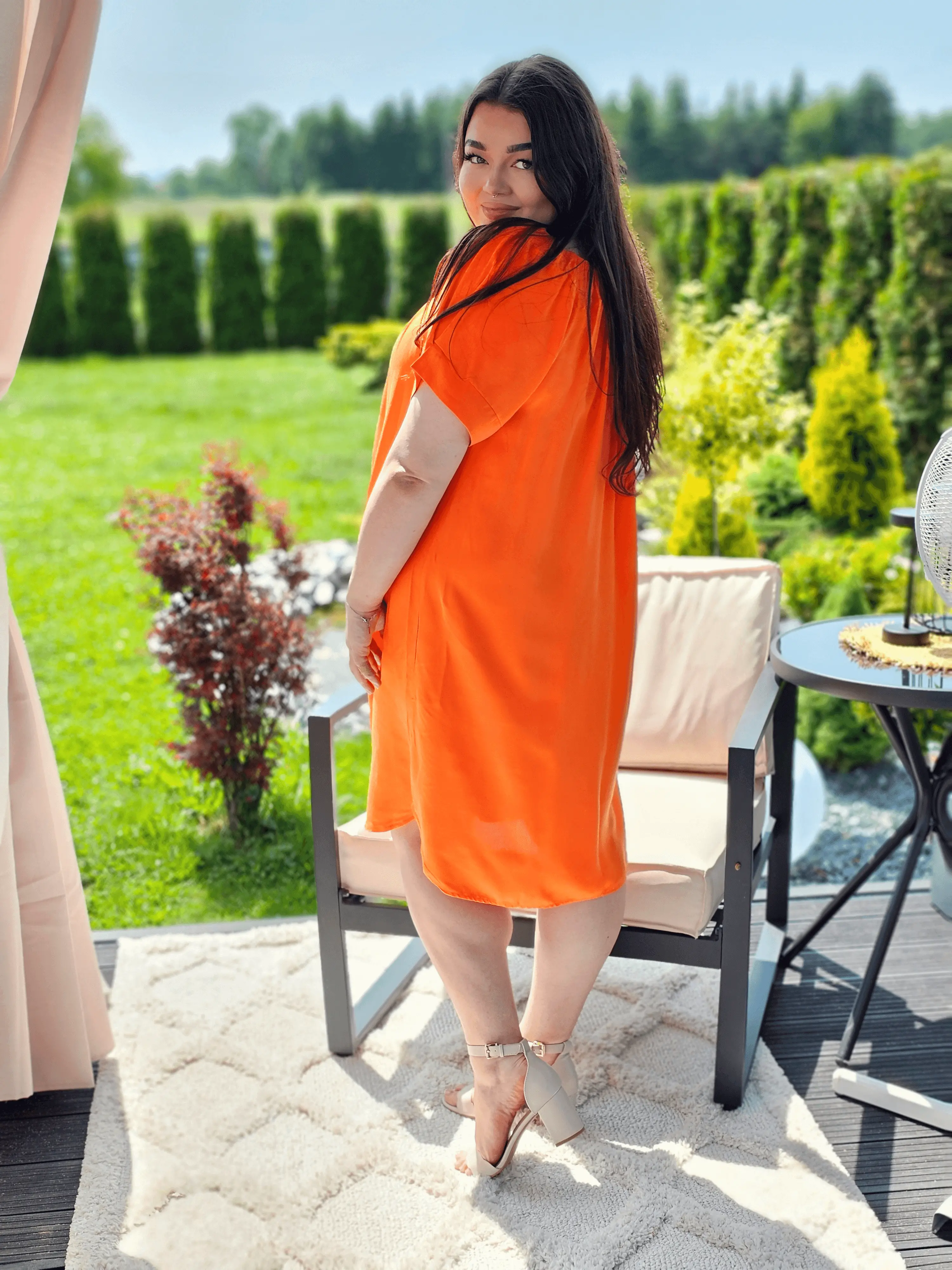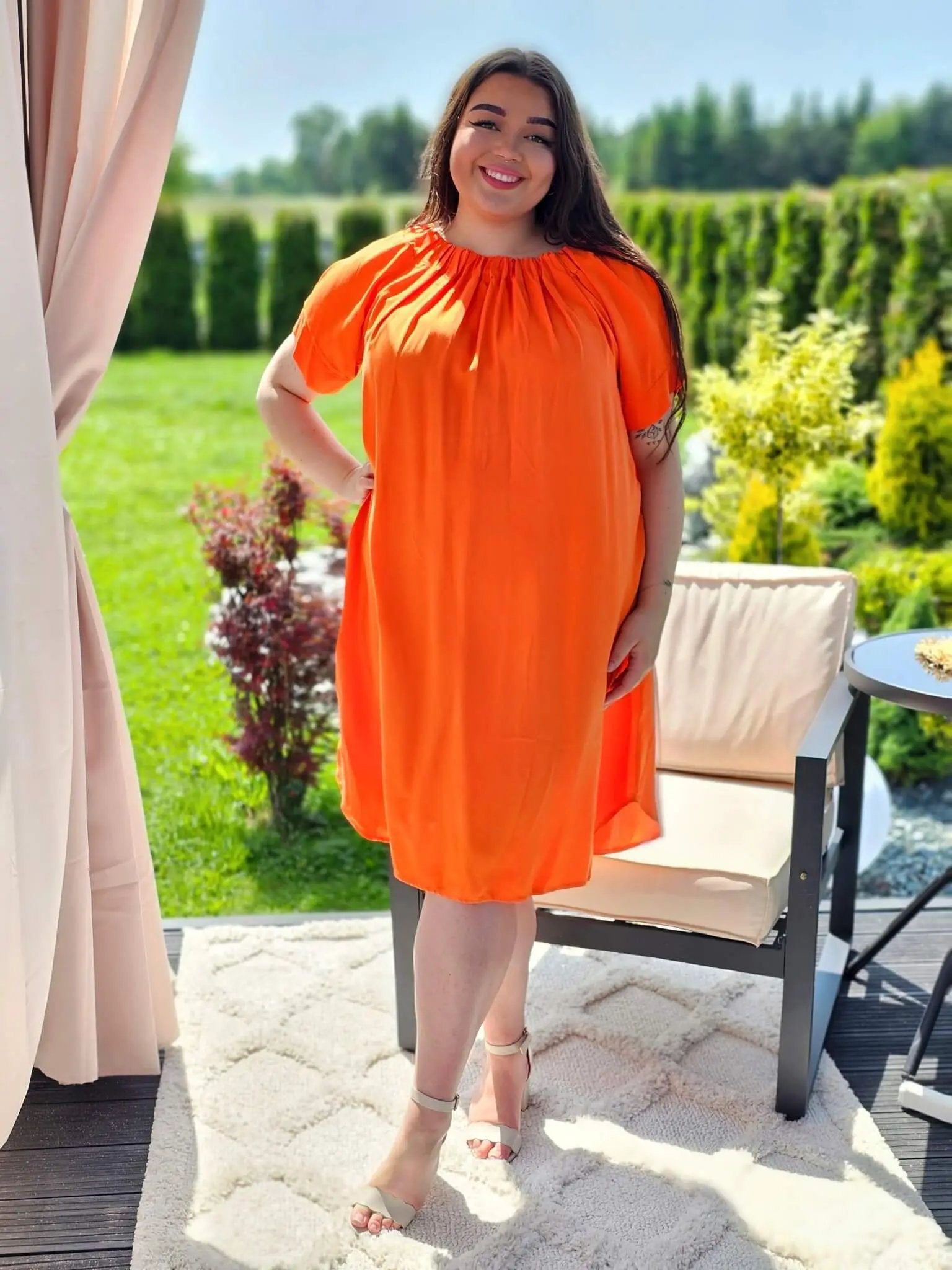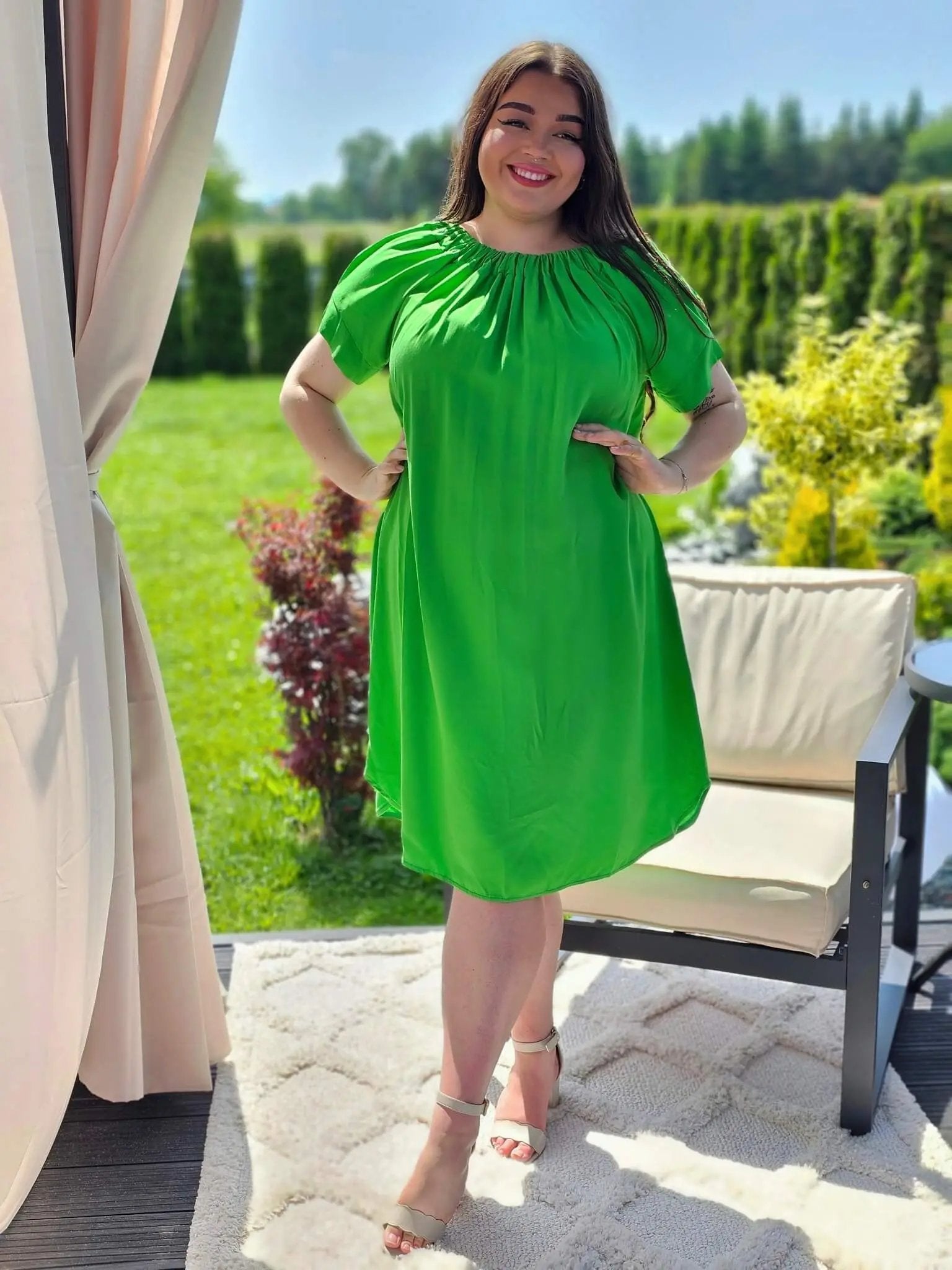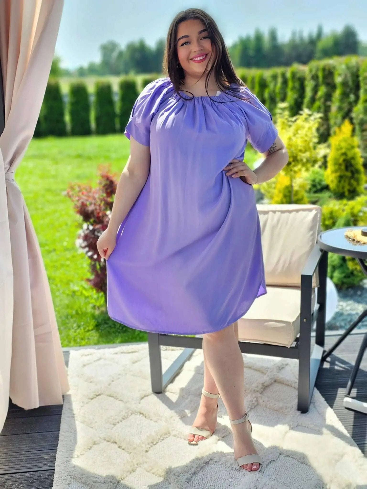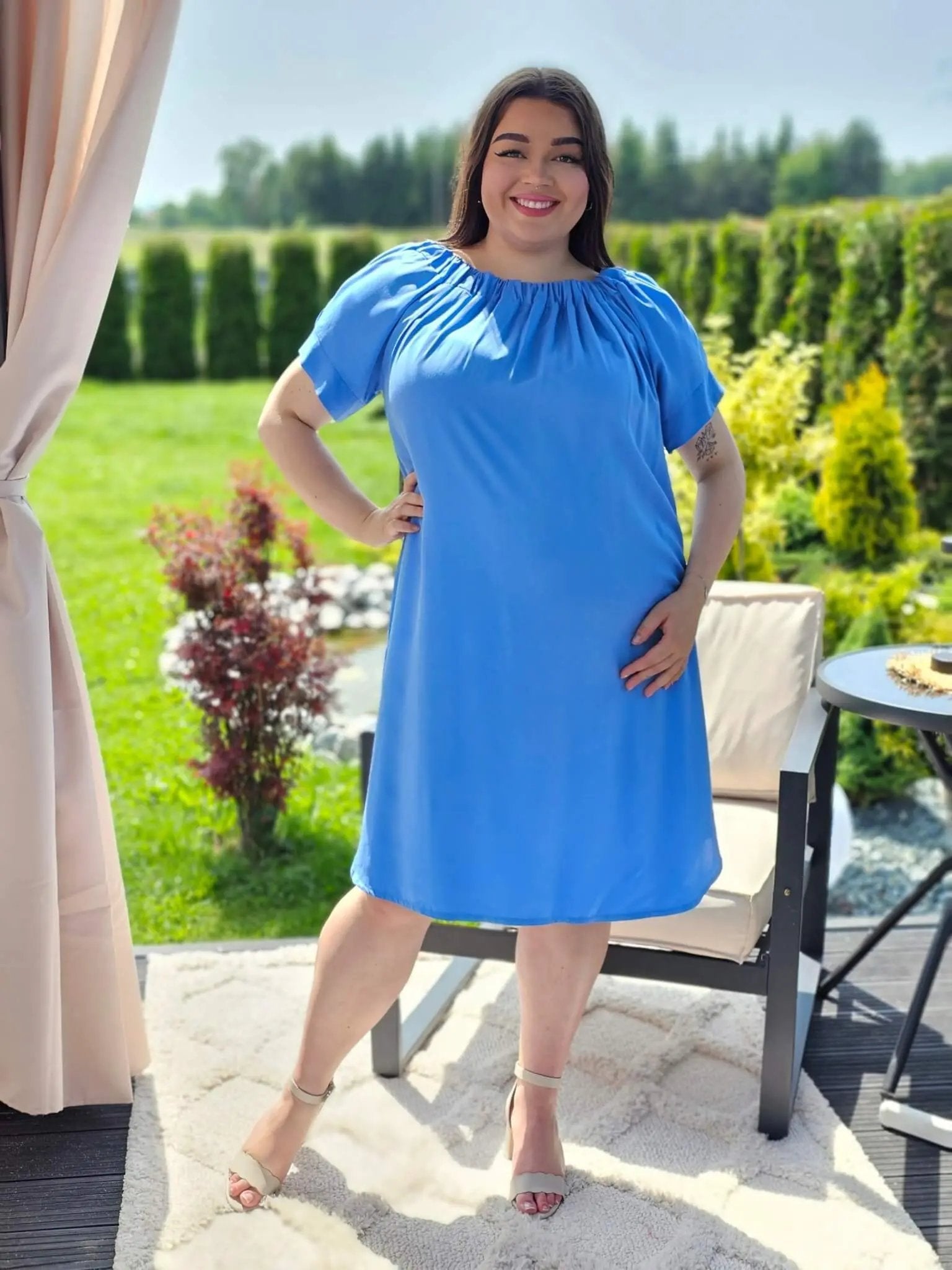 Sukienka hiszpanka to model, który zyskuje coraz większą popularność w modowych trendach. Sukienka jest okrągła w dekolcie, którego obręb wykończony jest gumką, dzięki czemu sukienka lepiej przylega do ciała. Ma krótkie rękawy, co sprawia, że jest to świetny wybór na ciepłe dni. Dolna część sukienki zaokrąglona jest, co dodaje kobiecie subtelności i delikatności w ruchu.
