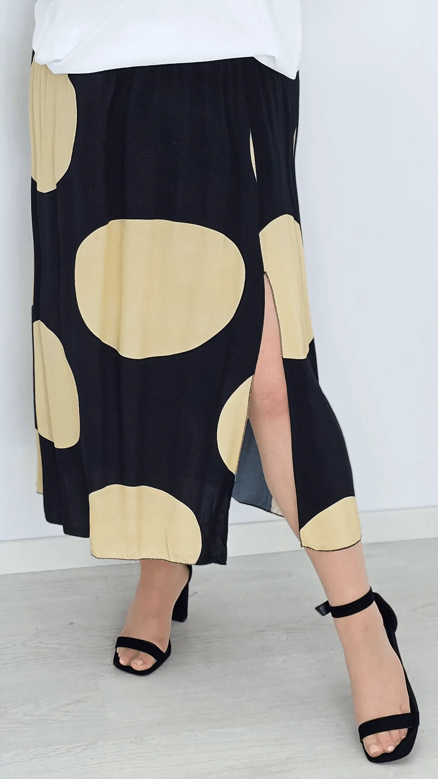 Na przodzie spódnicy znajduje się rozcięcie, co dodaje jej elegancji i pozwala na wygodne poruszanie się. Spódnica ta jest bardzo uniwersalna i nadaje się zarówno na sportowo, jak i na elegancko.