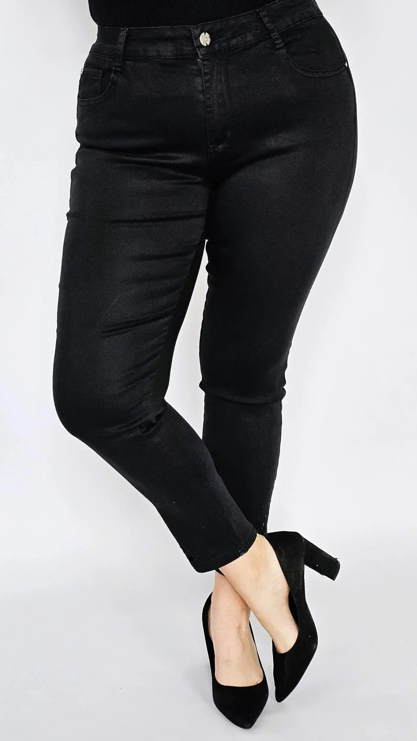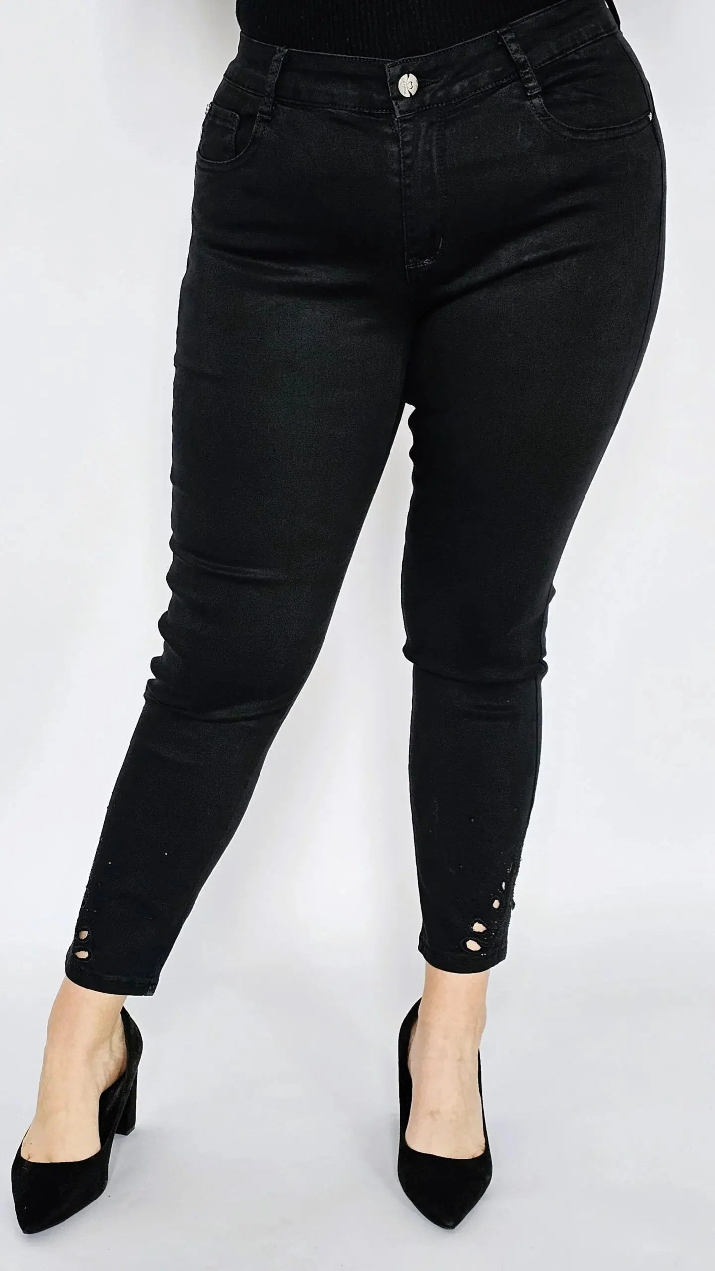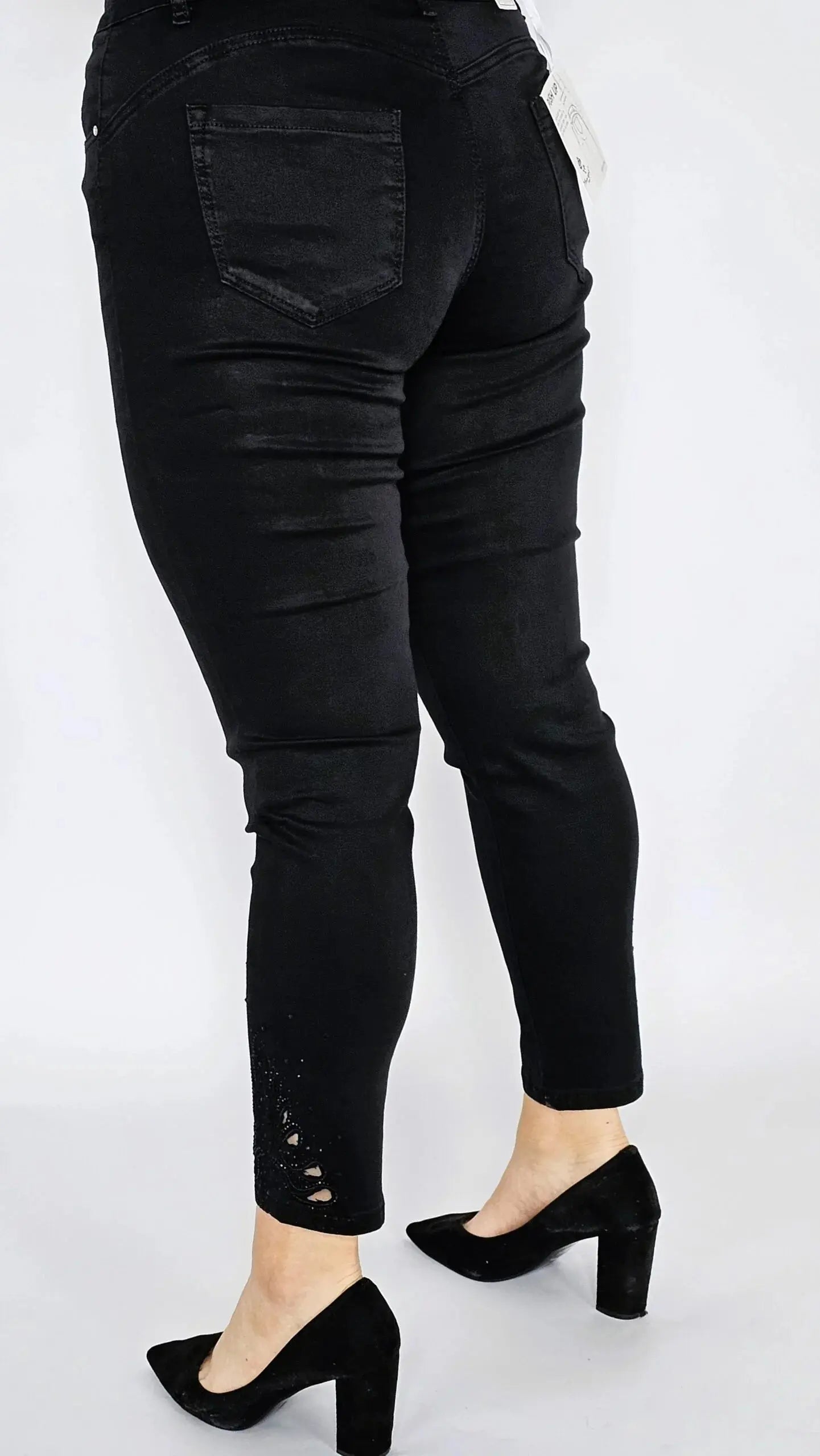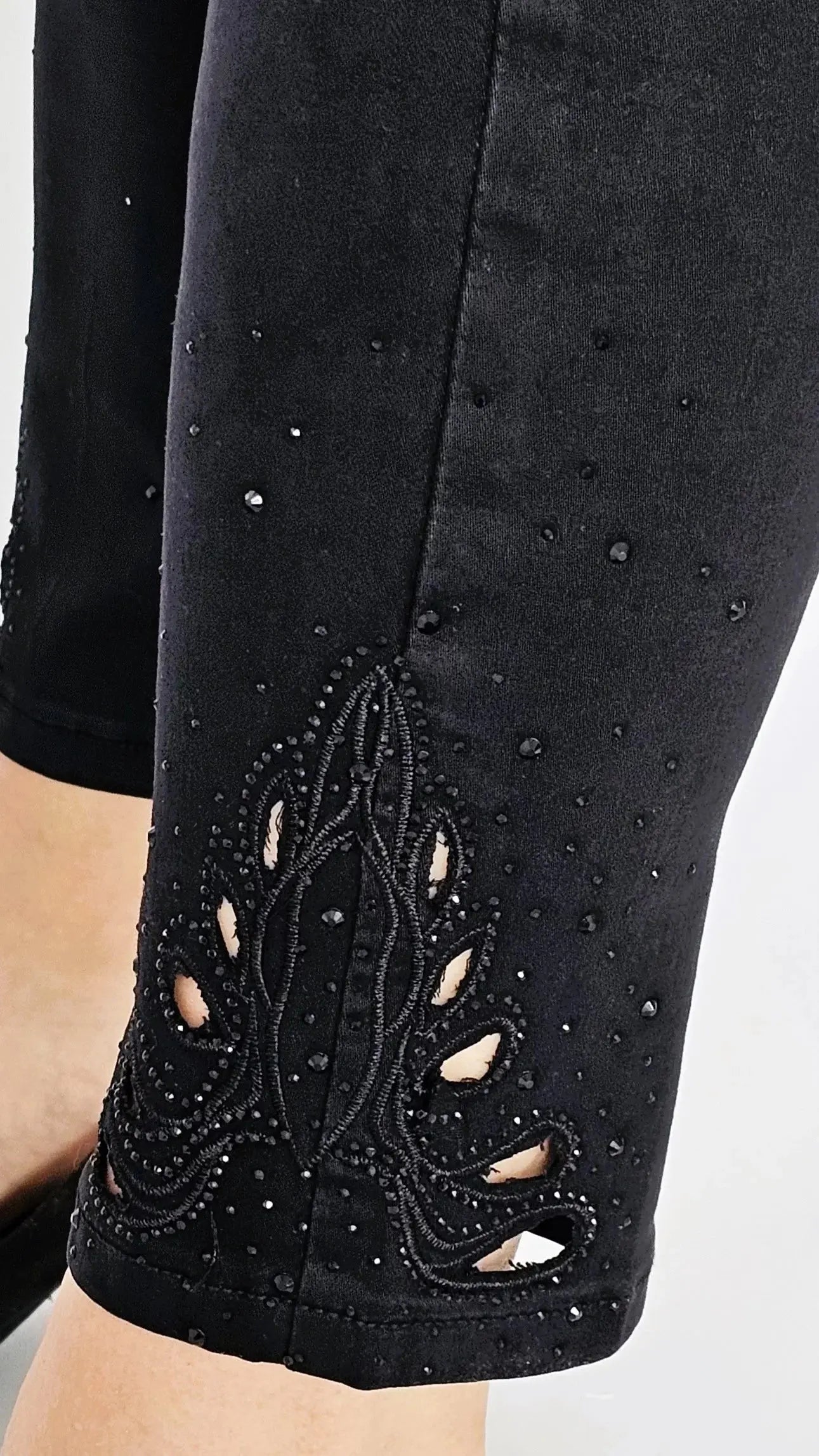 Czarne spodnie z cyrkonii to uroczy i stylowy element garderoby, który łączy klasyczną formę z delikatnymi ozdobami.