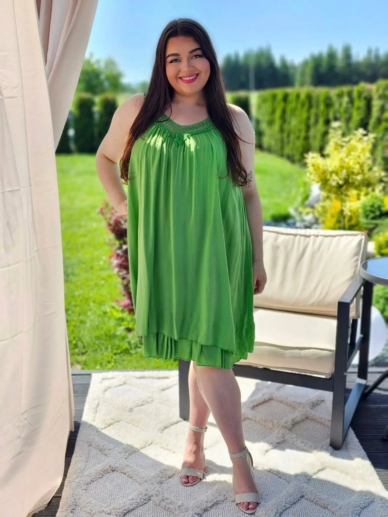 Sukienka posiada delikatne ramiączka, które eksponują ramiona, dodając subtelności i kobiecego uroku. Ramiączka są na tyle grube, aby zapewnić odpowiednie podparcie, jednocześnie pozwalając na swobodne poruszanie się.