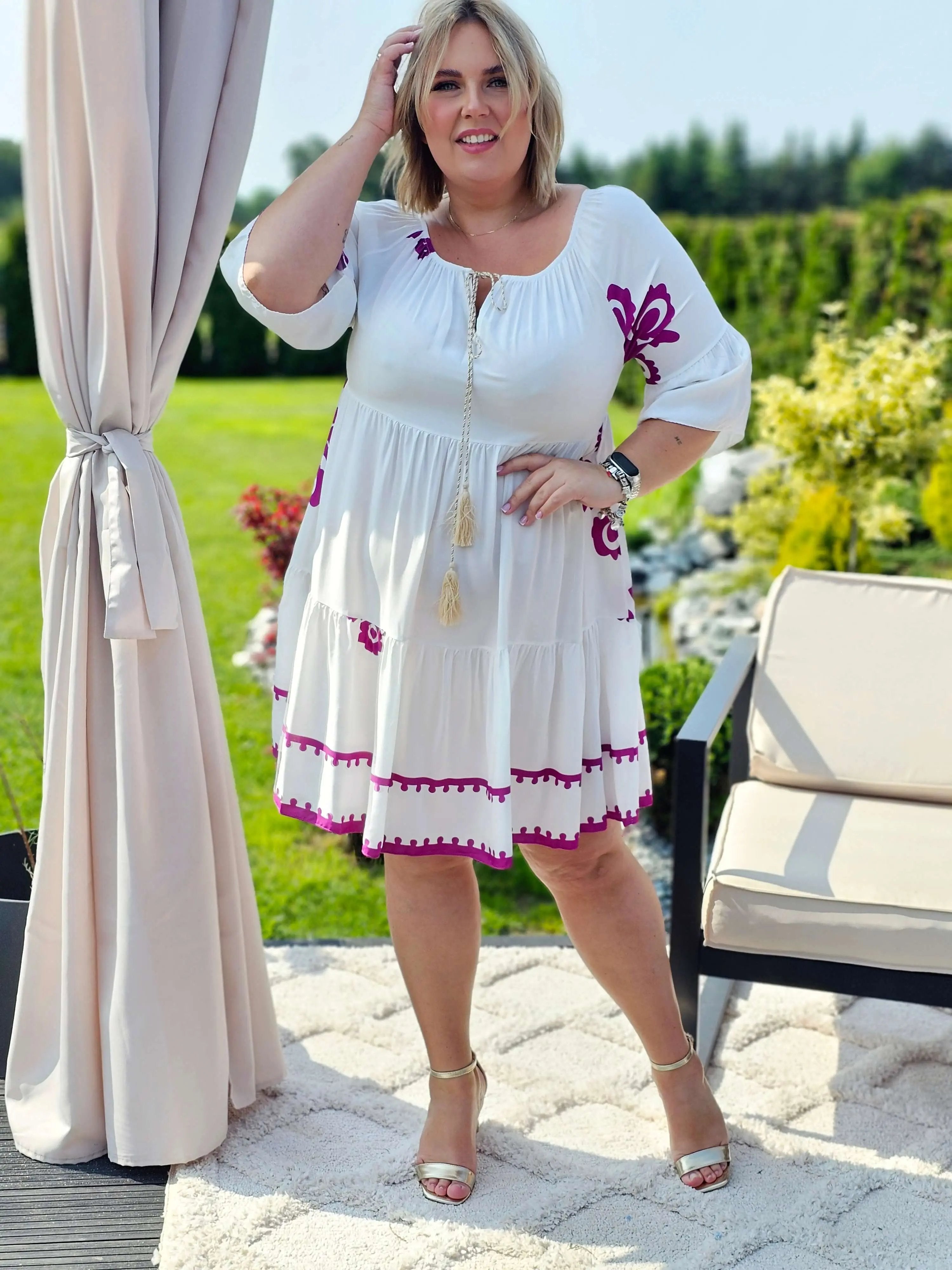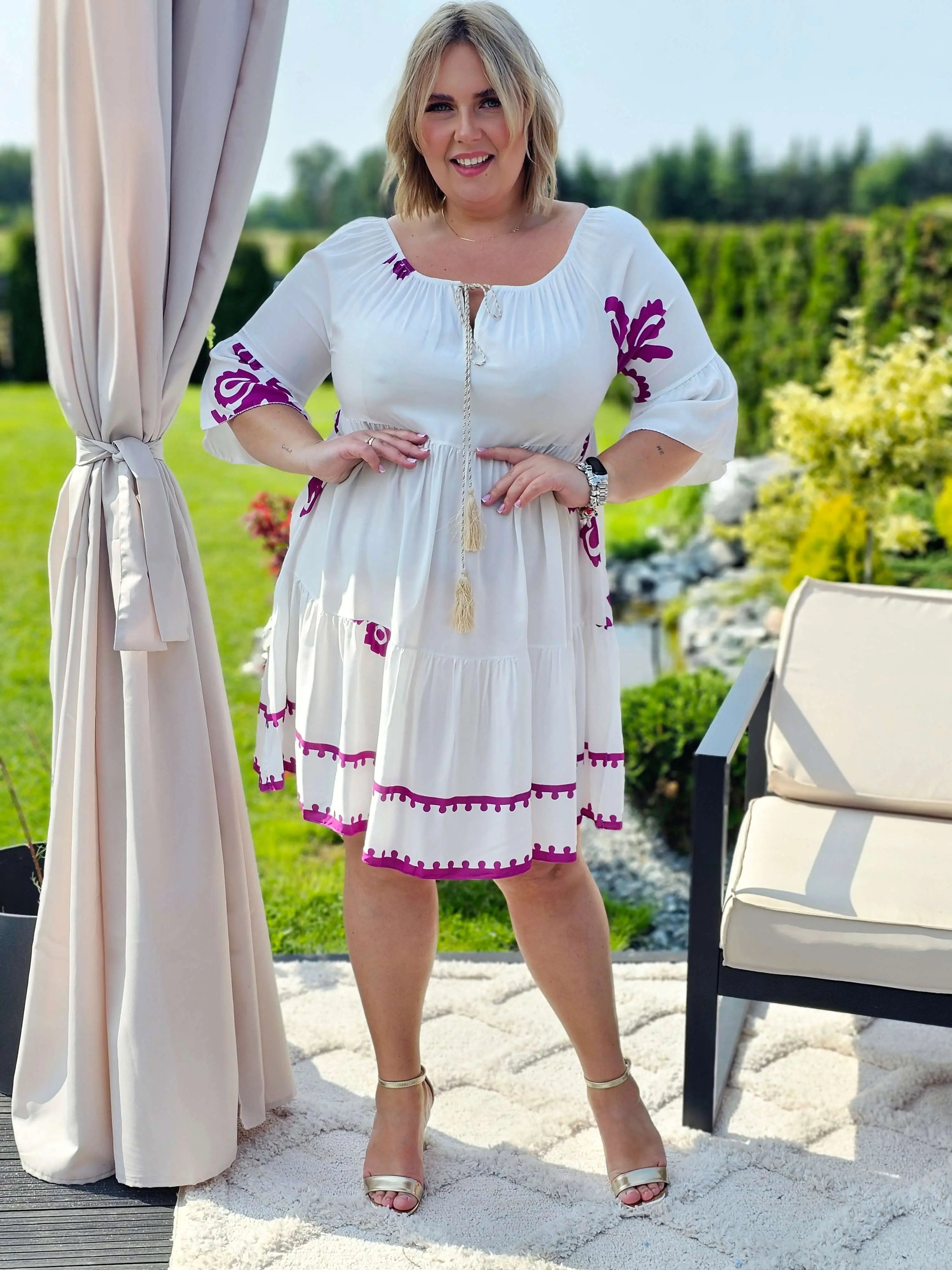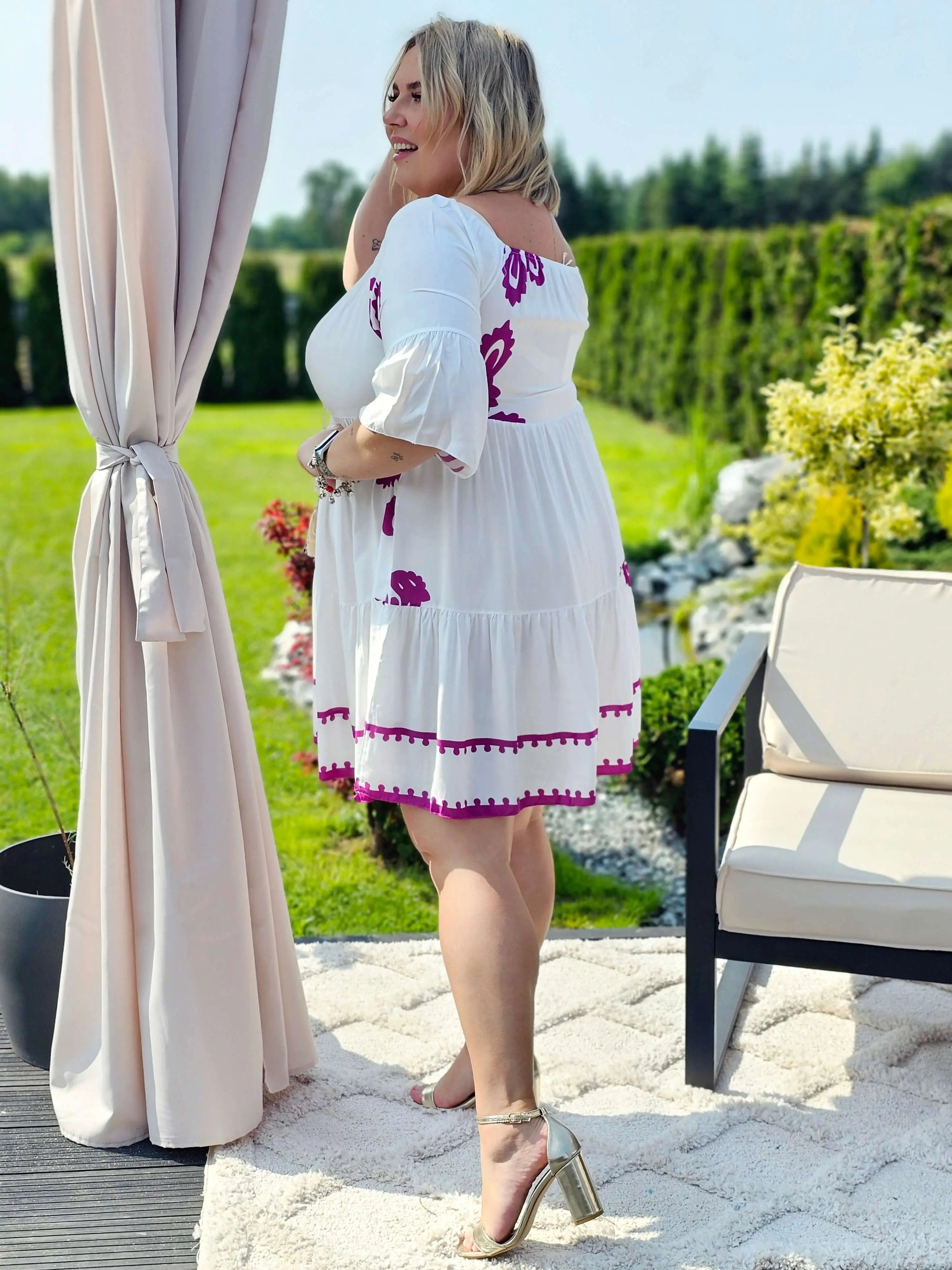 Sukienka ta wykonana jest z miękkiej i przyjemnej w dotyku tkaniny wiskozy, co gwarantuje jej wygodę i komfort podczas noszenia. Jej fason jest lekko rozkloszowany, co sprawia, że pięknie układa się na sylwetce.
