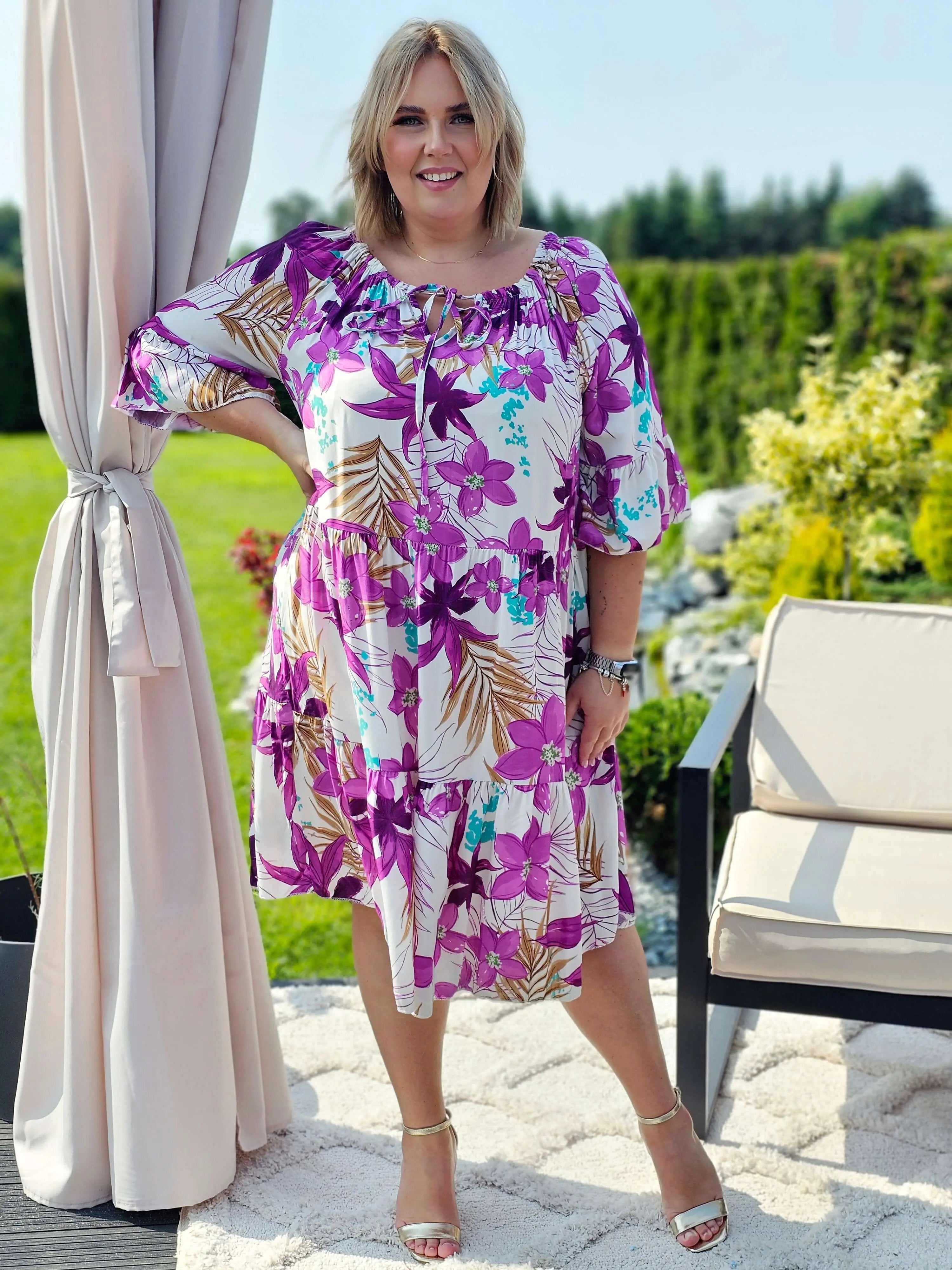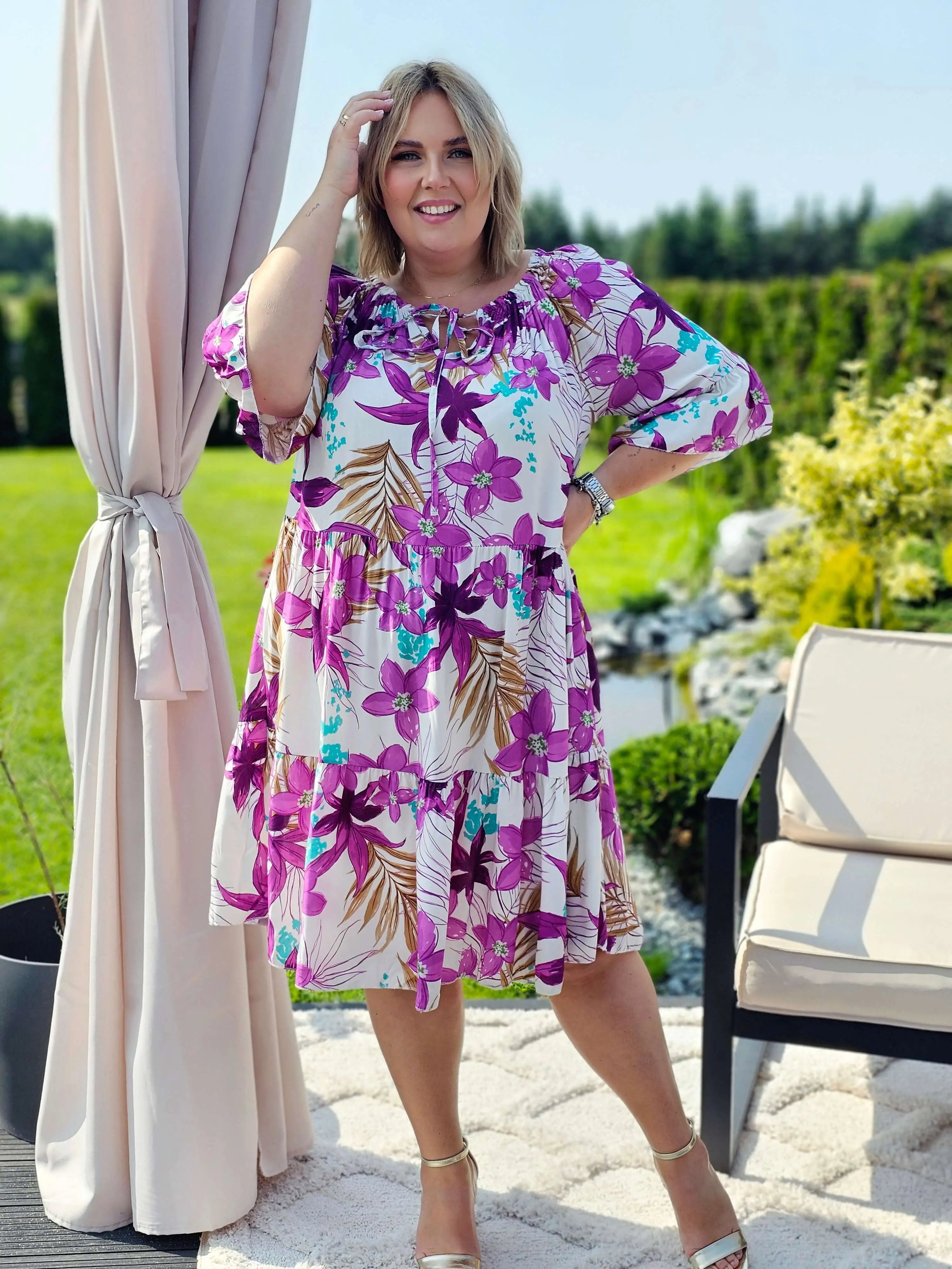 Sukienka wiskozowa z wzorem w kwiaty, ma ona rękaw falbanka oraz dół zakończony falbanką. Wiskoza to materiał, który charakteryzuje się miękkością i lekkością, co sprawia, że sukienka będzie wygodna w noszeniu. Wzór w kwiaty dodaje jej kobiecego i romantycznego wyglądu, a falbanki na rękawach i dole sukienki nadają jej dodatkowego uroku i lekkości, sukienka ma wiązanie przy dekolcie .Całość tworzy efektowną i stylową kreację, idealną na wiele okazji.