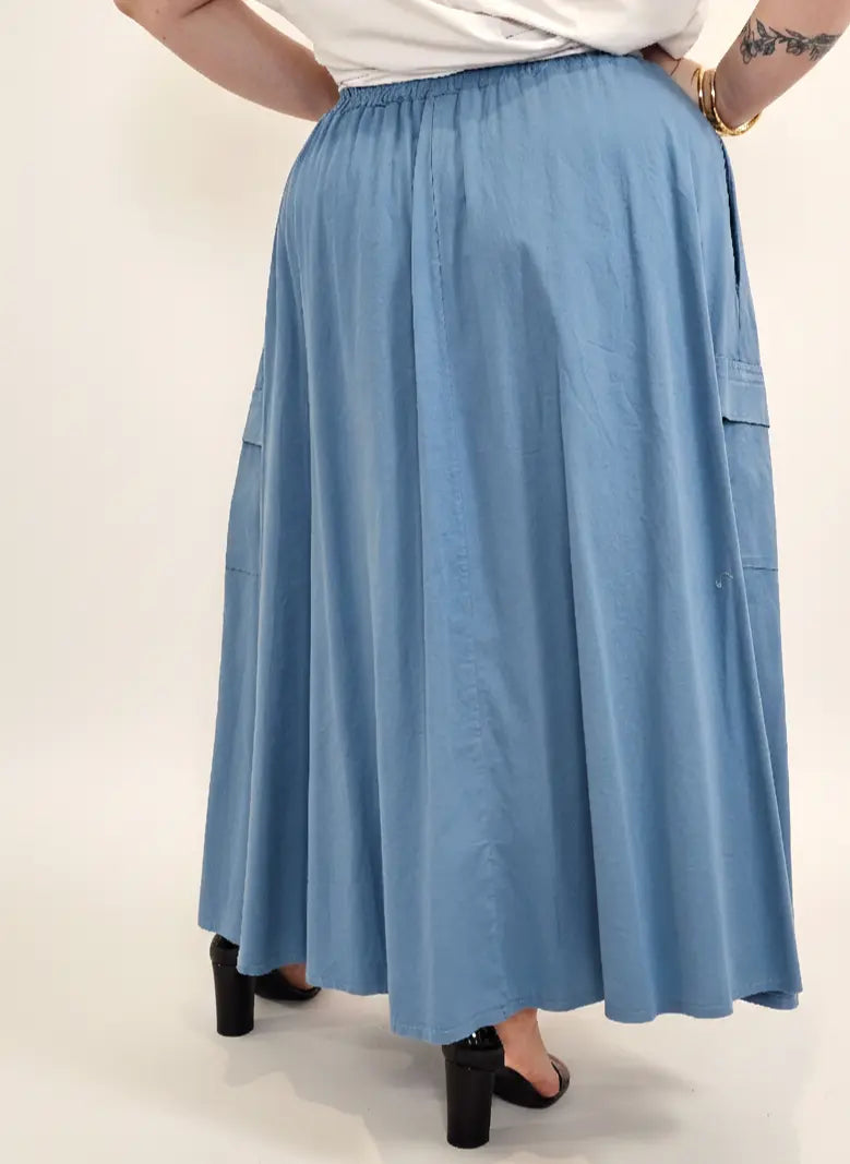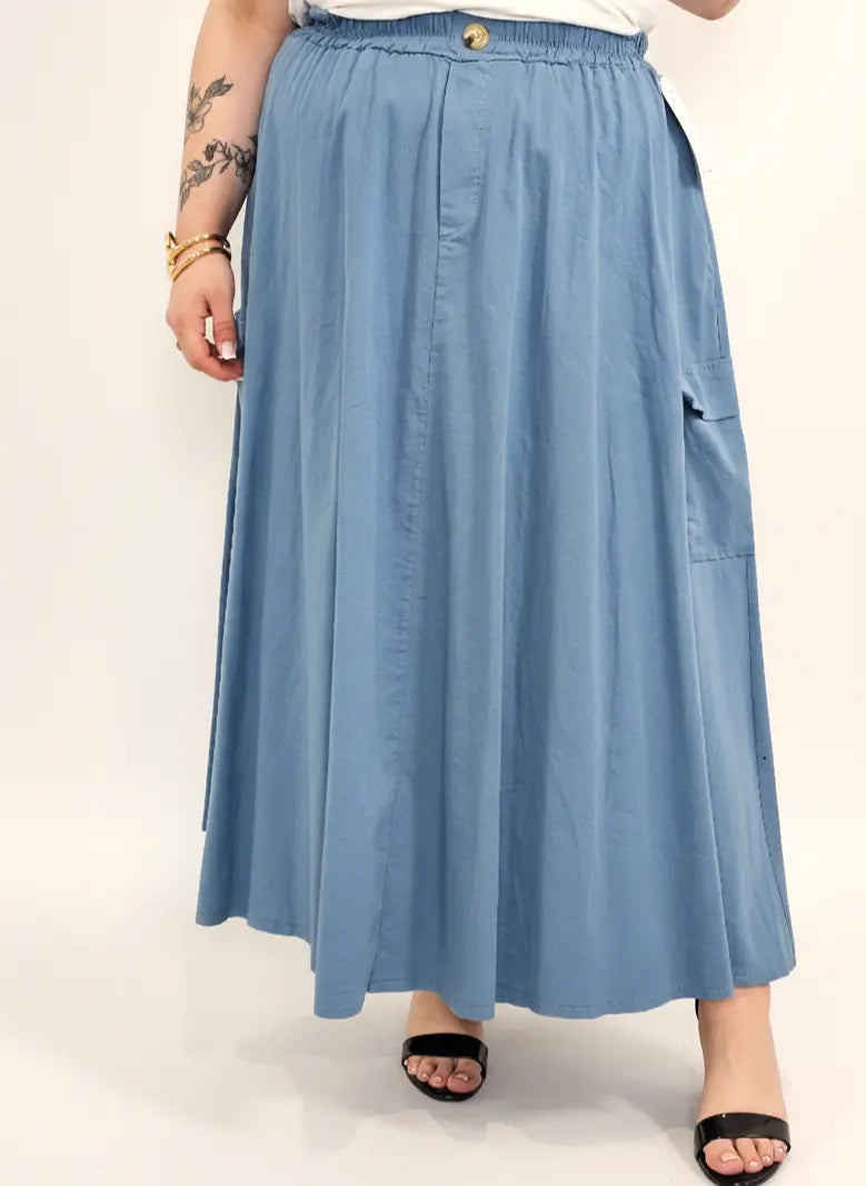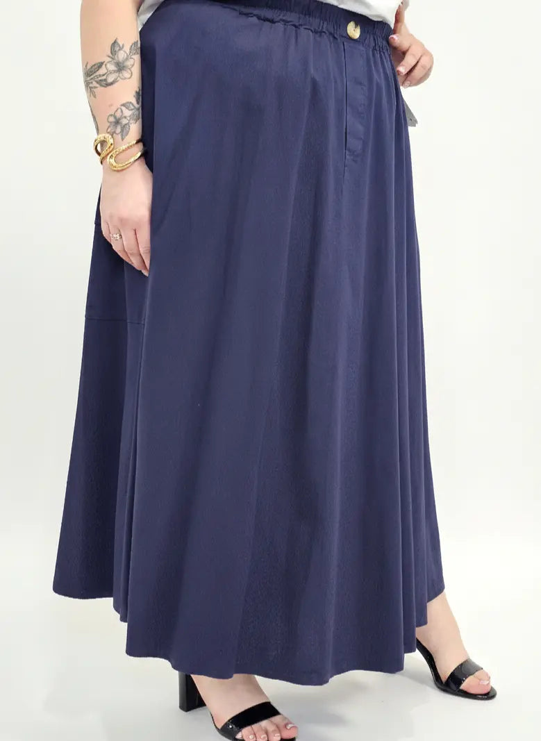 Spódnica plus size to idealny wybór dla kobiet, które cenią swobodę ruchów, komfort noszenia i modny wygląd w stylu XXL. Długa forma pięknie układa się na sylwetce, nadając jej lekkości i harmonijnych proporcji.Spódnica plus size posiada elastyczny pas z gumką oraz ozdobnym guzikiem, co zapewnia doskonałe dopasowanie do talii bez ucisku. Luźny krój sprawia, że model świetnie maskuje biodra i uda, a jednocześnie prezentuje się bardzo kobieco.