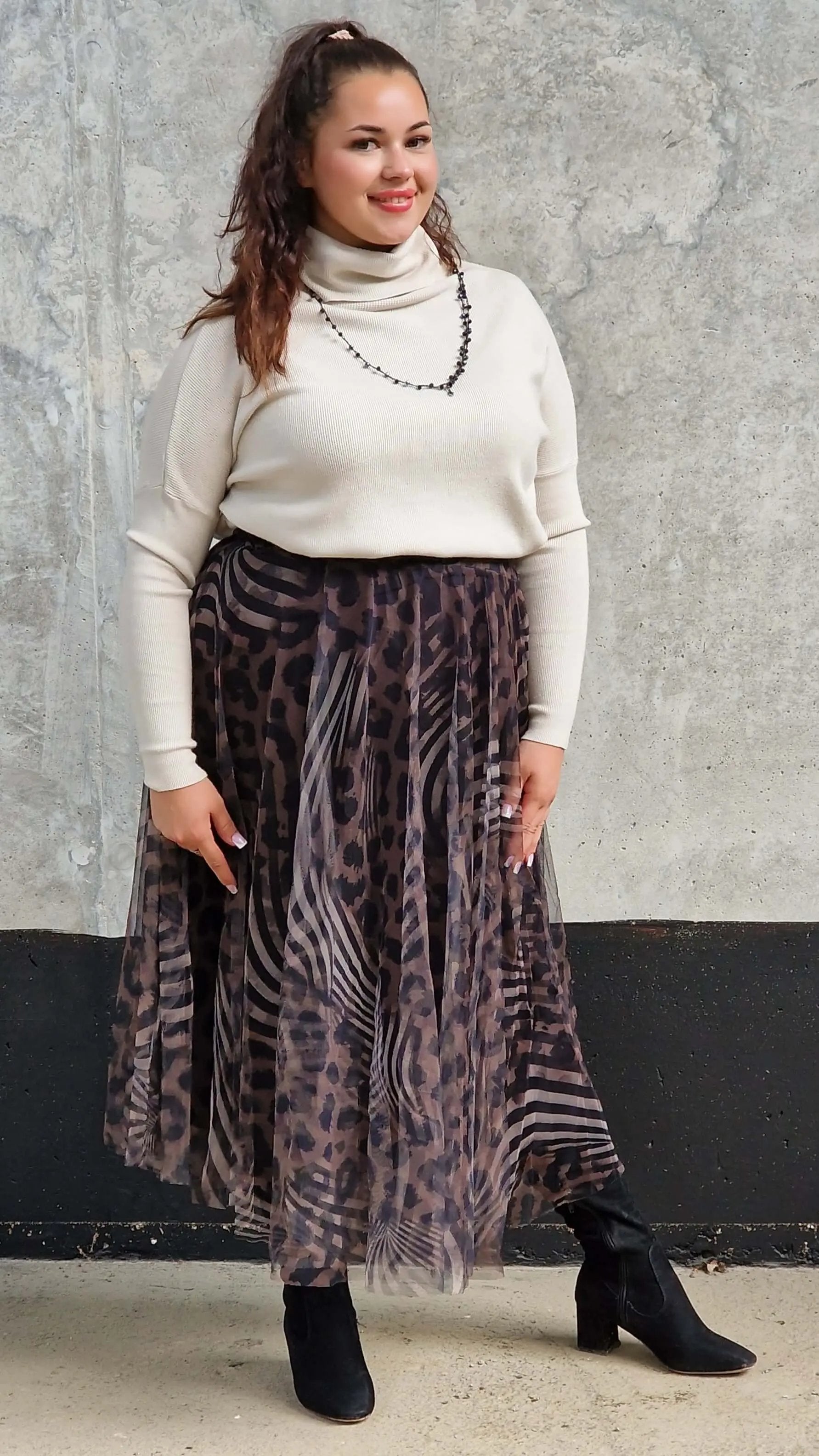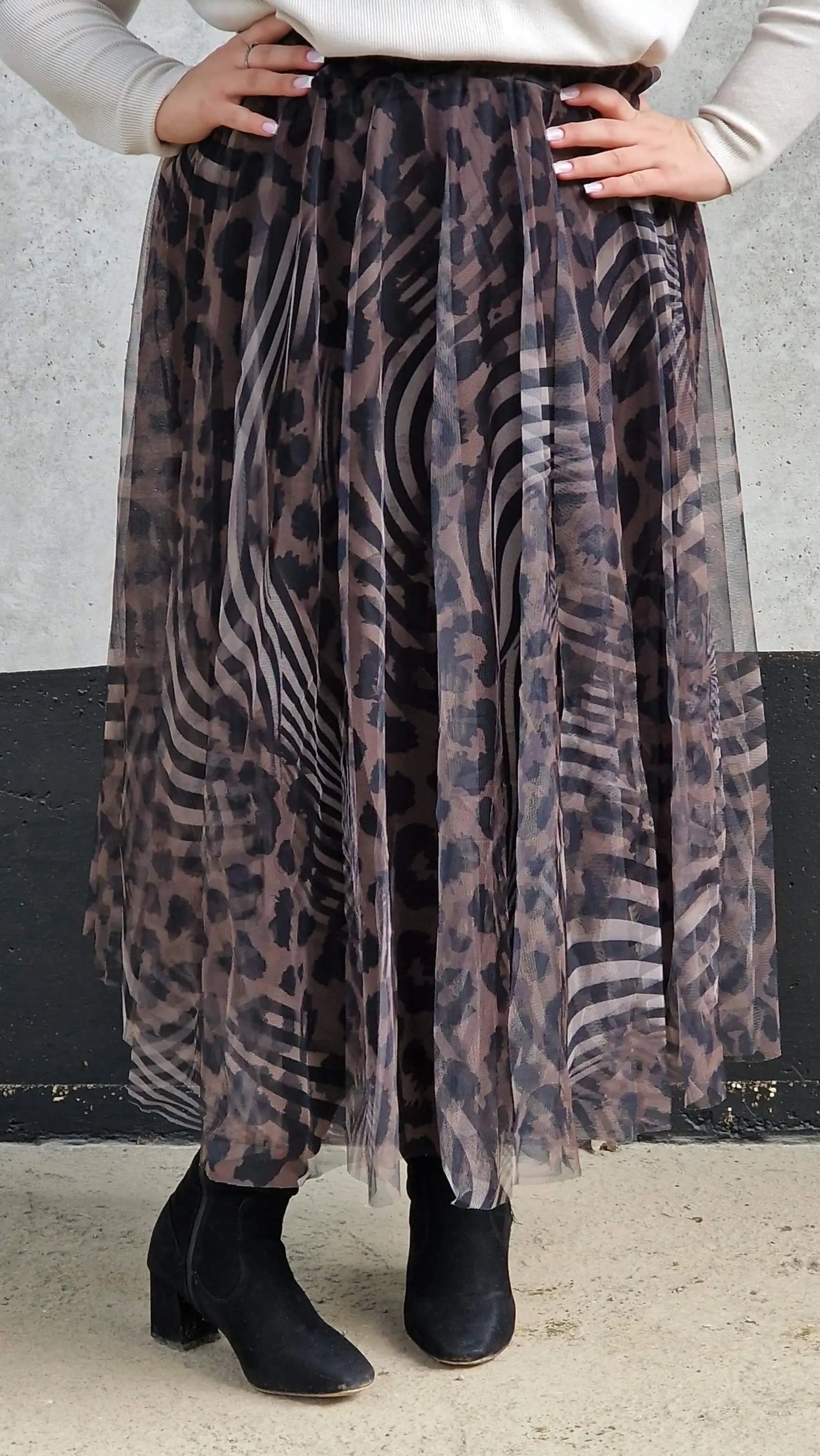Stylowa spódnica midi z tiulem i wyrazistym printem w zwierzęce wzory zebry