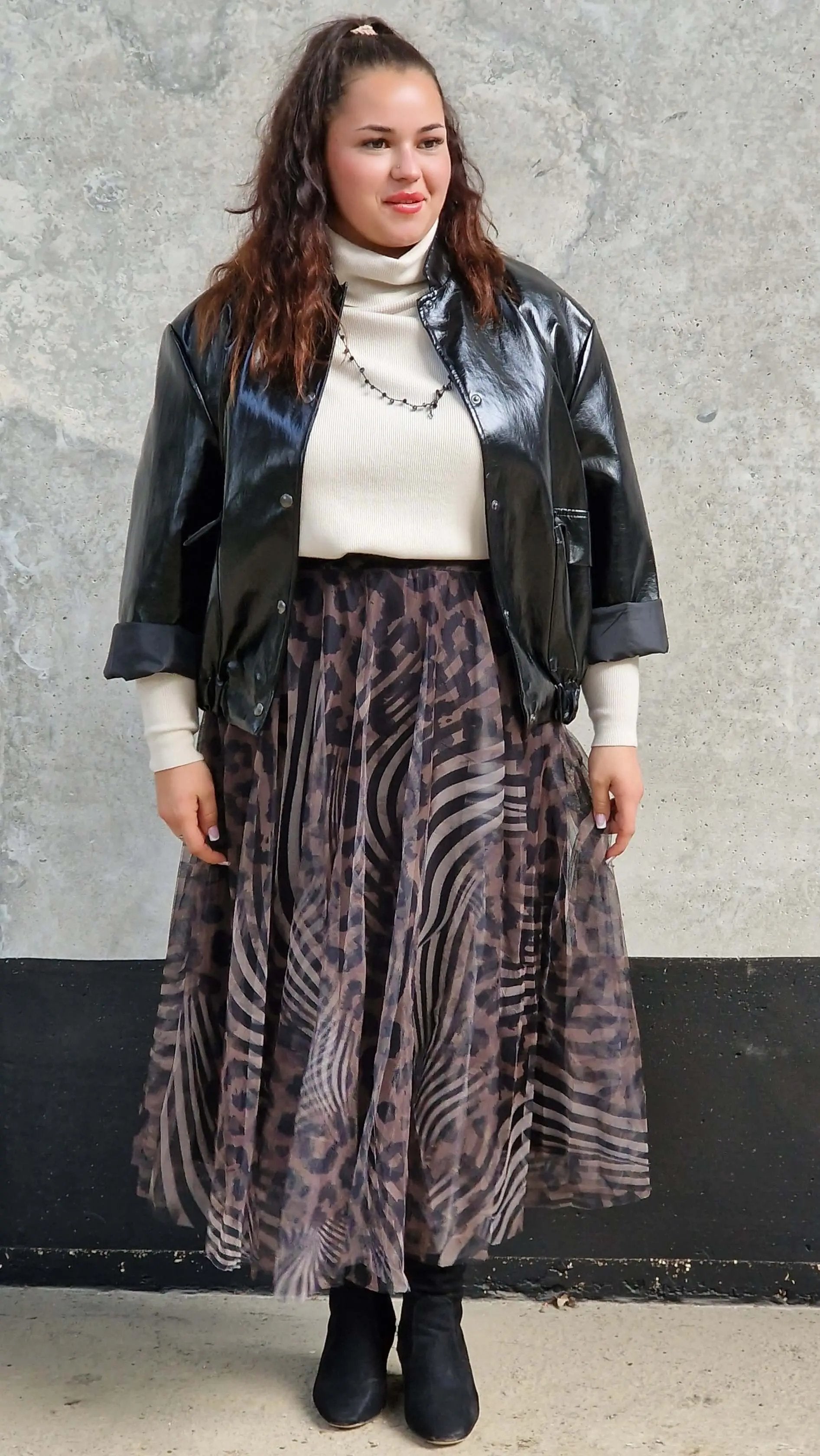 Efektowna spódnica midi przyciąga uwagę unikalnym połączeniem wzorów zwierzęcych i geometrycznych, które nadają jej odważnego, a zarazem eleganckiego charakteru. Wierzchnia warstwa wykonana z delikatnego, zwiewnego tiulu, który subtelnie opada, tworząc lekki i kobiecy efekt. Spód pod spodem wykonany jest z miękkiego materiału, co zapewnia komfort noszenia i minimalizuje prześwitywanie.