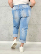 Efektowne koronkowe panele na kolanach nadają całości delikatnego wdzięku, a subtelne przetarcia wprowadzają lekkość i nieformalny charakter. Rolowane nogawki dodają spodniom stylowego, swobodnego wykończenia, które świetnie wpisuje się w miejskie trendy plus size.