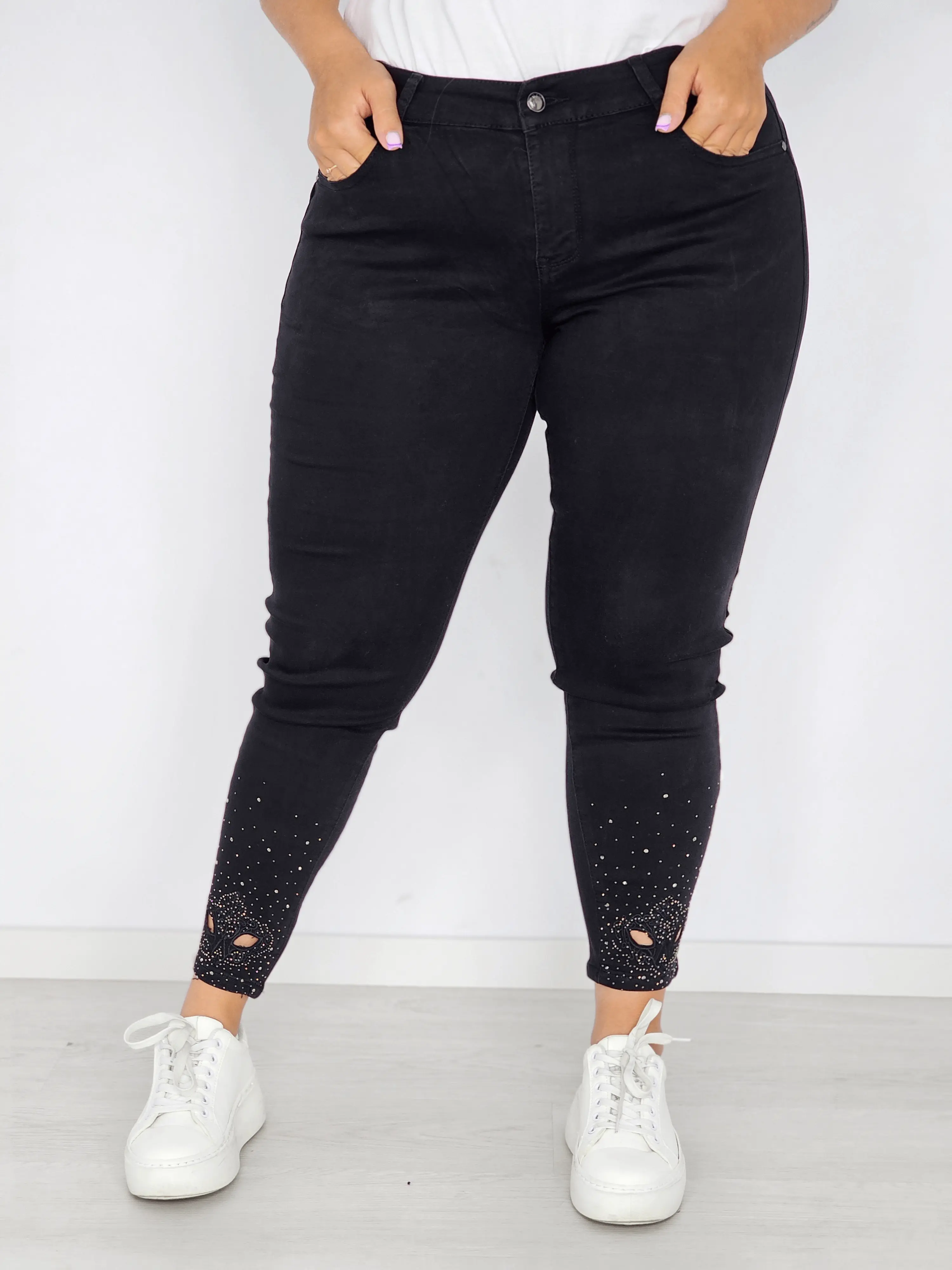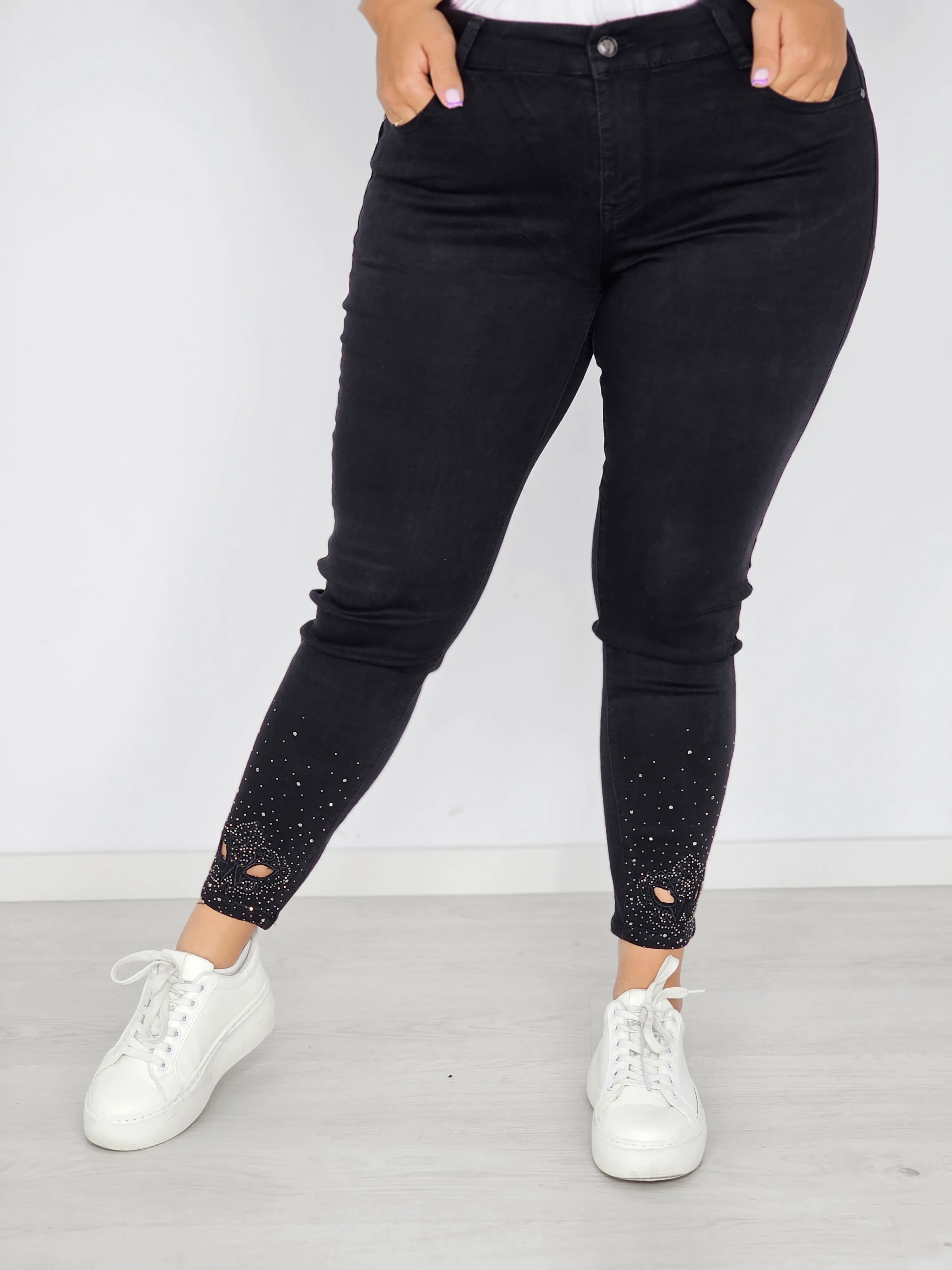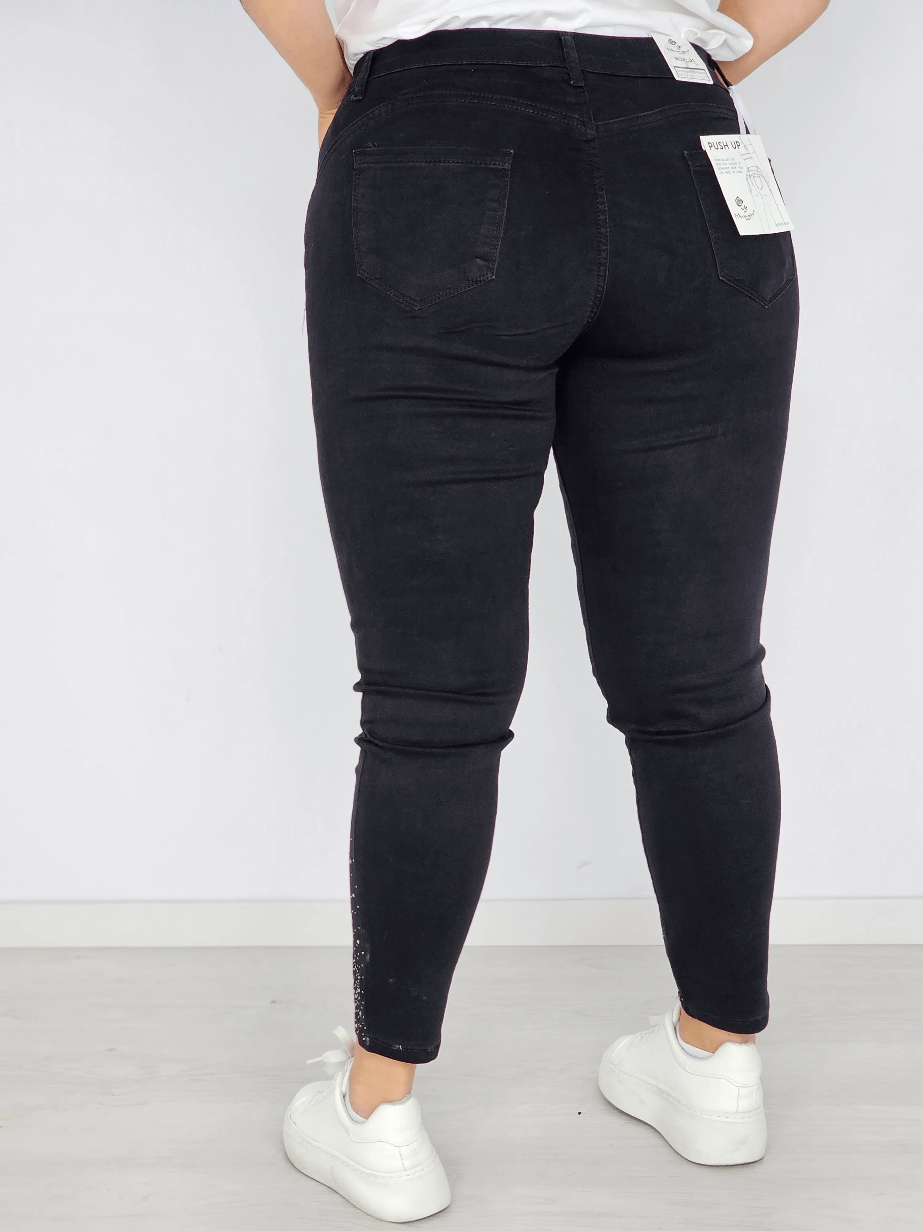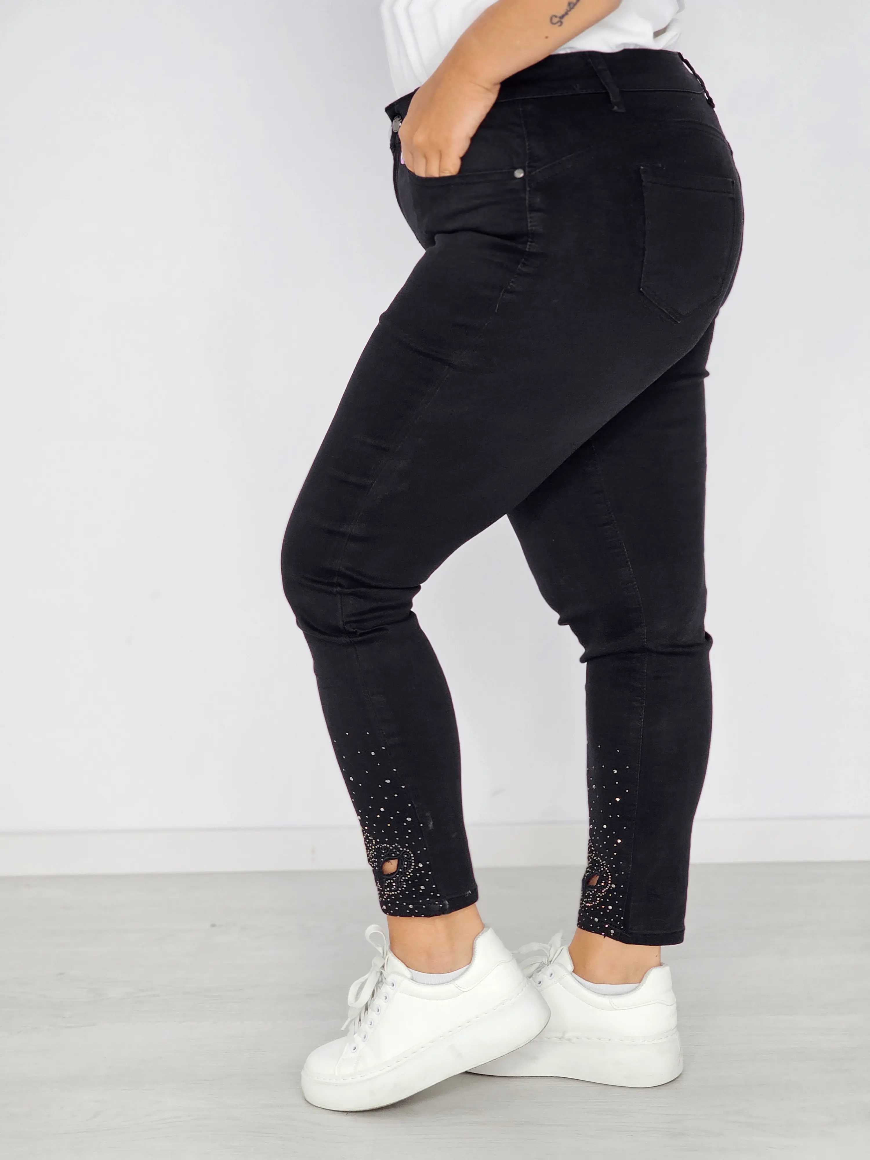 Te spodnie plus size to świetna propozycja dla kobiet, które lubią modę z charakterem i chcą wyróżniać się w każdej stylizacji. Klasyczny, dopasowany krój łączy się tu z unikalną aplikacją na nogawkach – subtelne wycięcia w połączeniu z błyszczącymi cyrkoniami tworzą wyjątkowy efekt. To idealne połączenie elegancji i luzu, dzięki któremu każda stylizacja zyska nowy wymiar.