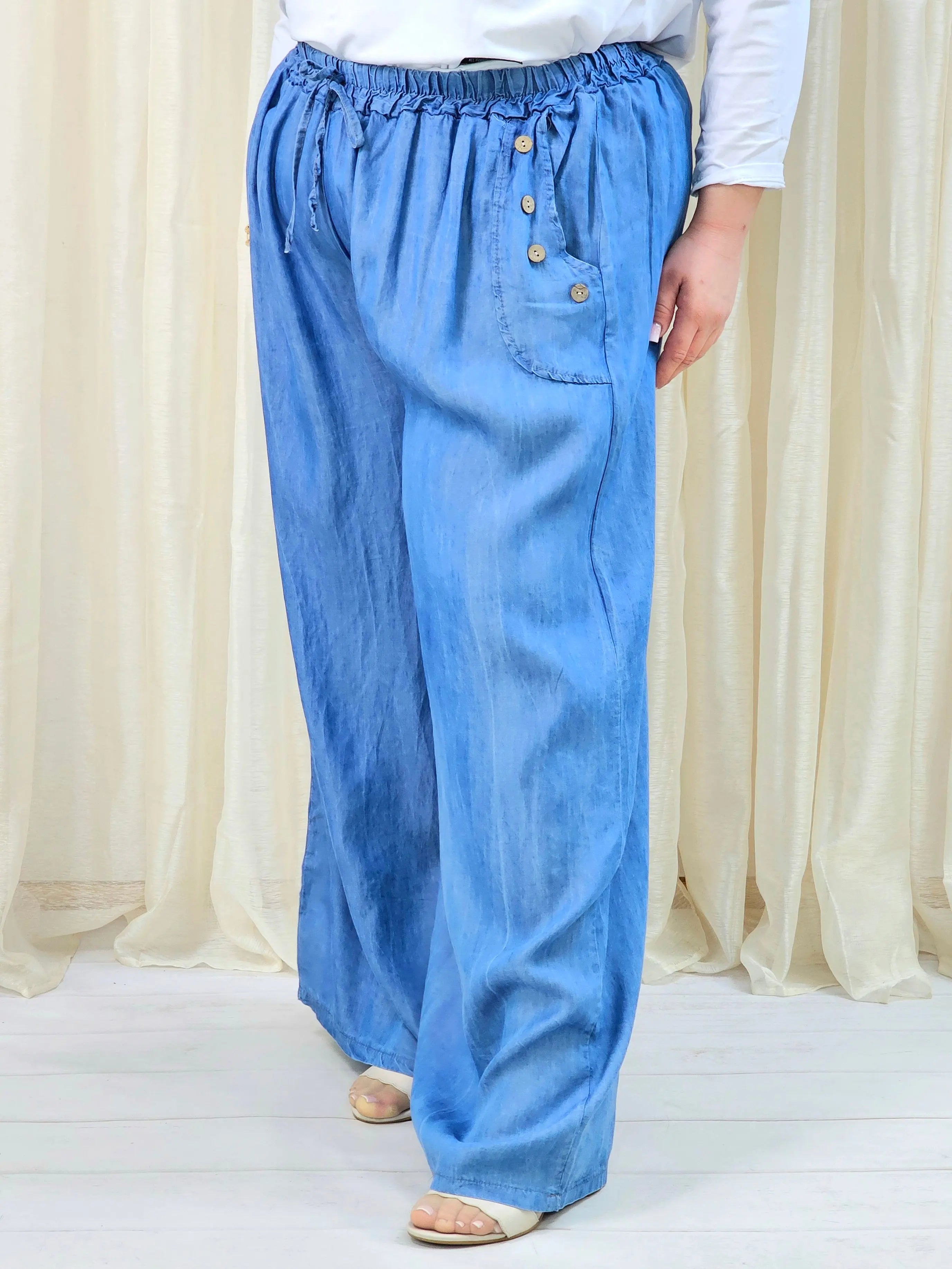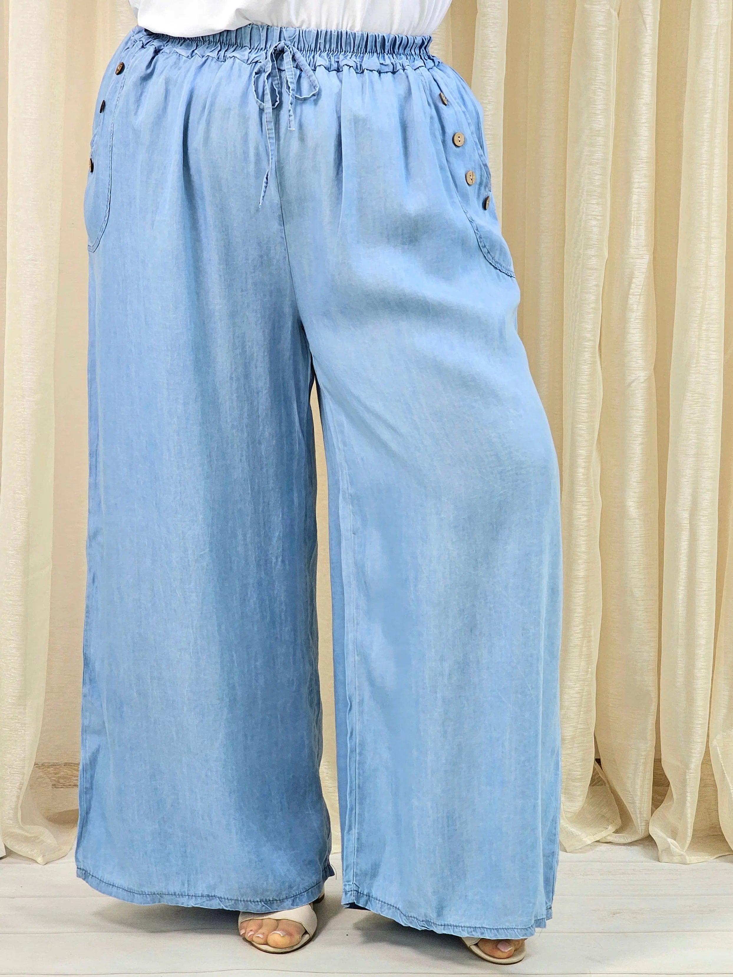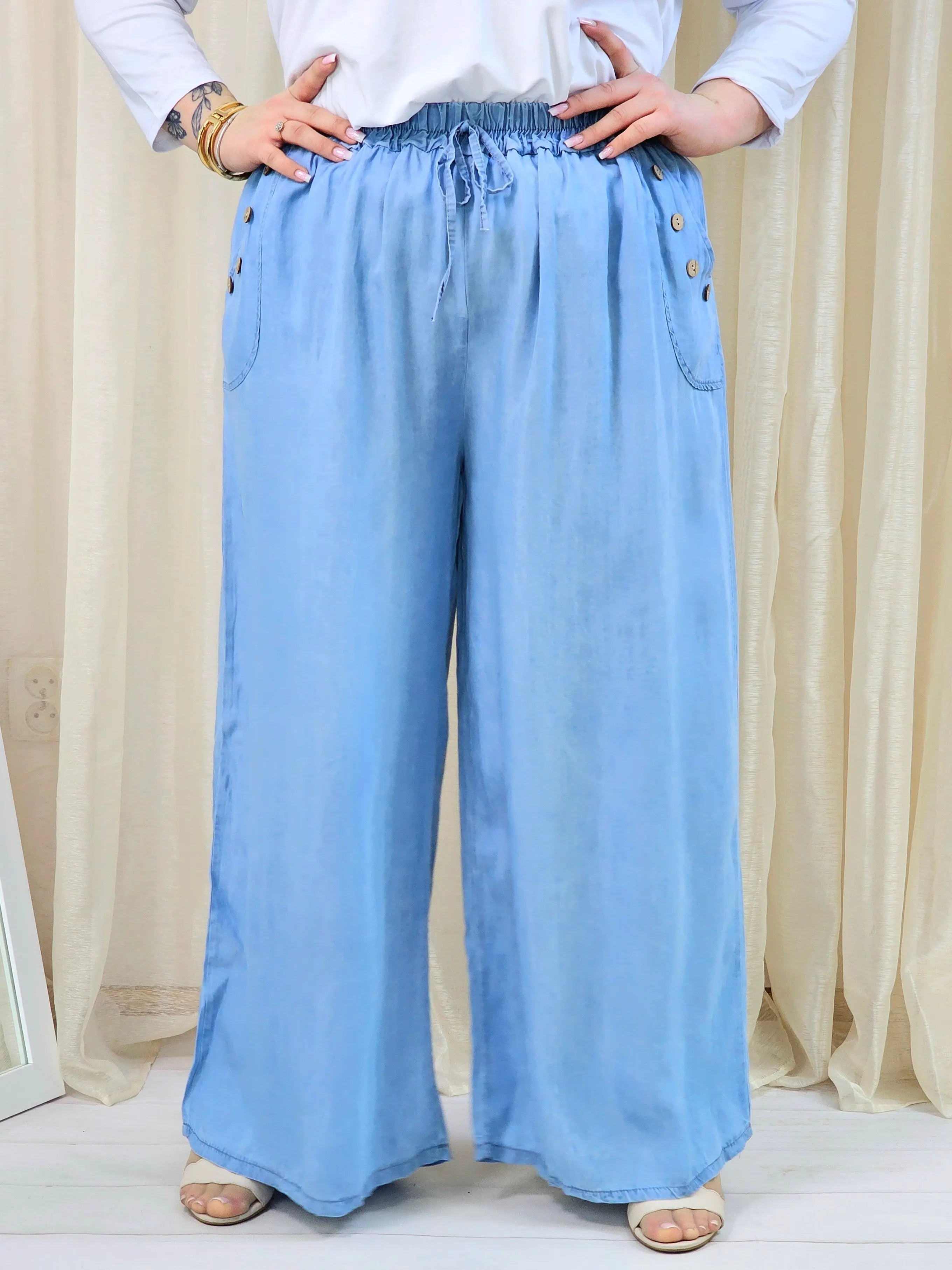 Spodnie plus size szerokie z gumką w pasie – lekkie niebieskie spodnie damskie XXL