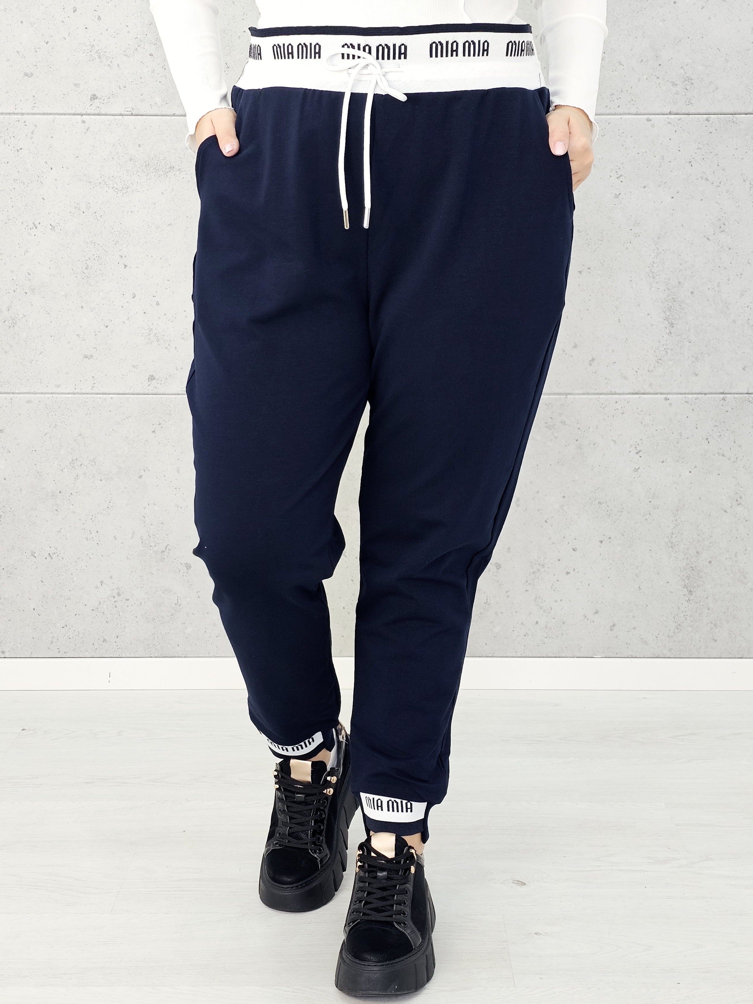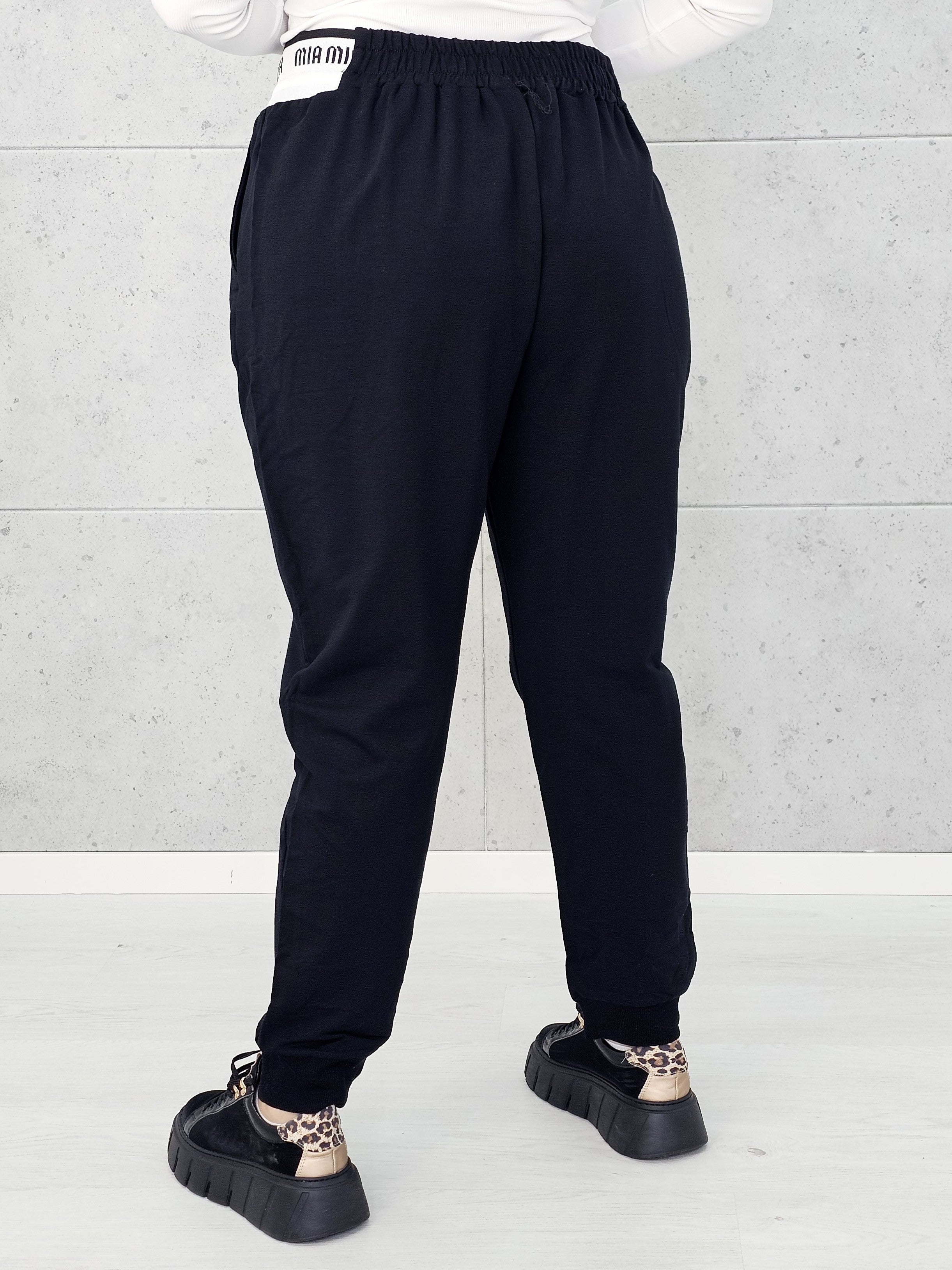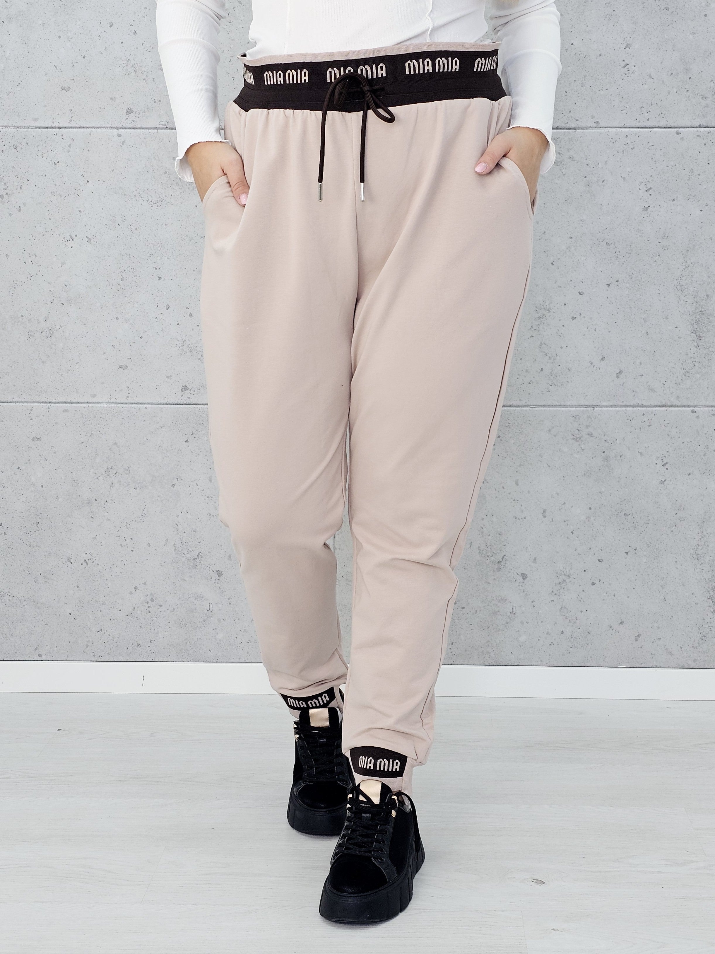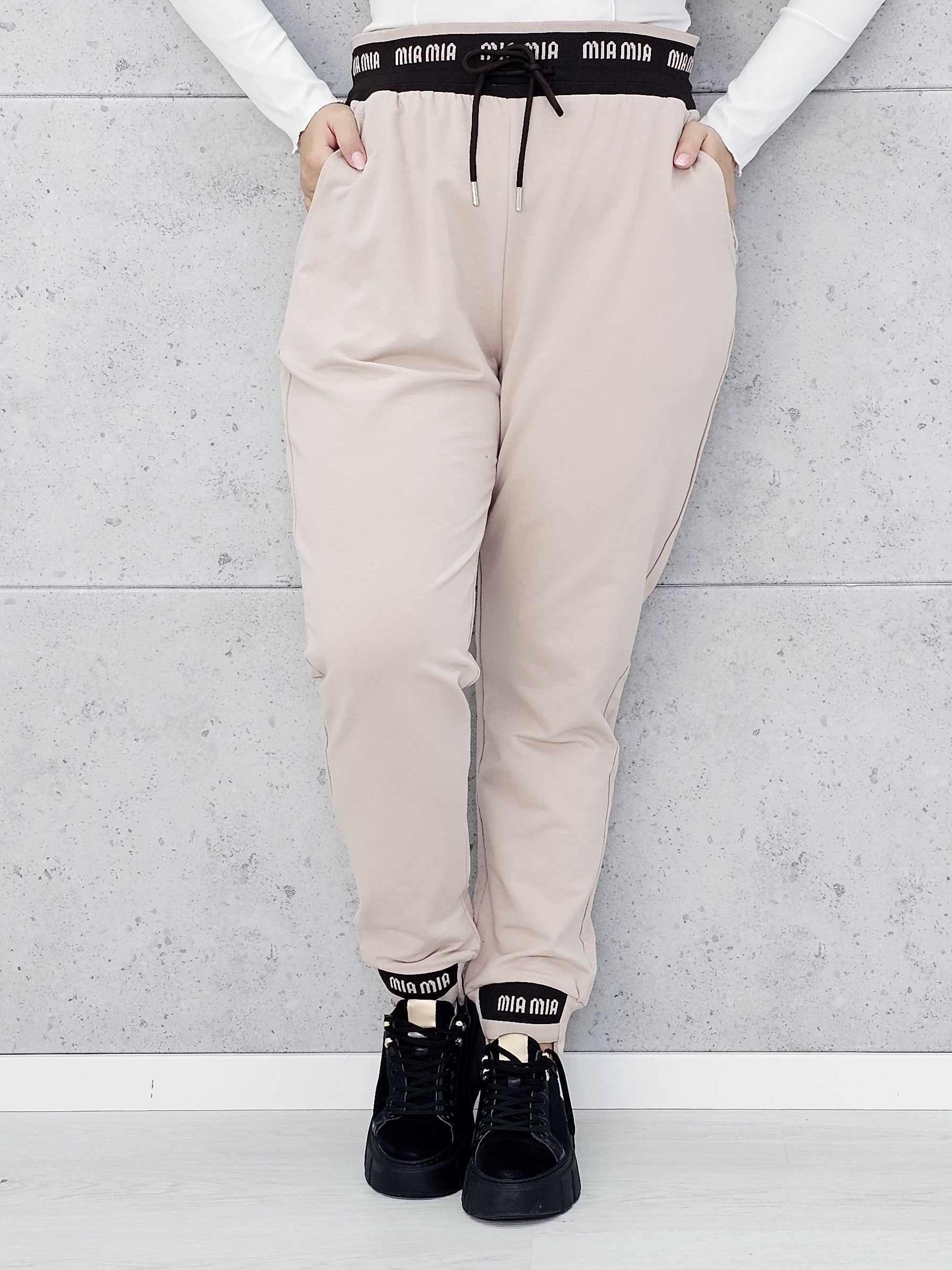 Elastyczna, logowana gumka „Mia Mia” w pasie nie tylko zapewnia idealne dopasowanie, ale też stanowi ozdobny detal, który przyciąga wzrok i nadaje całości modnego charakteru. Ściągacze przy nogawkach sprawiają, że spodnie perfekcyjnie leżą i zachowują fason przez cały dzień, a miękki, lekko elastyczny materiał pozwala skórze oddychać i zapewnia wygodę w każdej sytuacji.