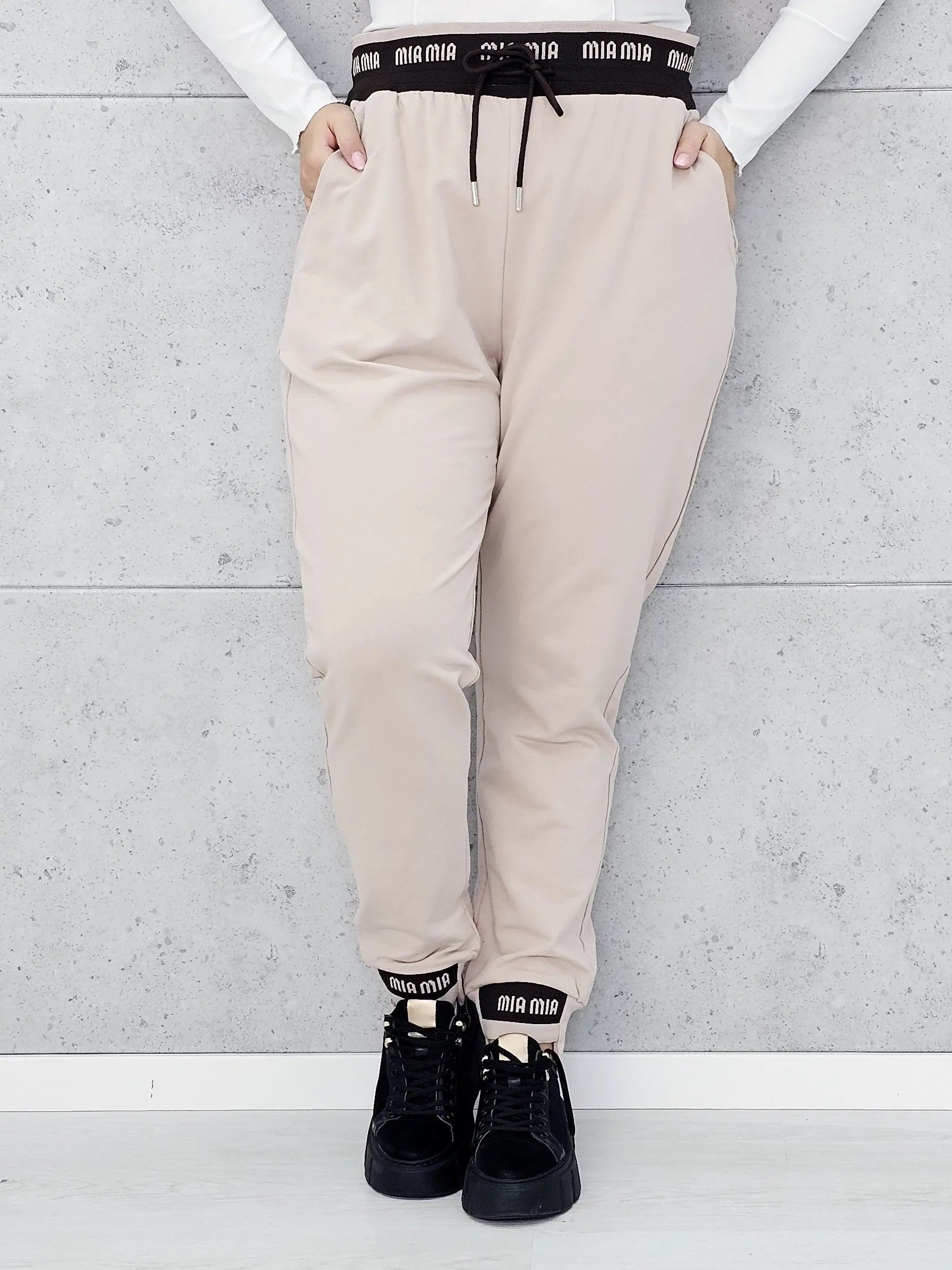✔️ Elastyczna talia z logowaną gumką „Mia Mia” i sznurkiem