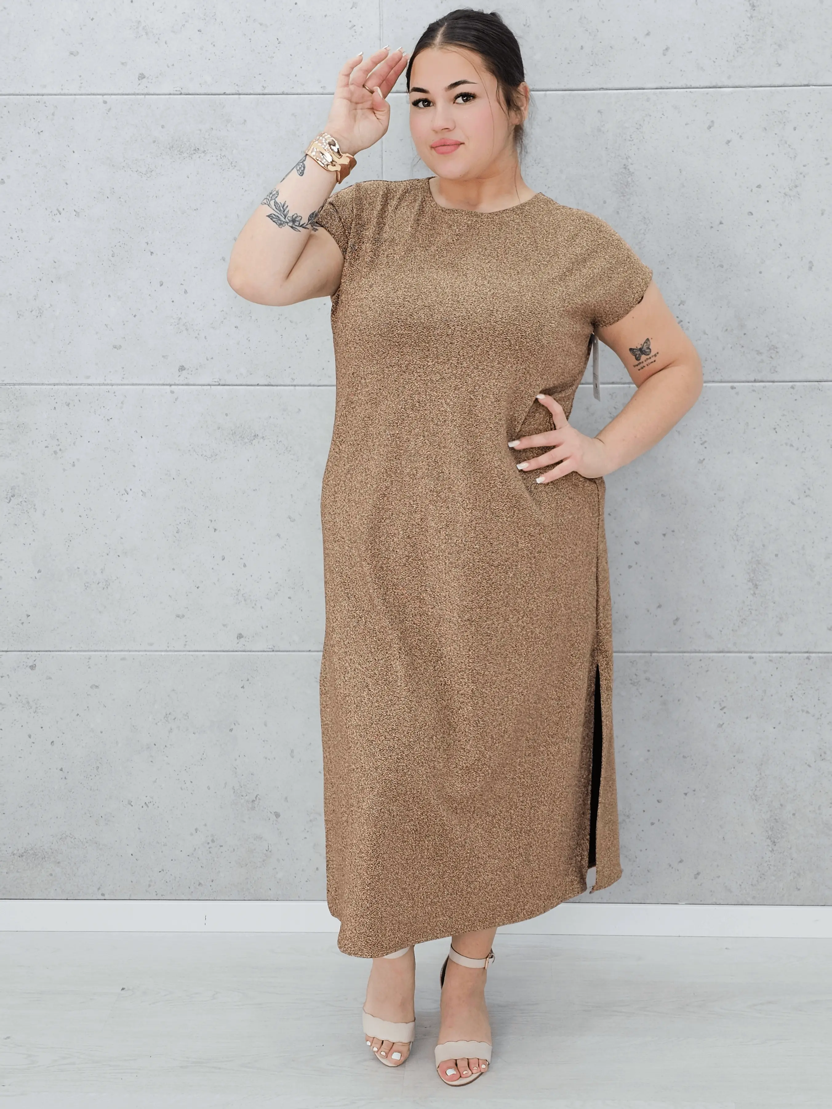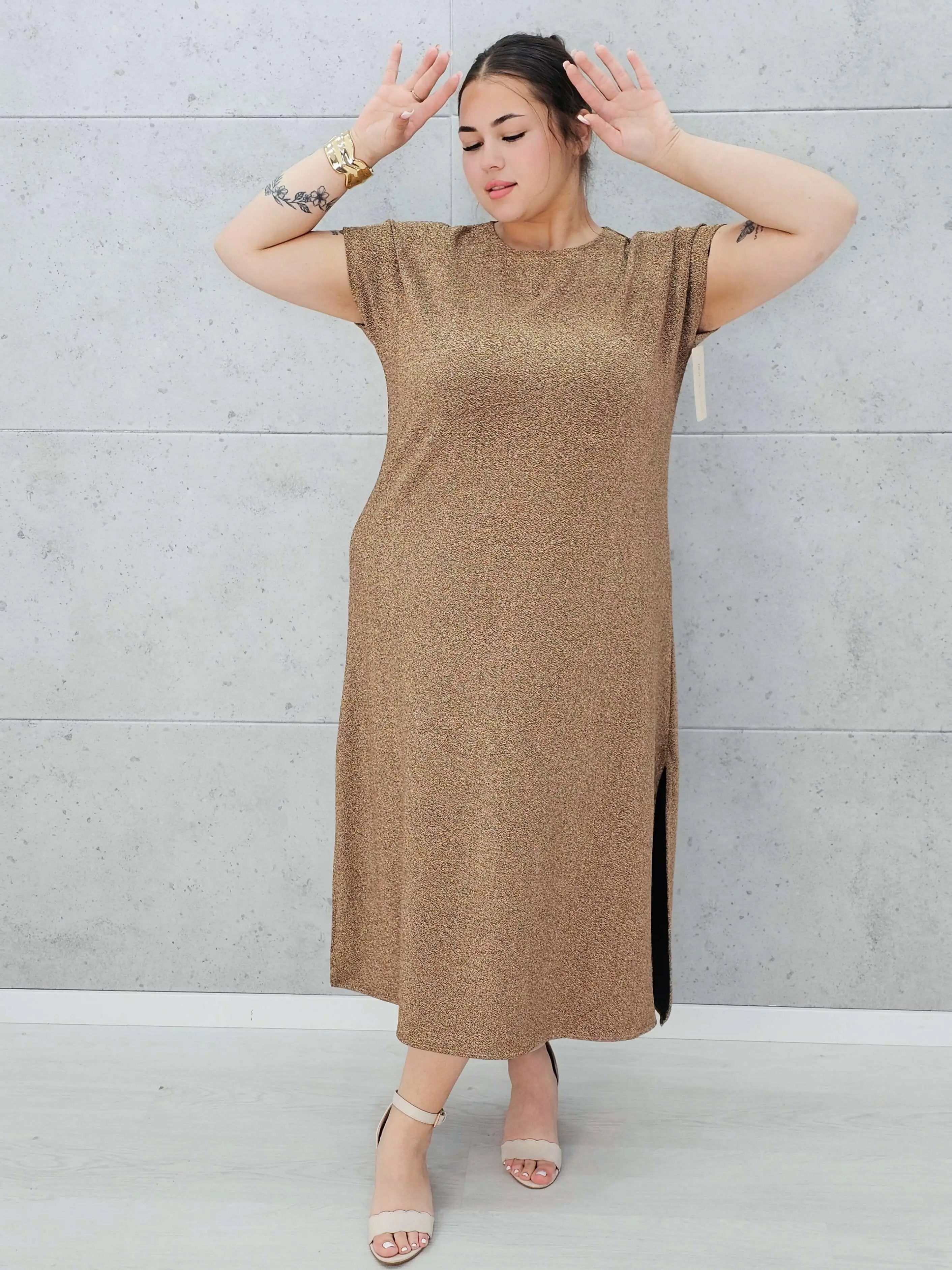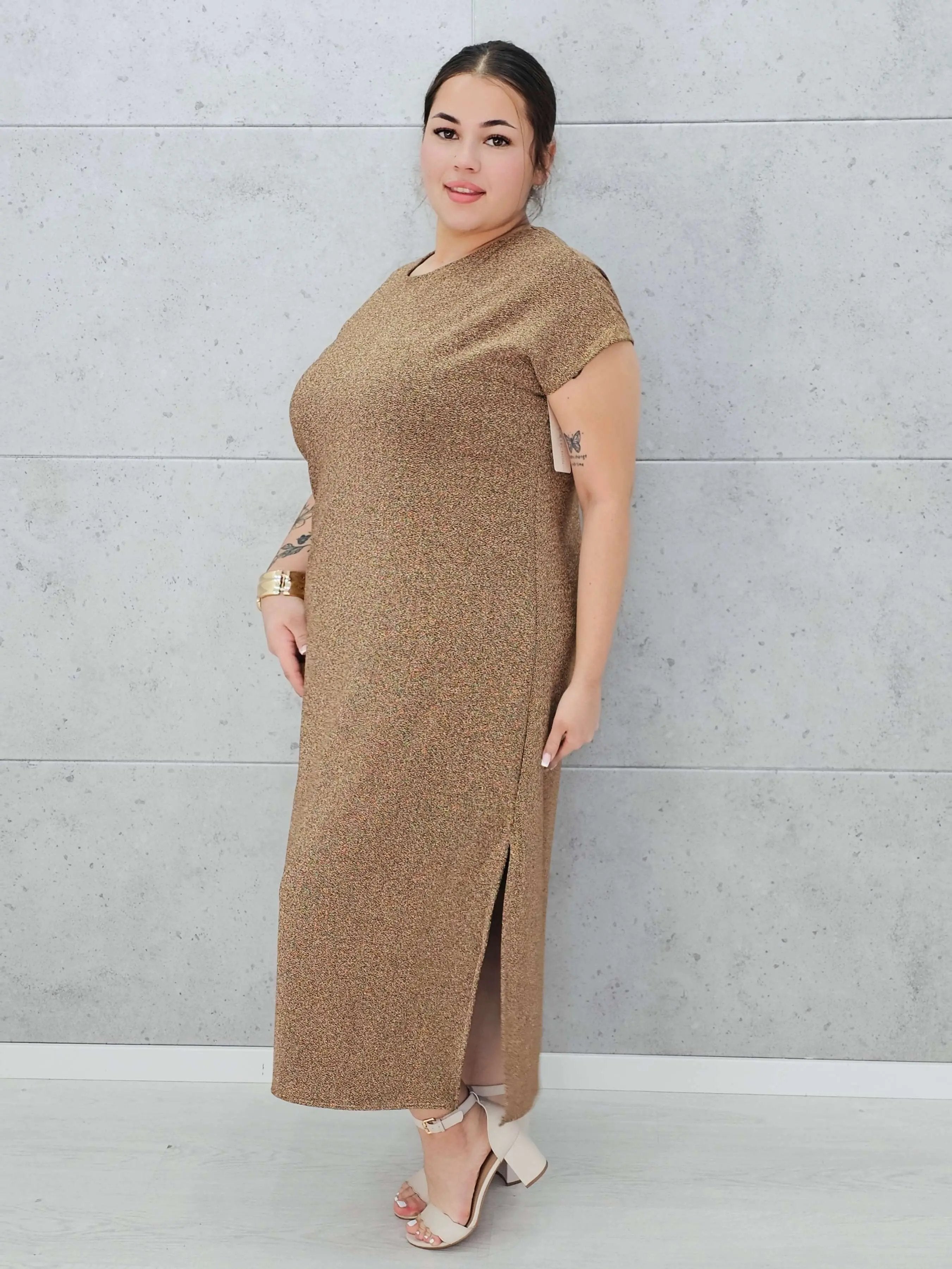 Elegancka sukienka plus size, która łączy wygodę z nutą luksusu. Ta złocista propozycja to idealny wybór!