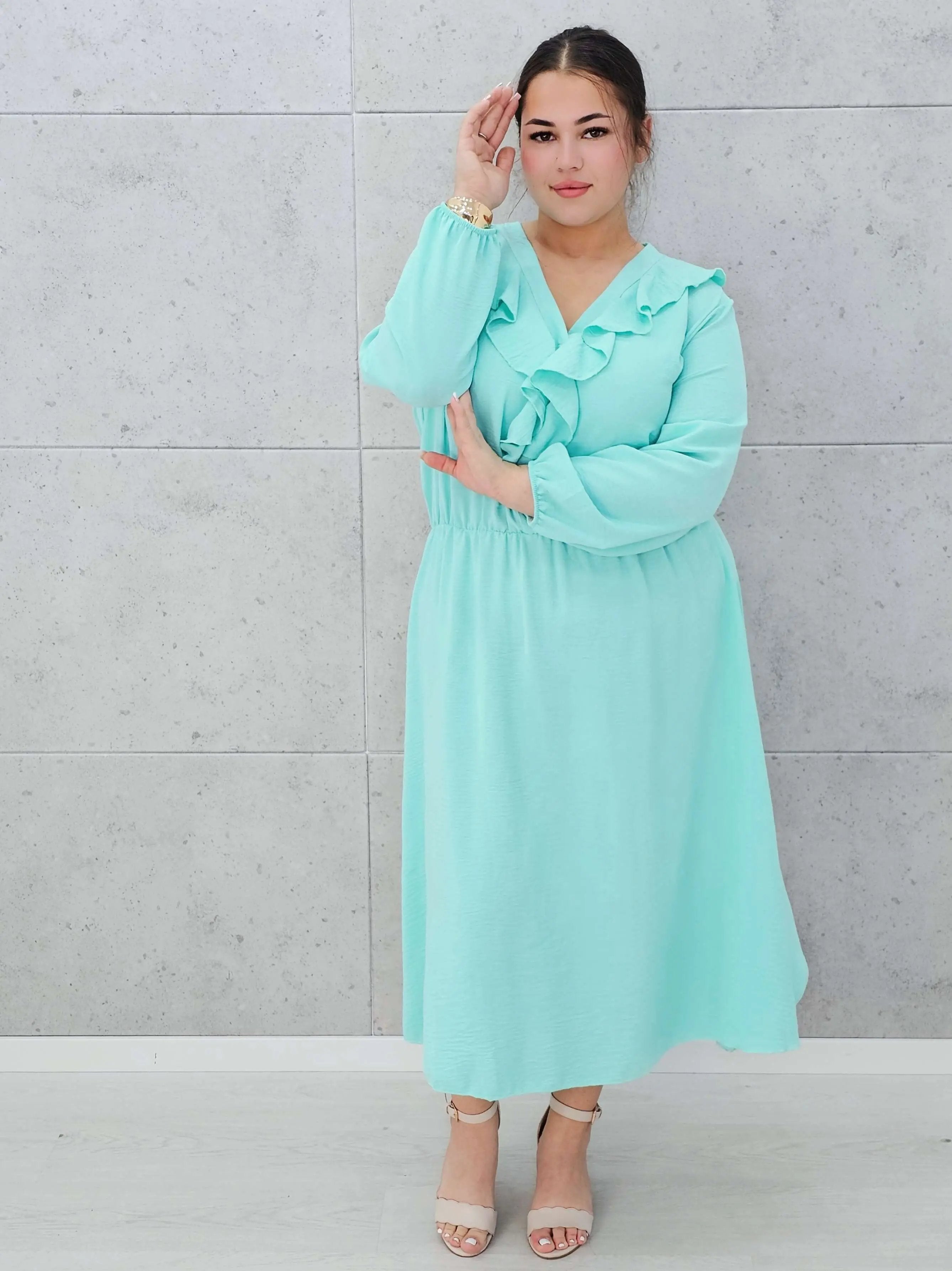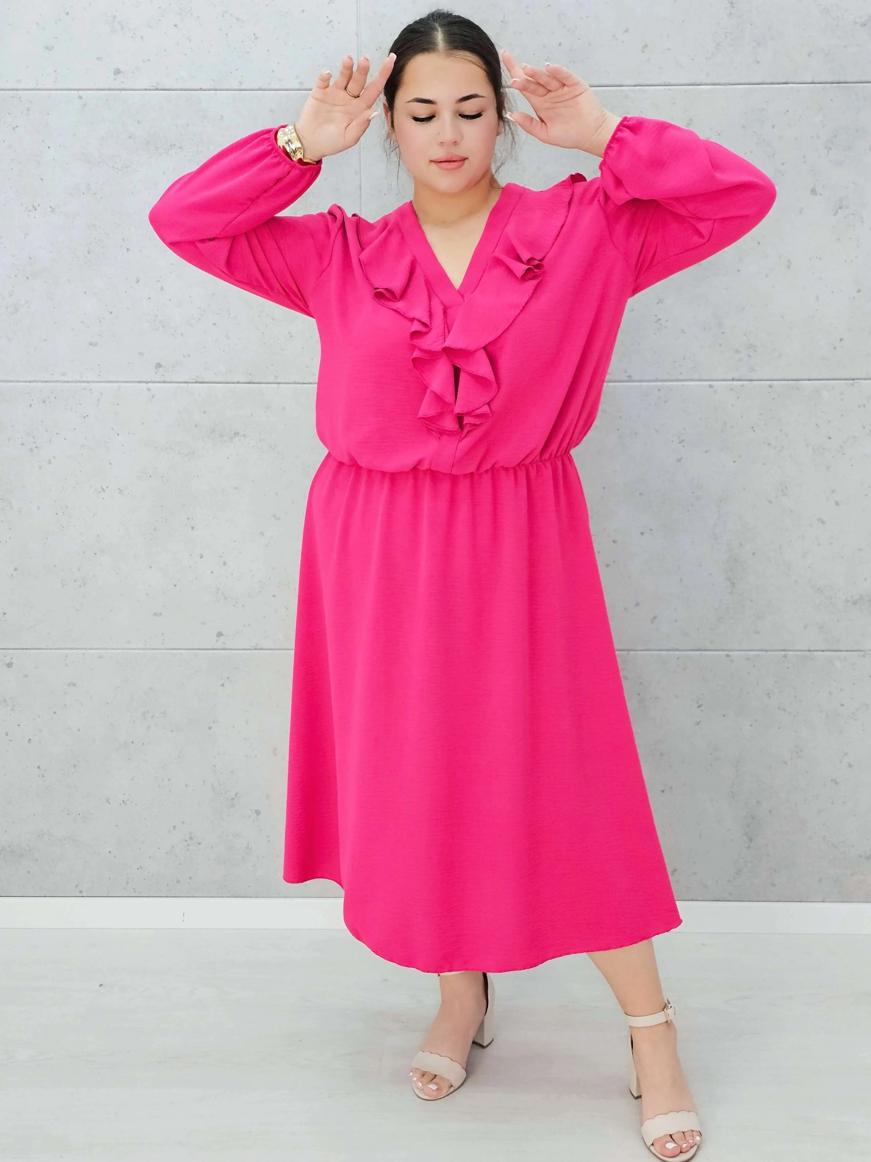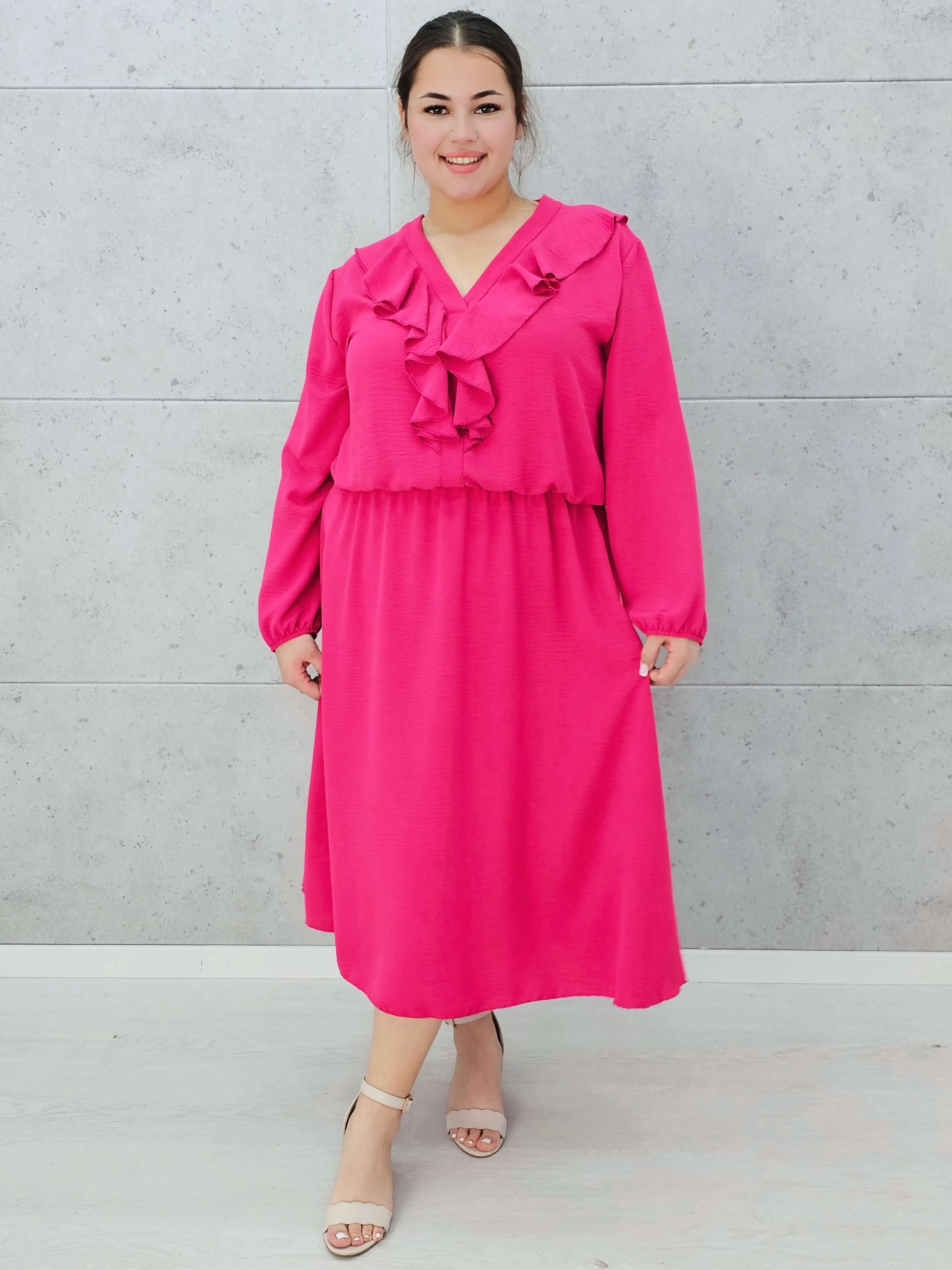Stylowa sukienka z długim rękawem i ozdobnym żabotem to idealny wybór na wyjątkowe okazje i codzienne stylizacje.