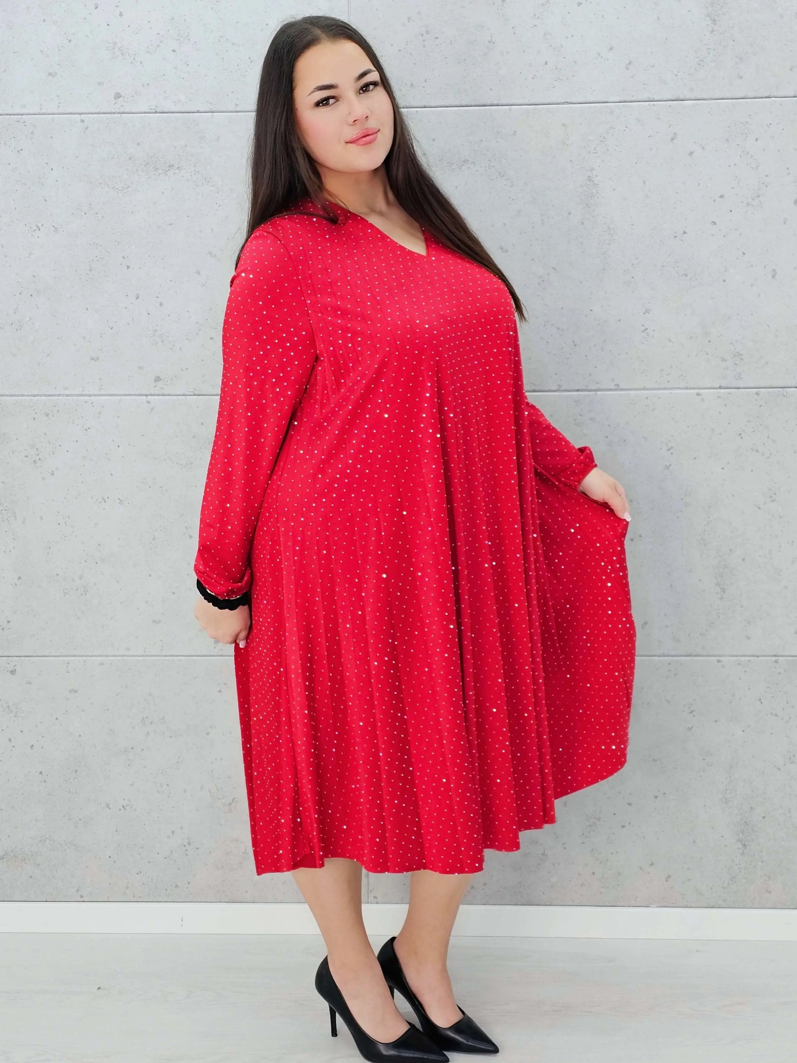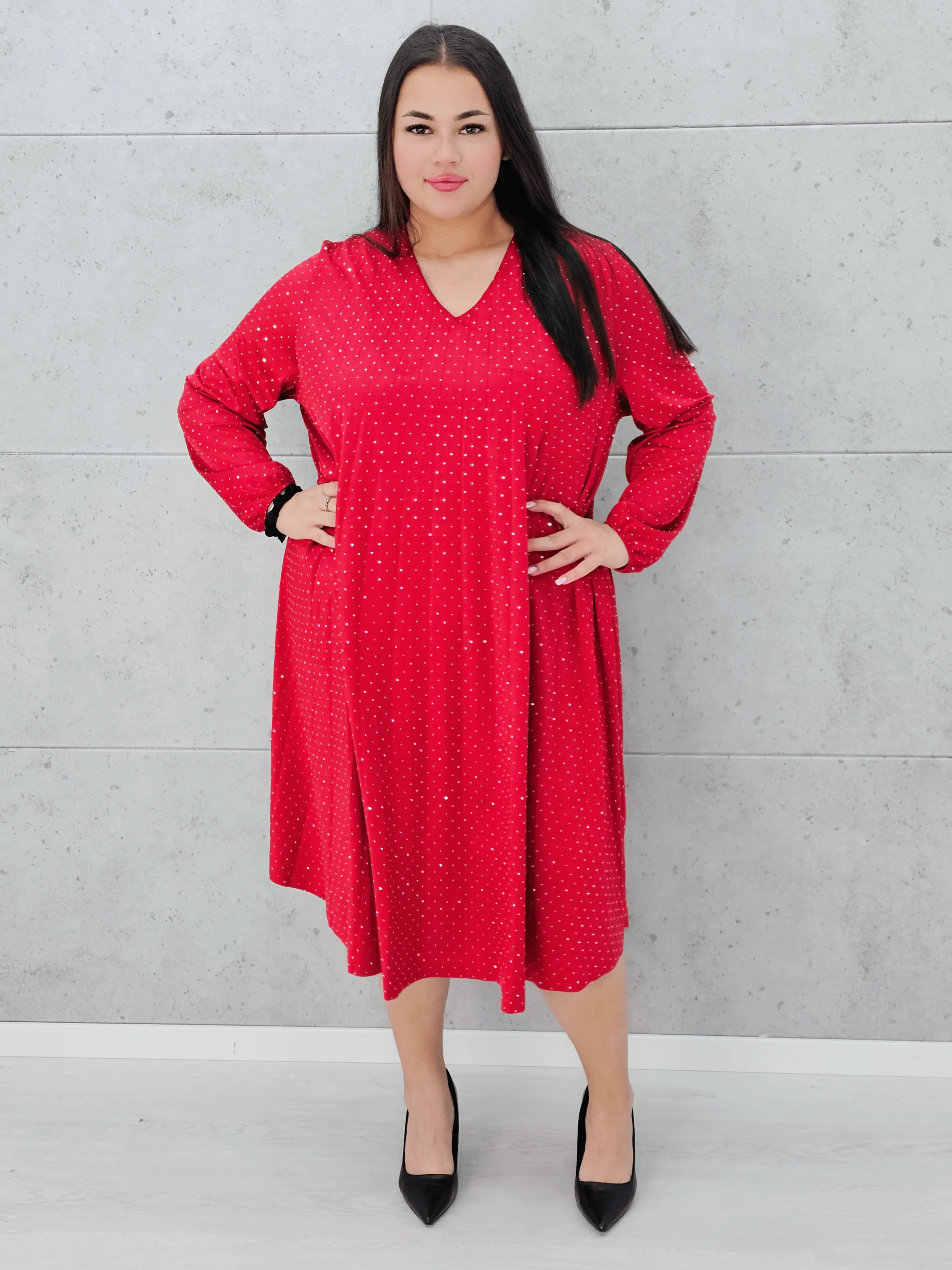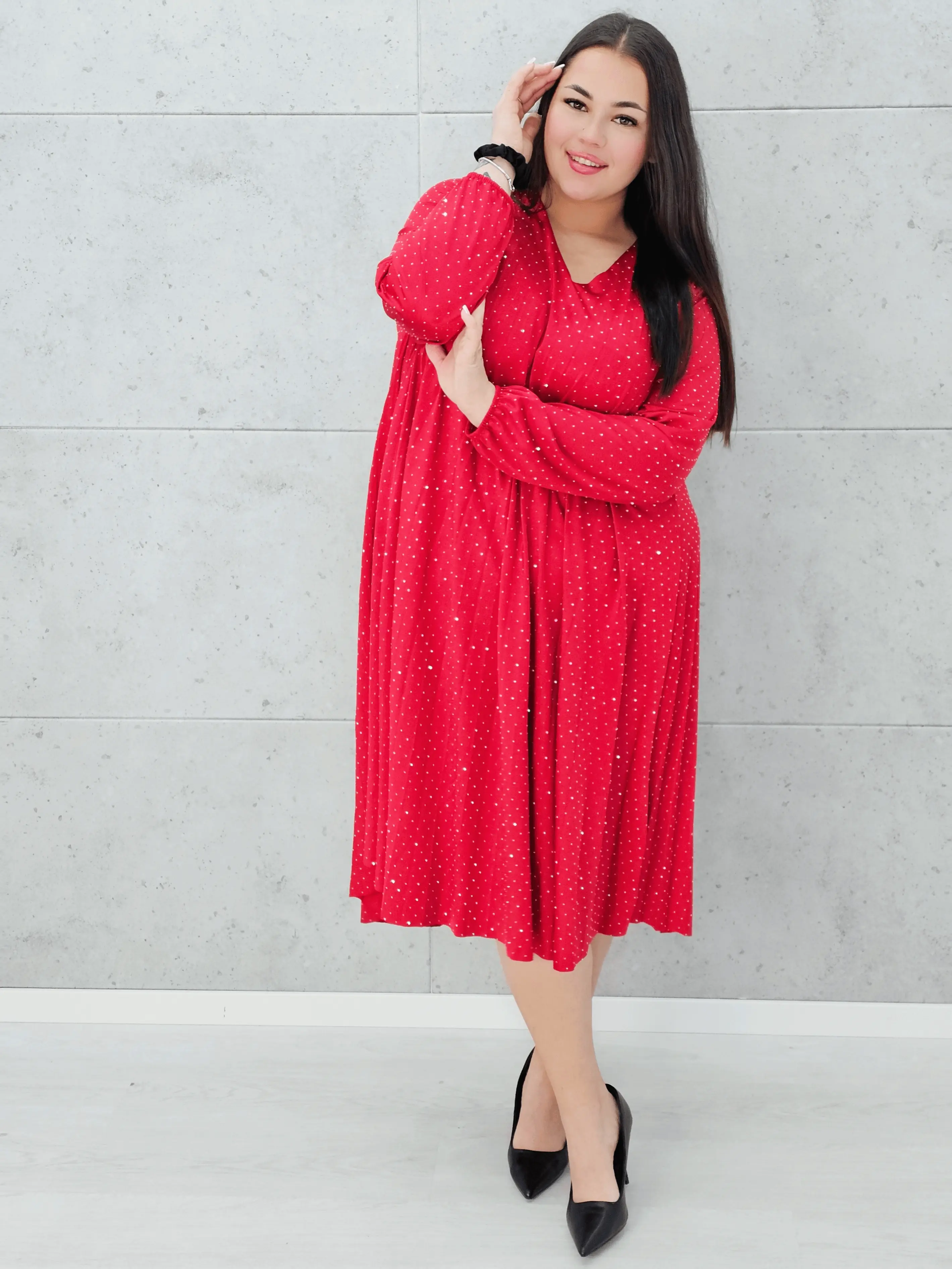 Szukasz sukienki, która doda Ci pewności siebie i podkreśli Twoją urodę? Ten model w intensywnej czerwieni i drobne groszki to ponadczasowa propozycja, która sprawdzi się zarówno na co dzień, jak i na wyjątkowe okazje. Zwiewny fason pięknie układa się na sylwetce i daje pełną swobodę ruchów.