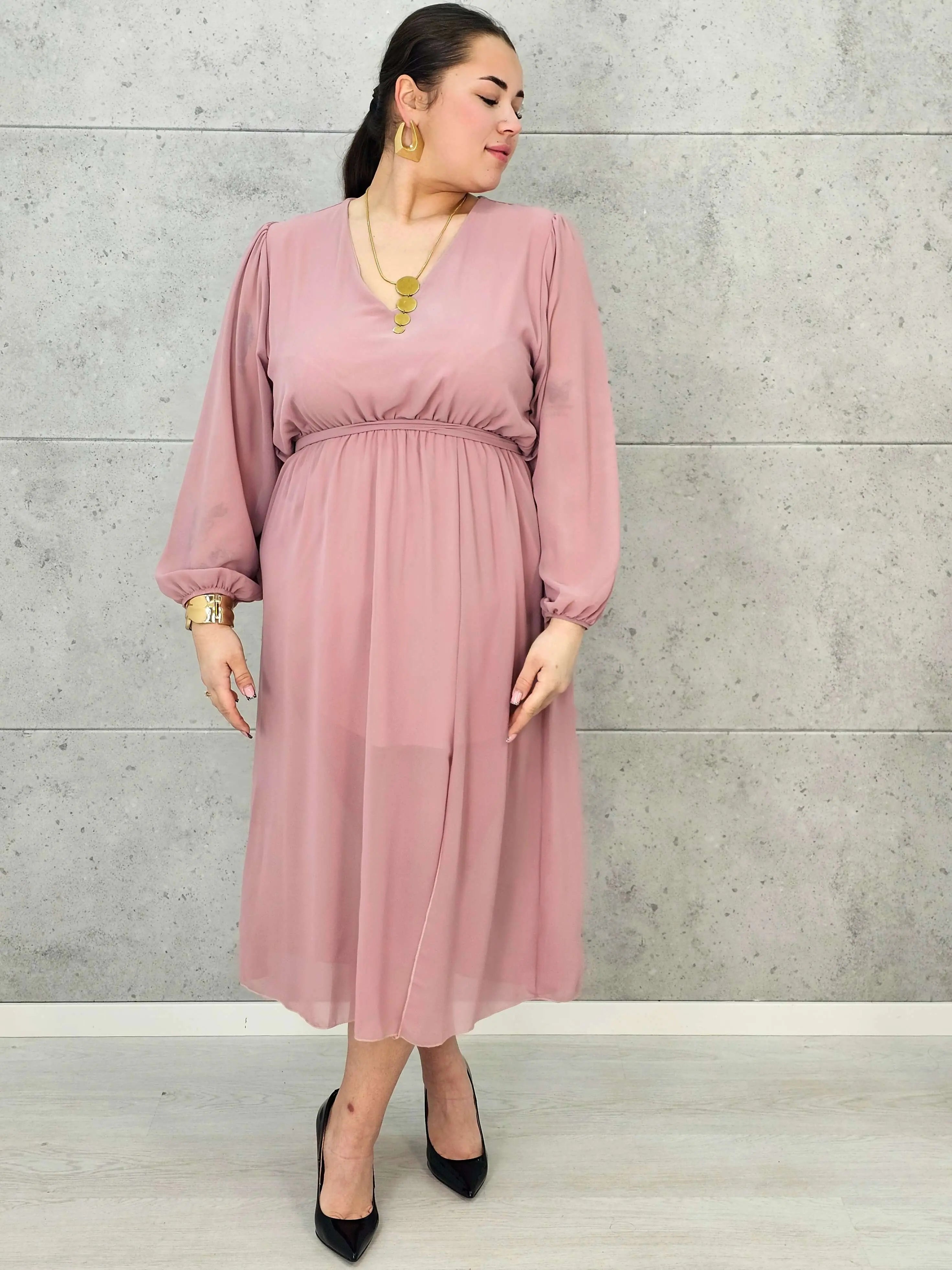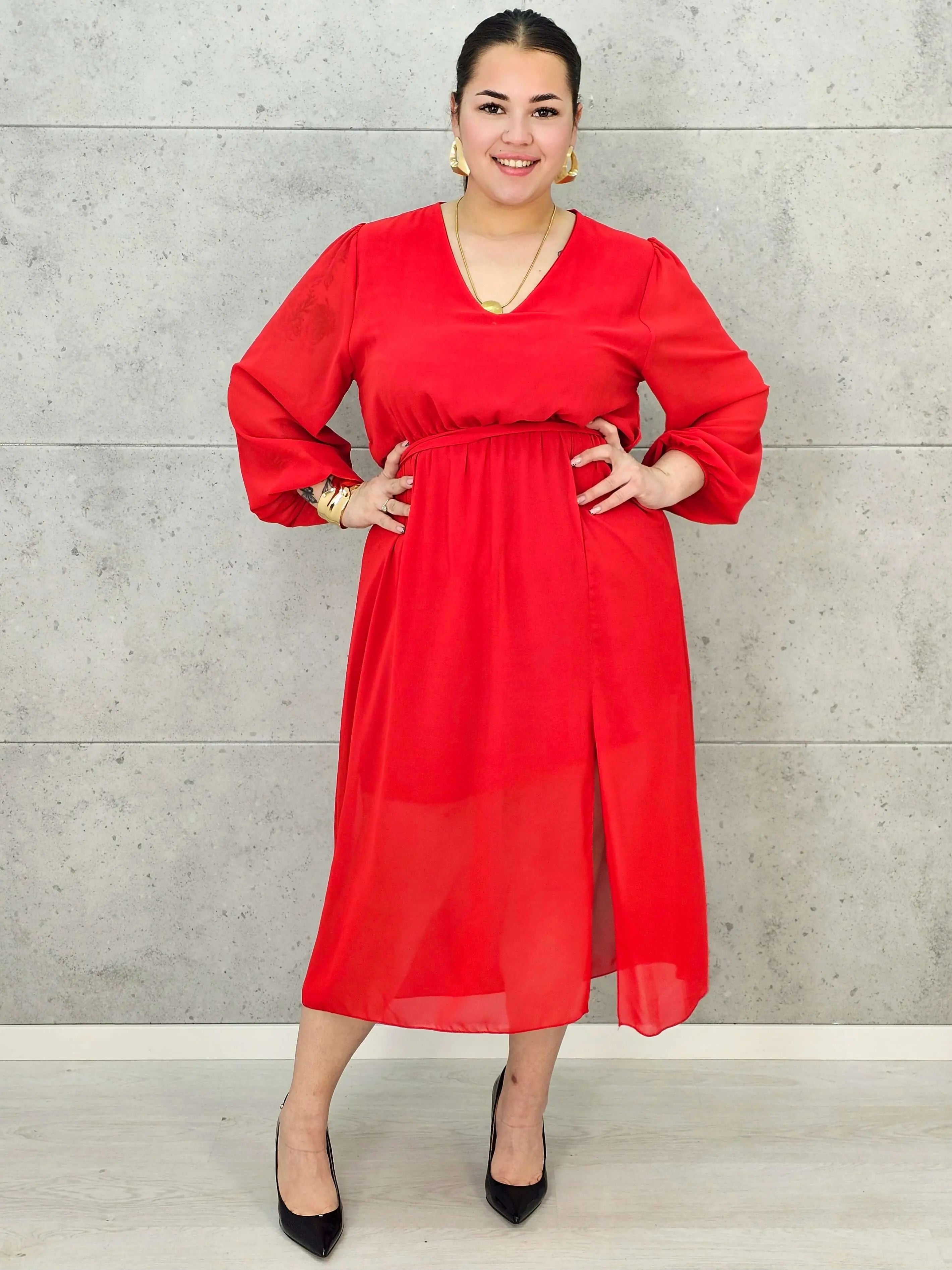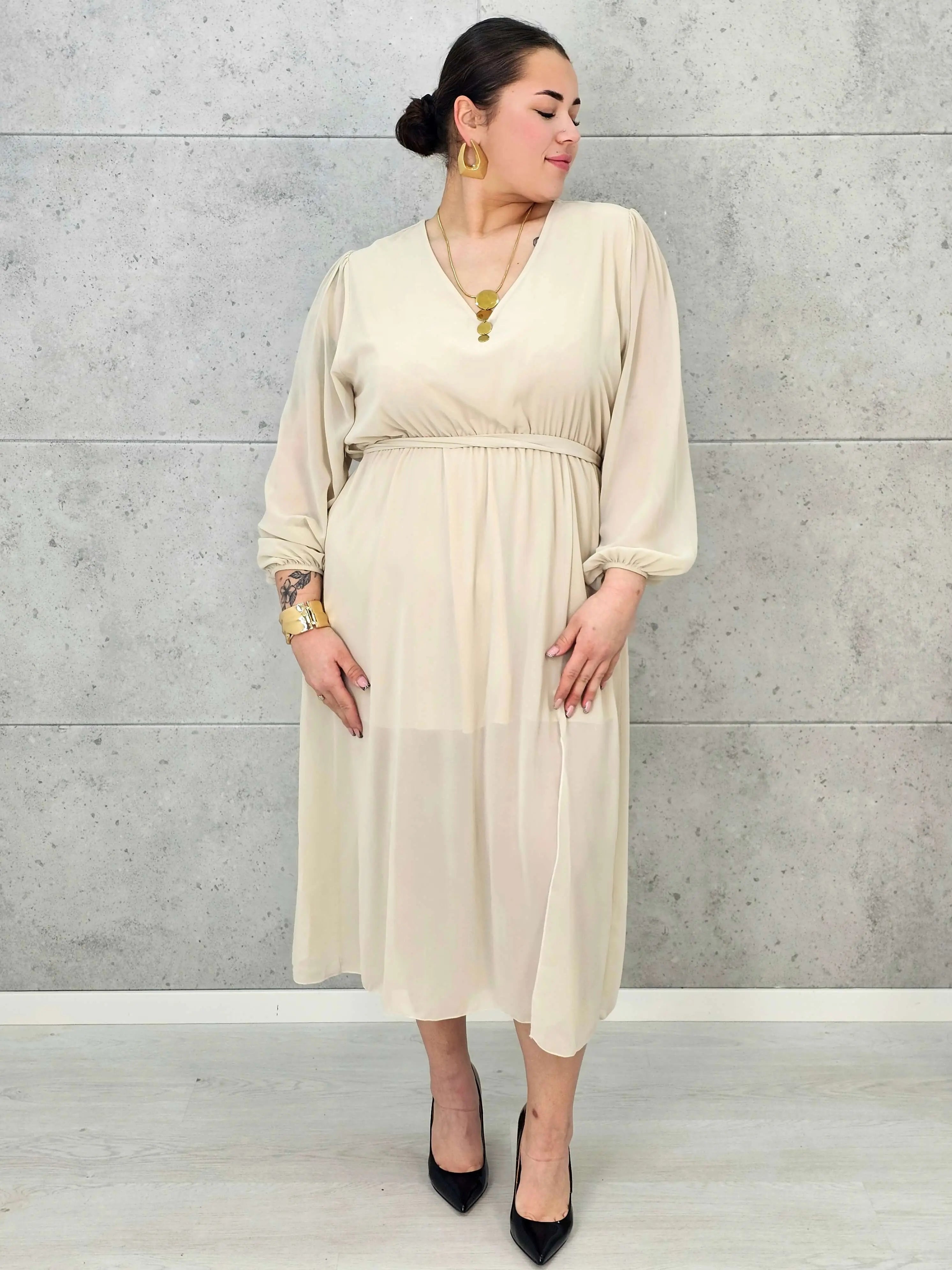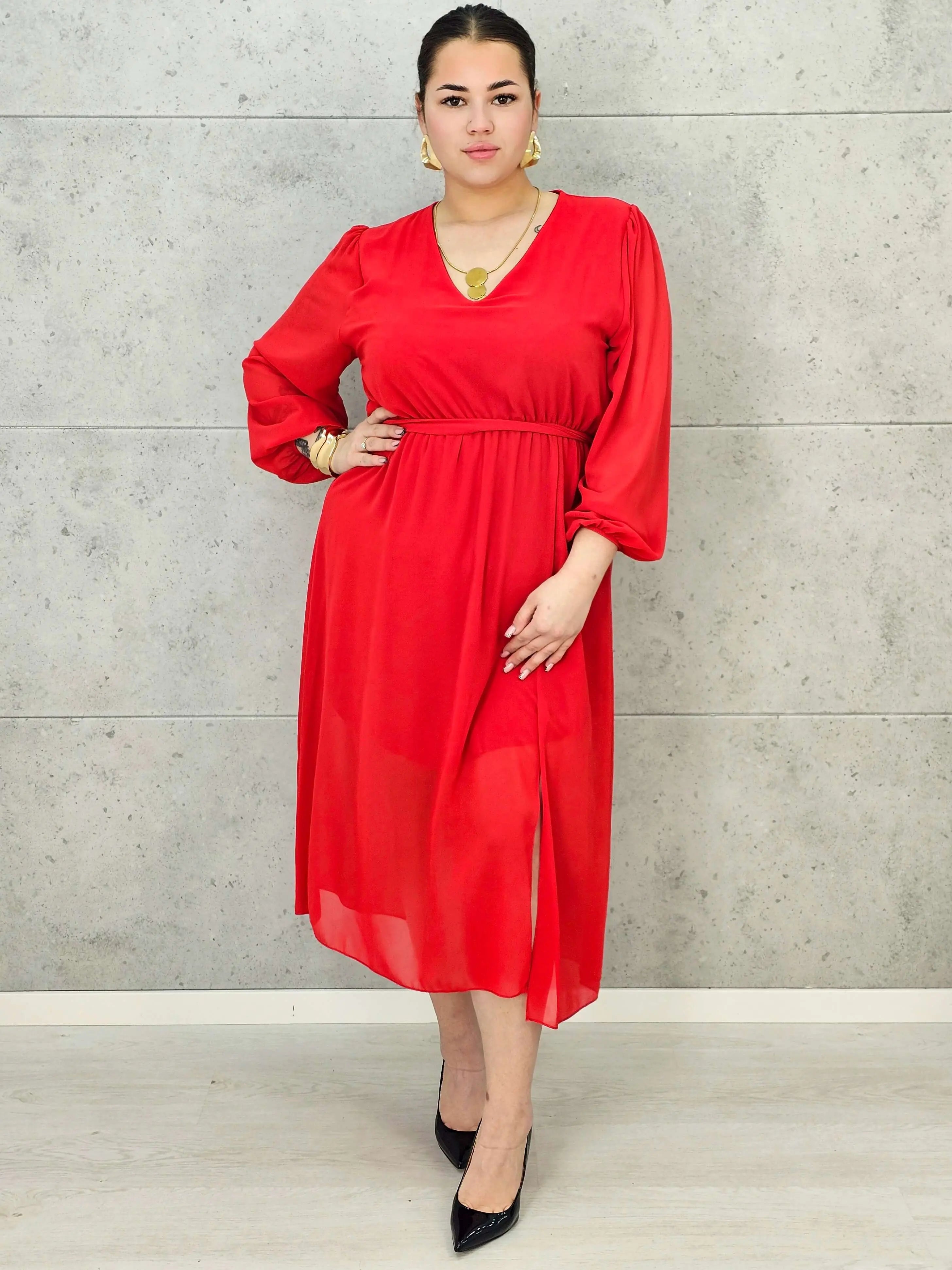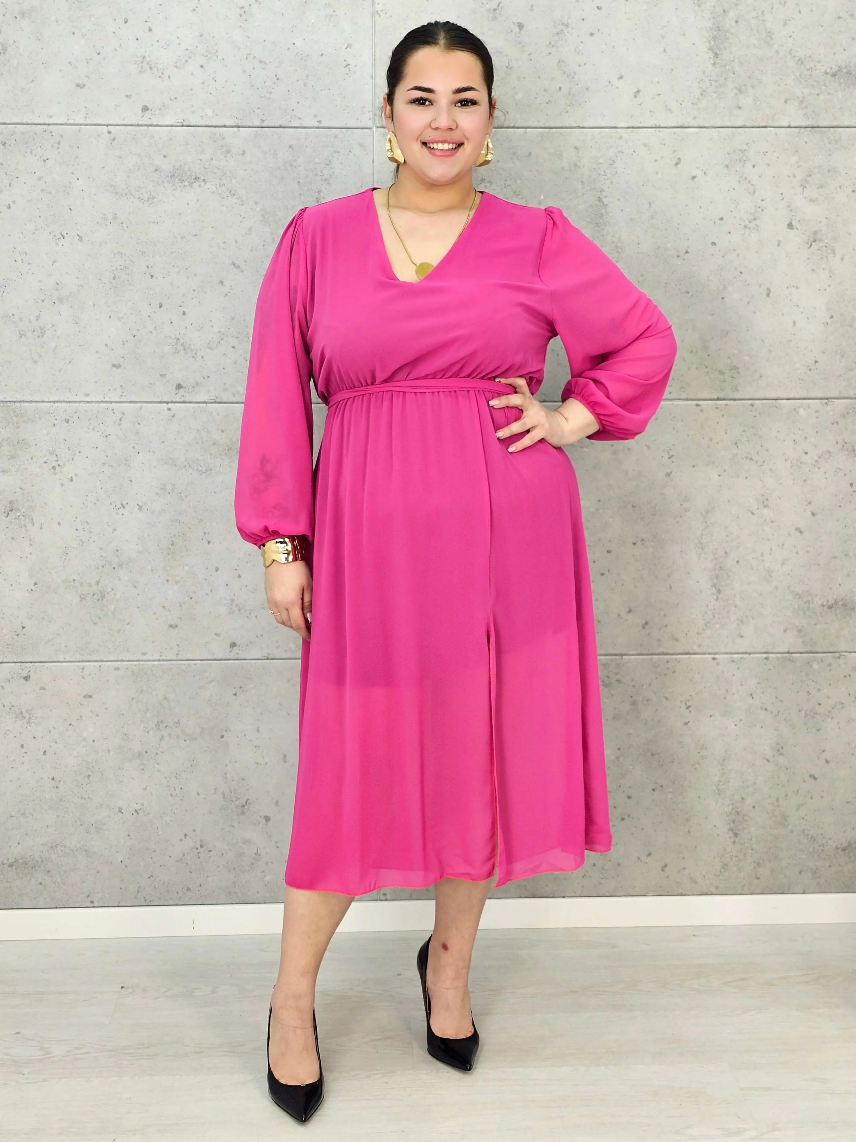 Pasek materiałowy do przewiązania pozwala na dodatkowe, stylowe dopasowanie sukienki plus size do figury oraz nadaje jej bardziej zdefiniowaną i wyszczuplającą sylwetkę. To idealna sukienka plus size na co dzień oraz na wyjątkowe okazje.