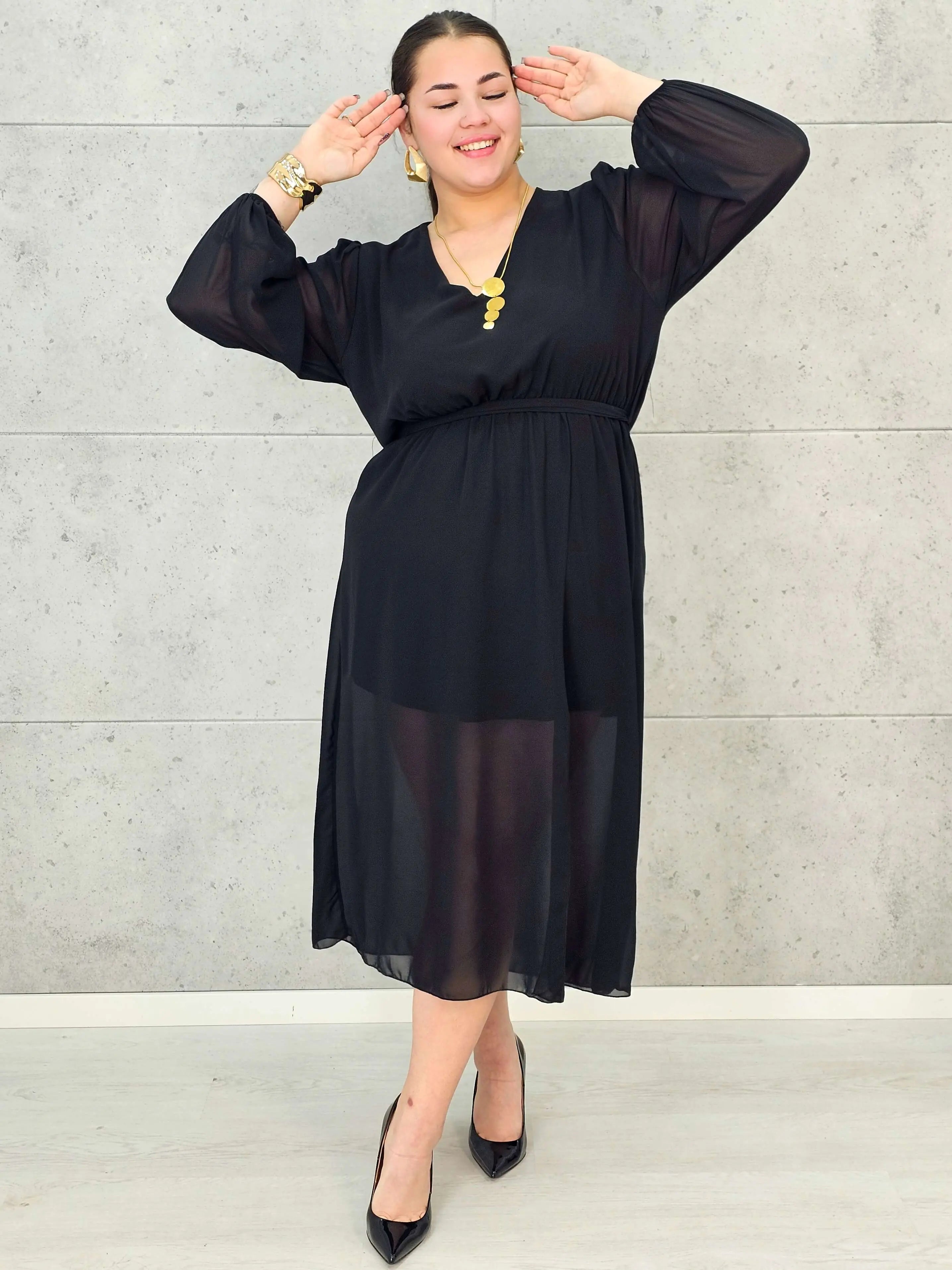 Sukienka Plus Size Dekolt w Serek – Talia z Gumką, Pasek, Podszewka XXL