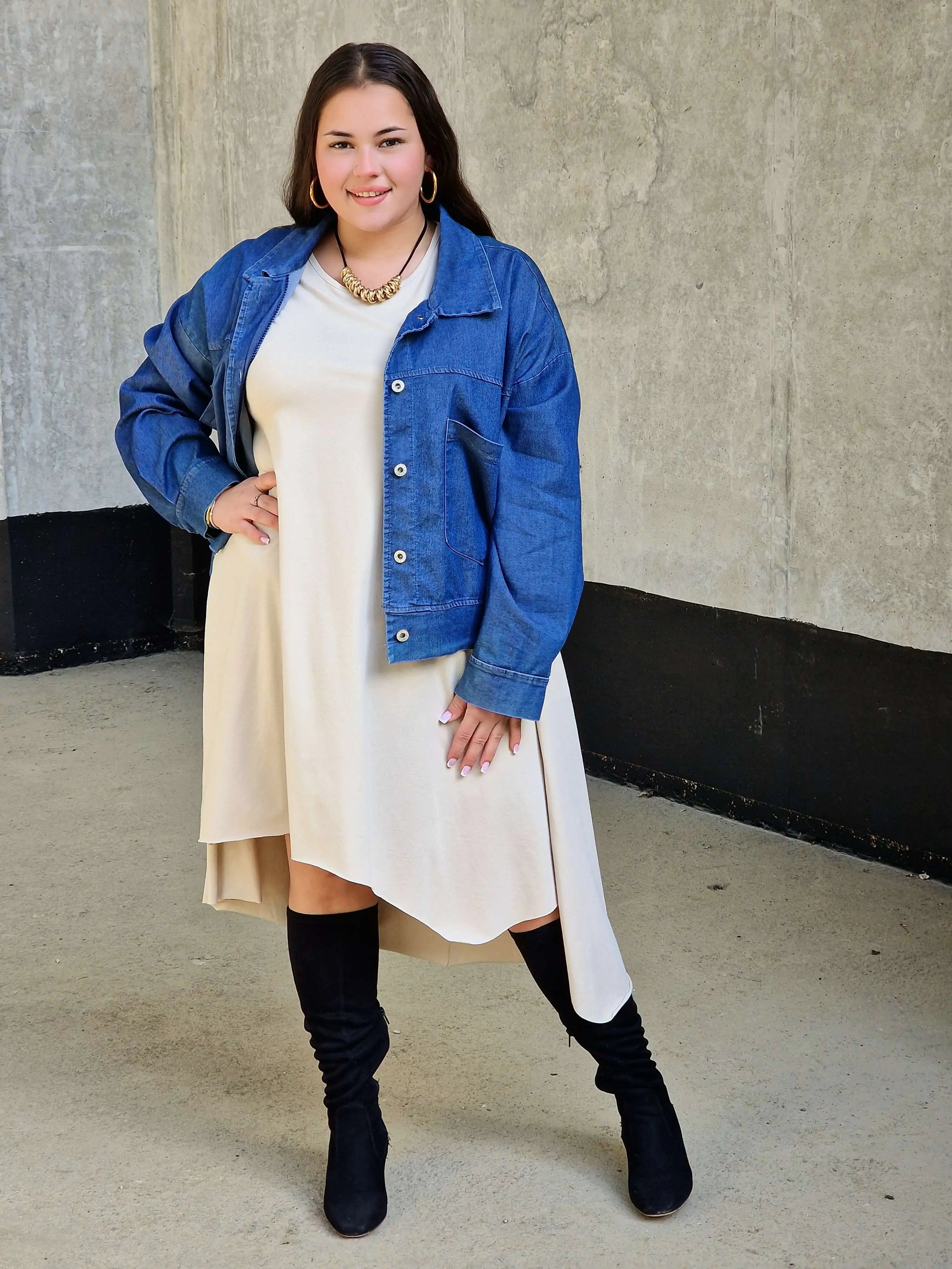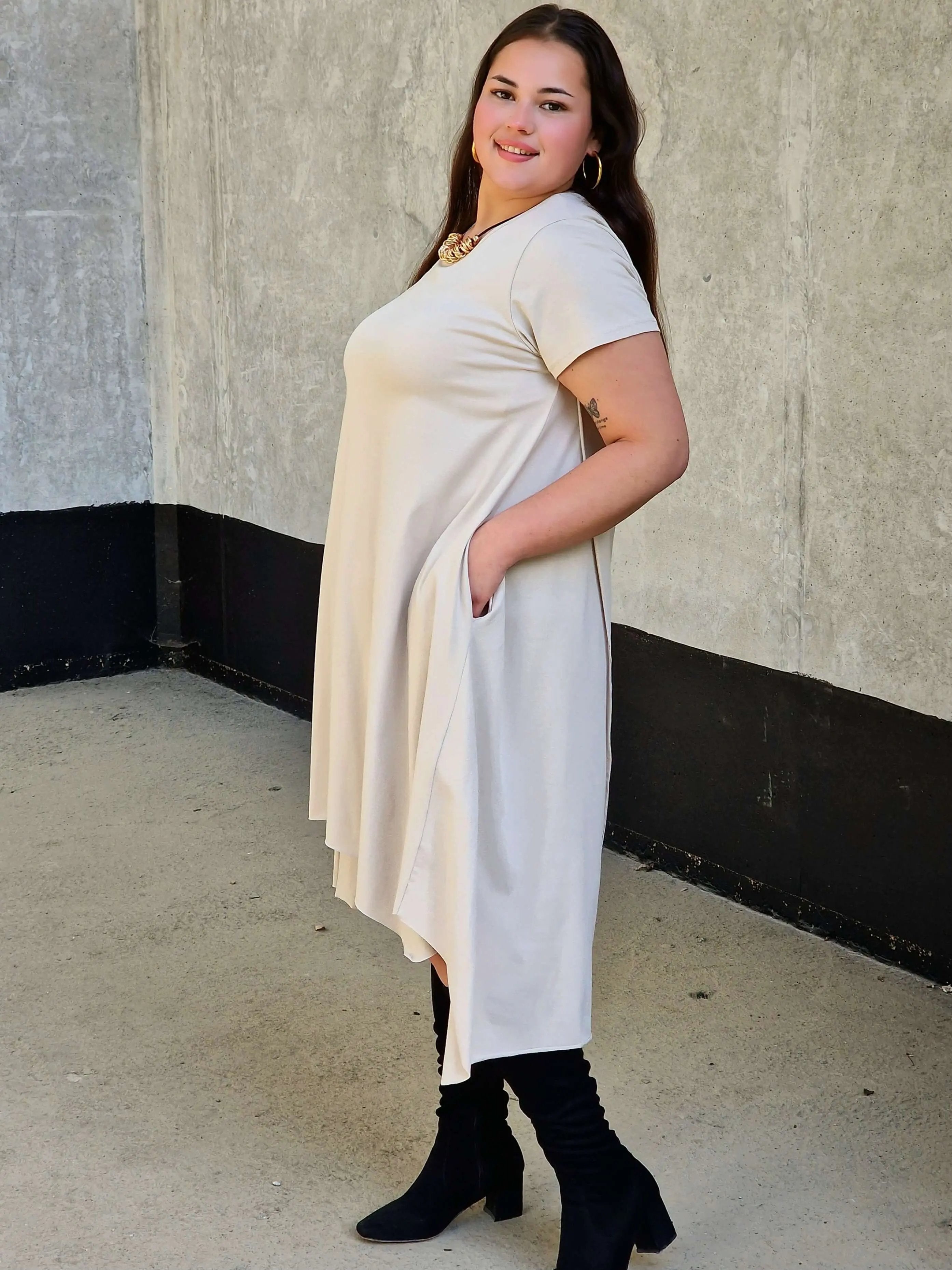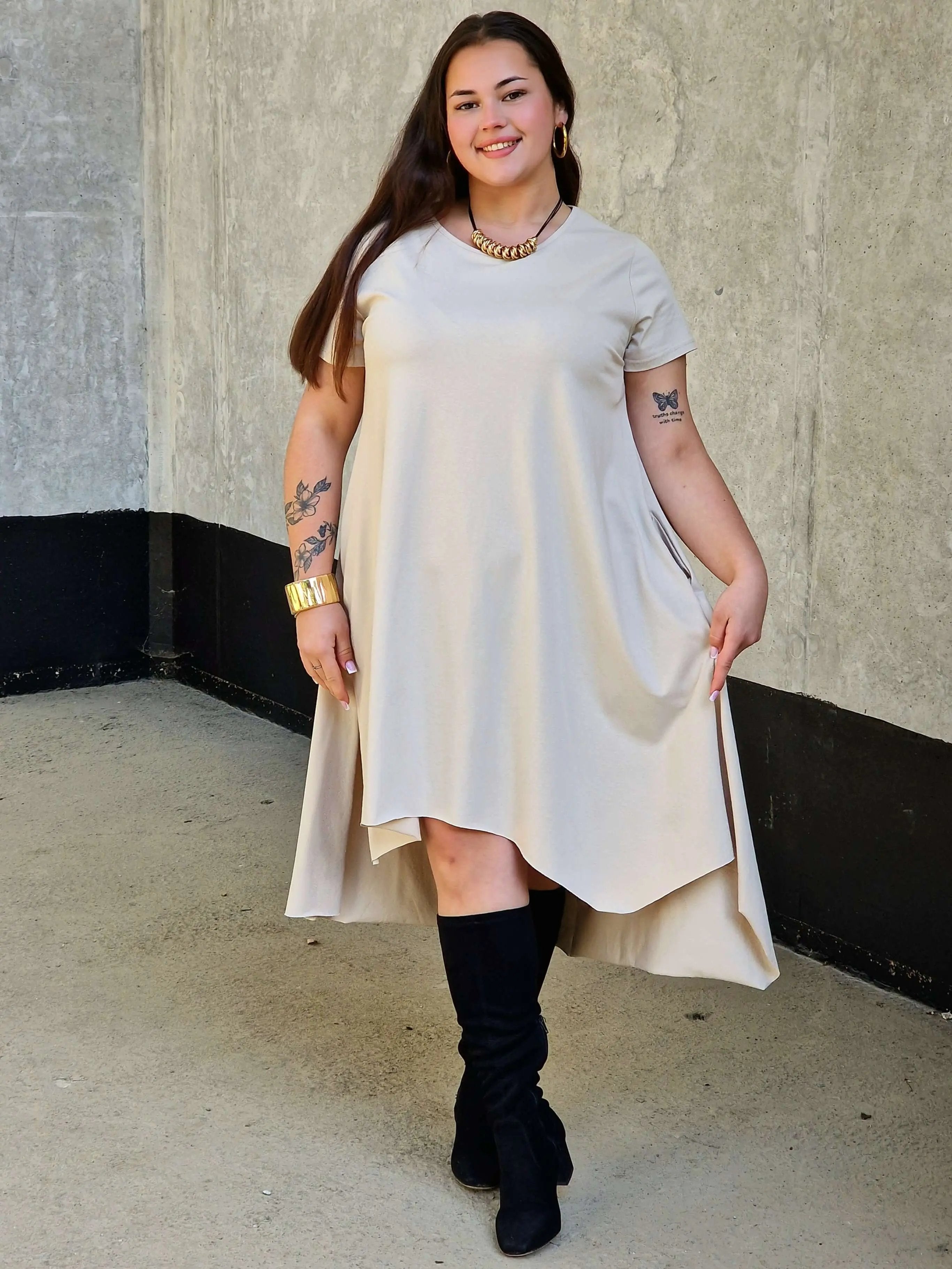 Uszyta z miękkiej, oddychającej bawełny z dodatkiem elastanu, doskonale dopasowuje się do sylwetki i nie krępuje ruchów. Luźny fason oversize pięknie maskuje niedoskonałości, a asymetryczny dół nadaje całości nowoczesnego charakteru. To idealna sukienka na wakacje, spacery czy codzienne wyjścia w mieście.