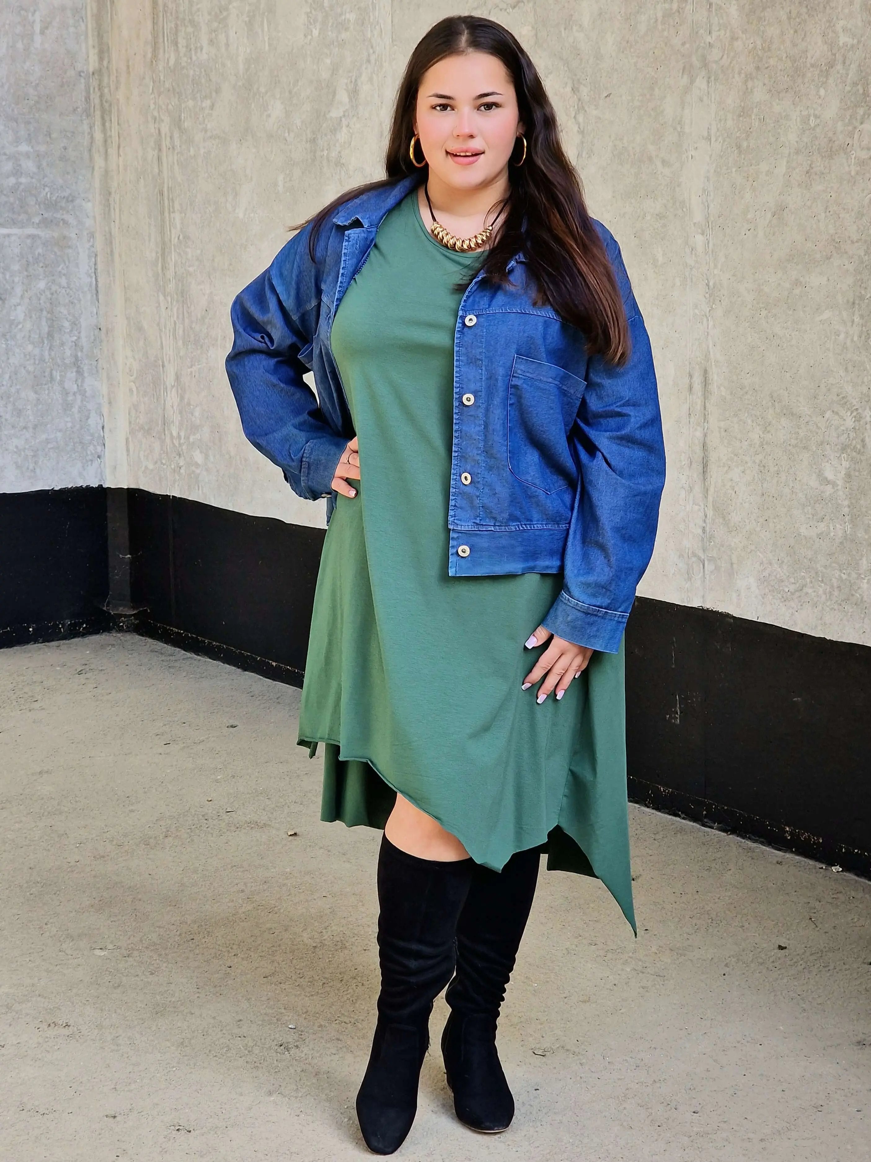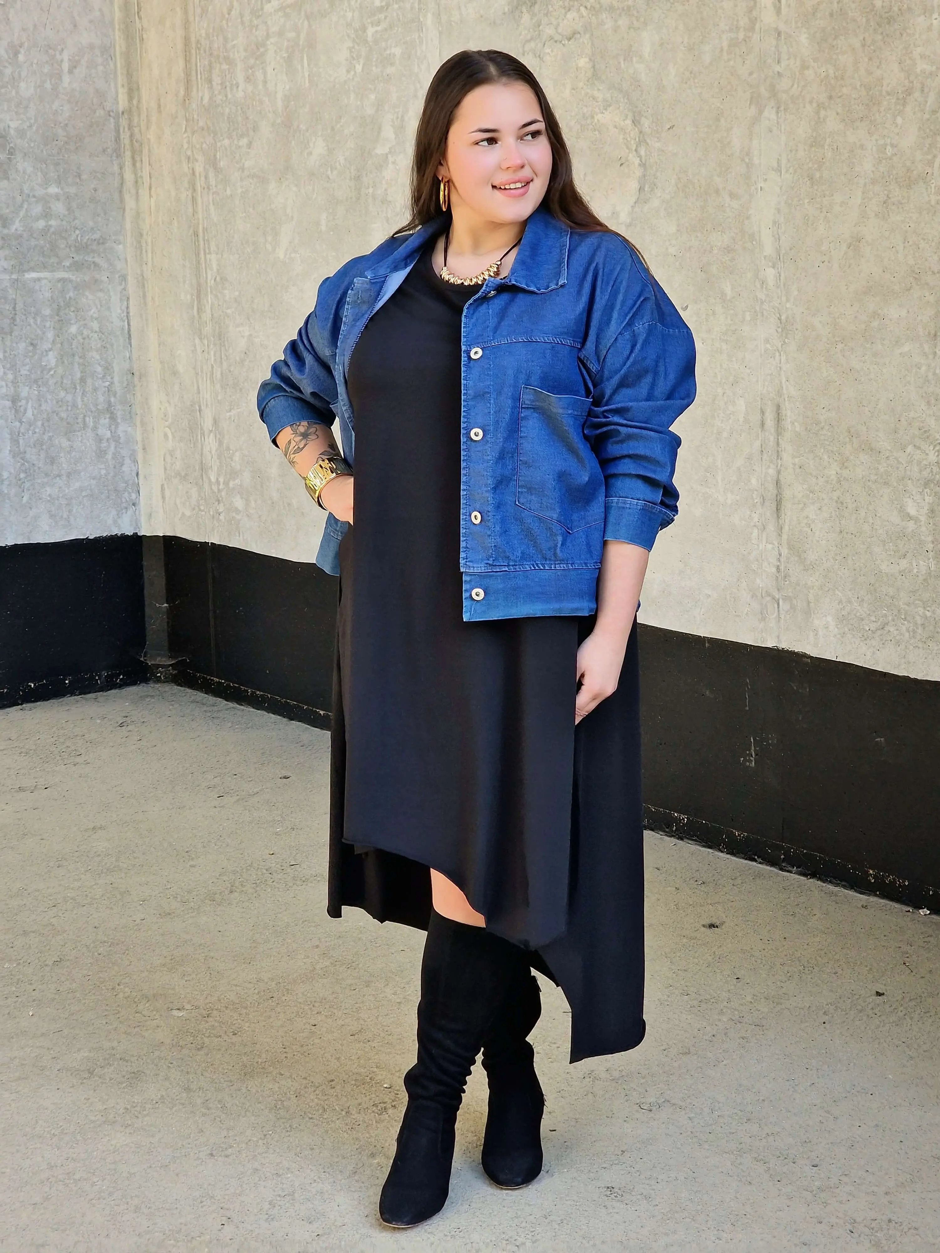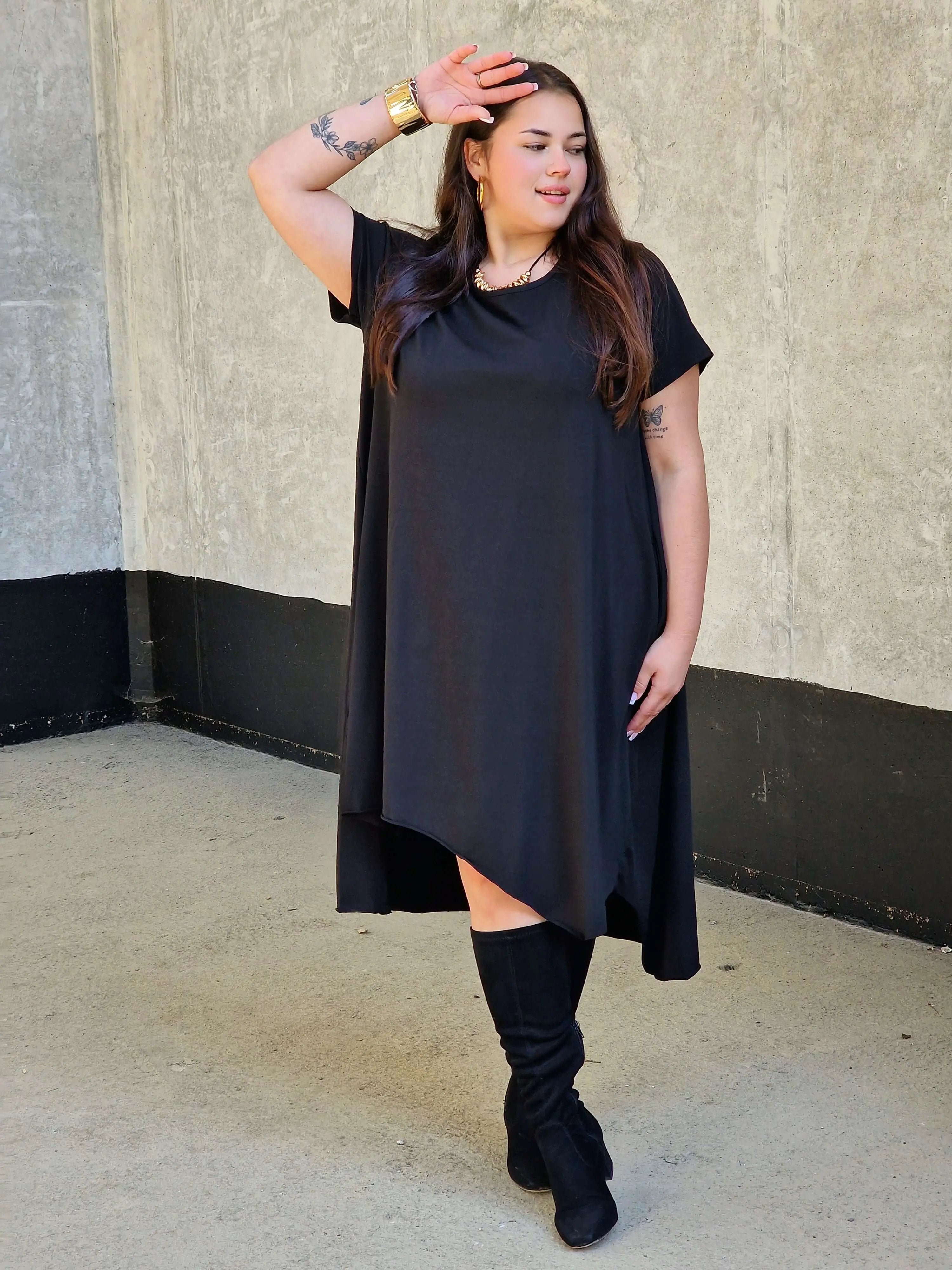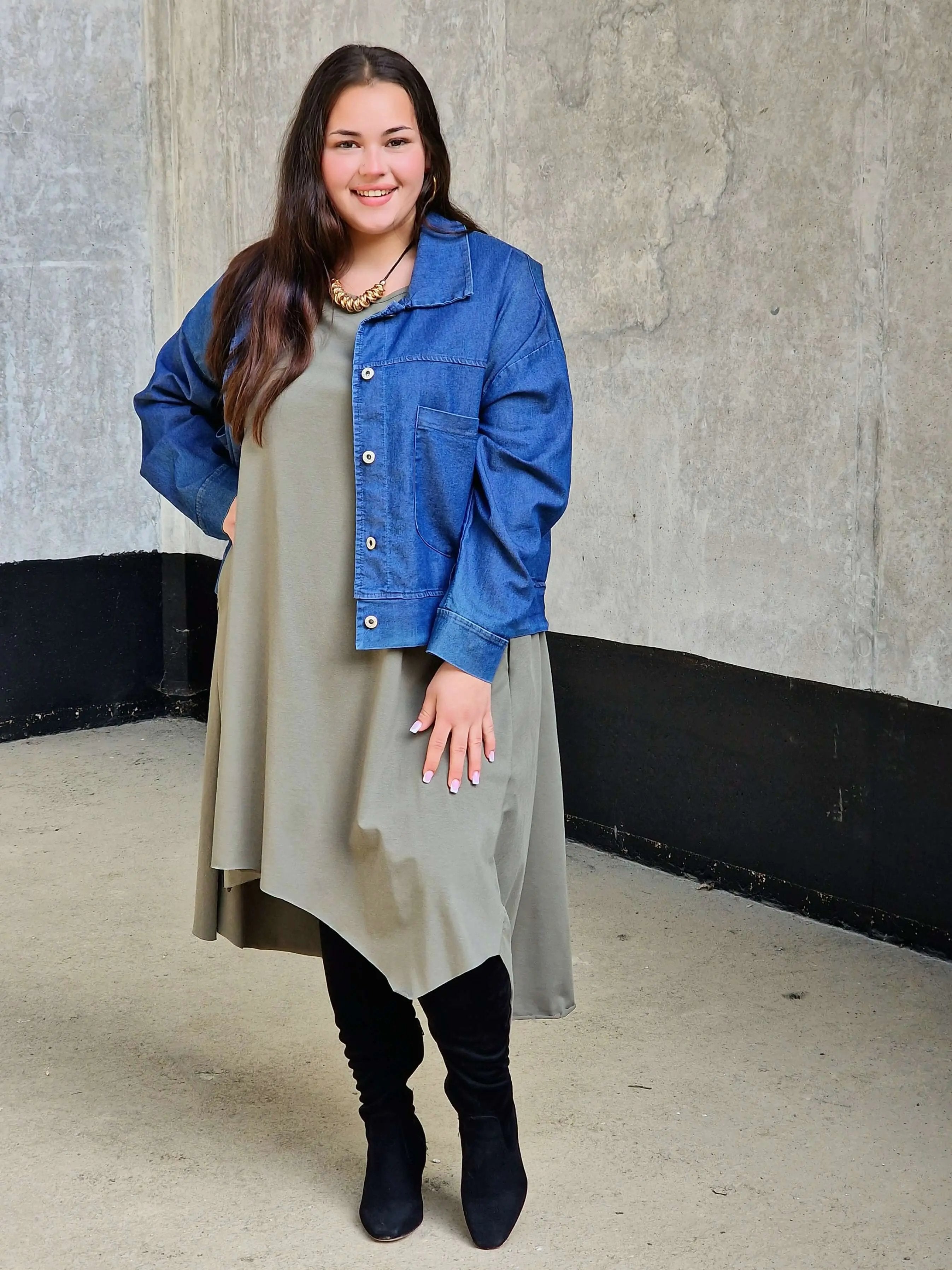 Uszyta z miękkiej, oddychającej bawełny z dodatkiem elastanu, doskonale dopasowuje się do sylwetki i nie krępuje ruchów. Luźny fason oversize pięknie maskuje niedoskonałości, a asymetryczny dół nadaje całości nowoczesnego charakteru. To idealna sukienka na wakacje, spacery czy codzienne wyjścia w mieście.