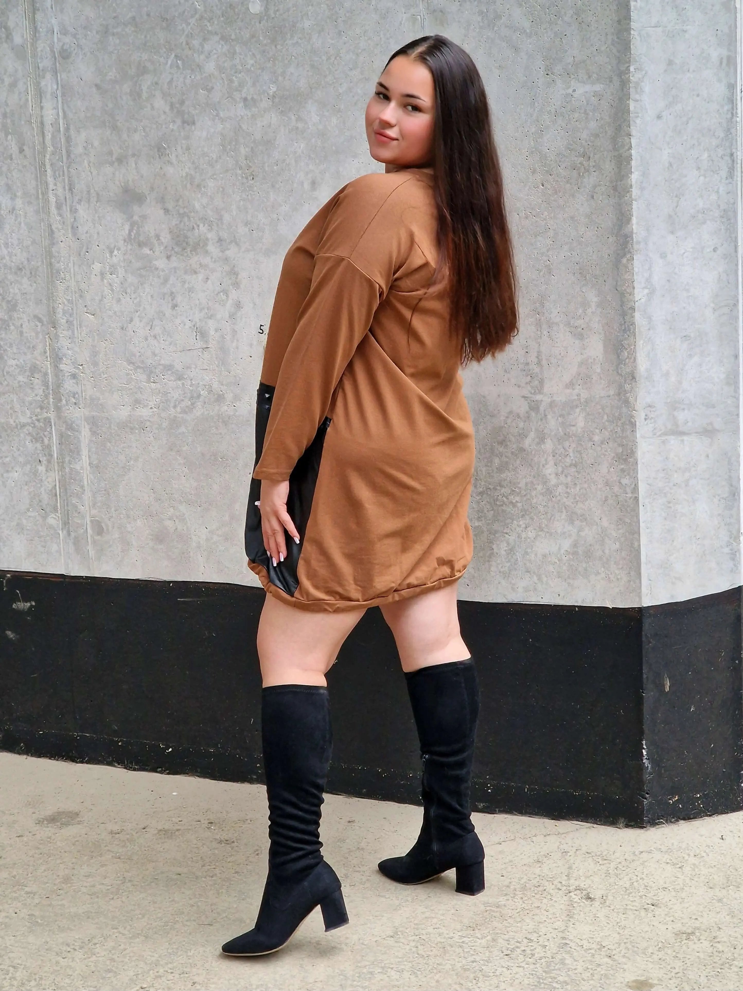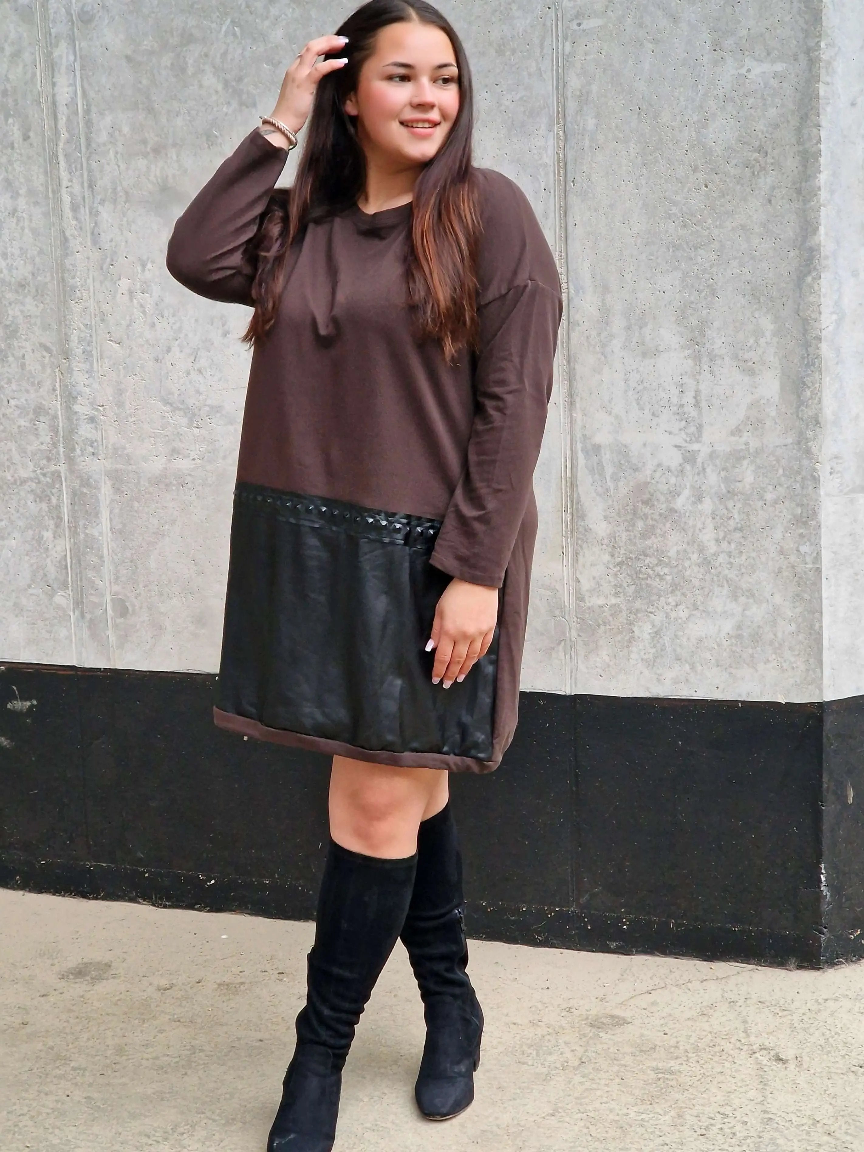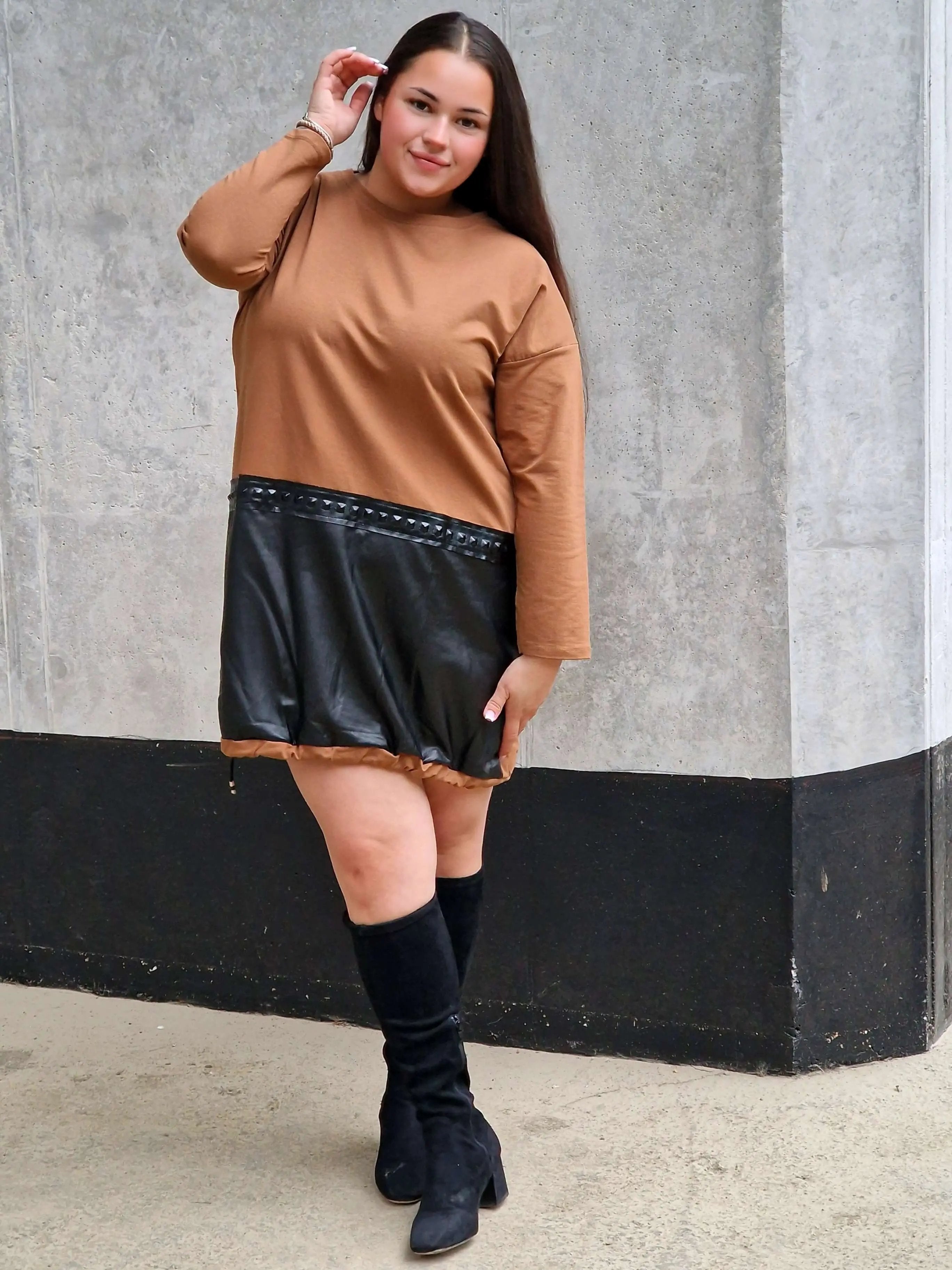 Ta sukienka z eko-skórą to absolutny MUST HAVE dla kobiet, które kochają wyróżniać się z tłumu 😍 Połączenie miękkiej dzianiny z efektownym panelem ze skóry daje niepowtarzalny efekt – modny, odważny i kobiecy ✨