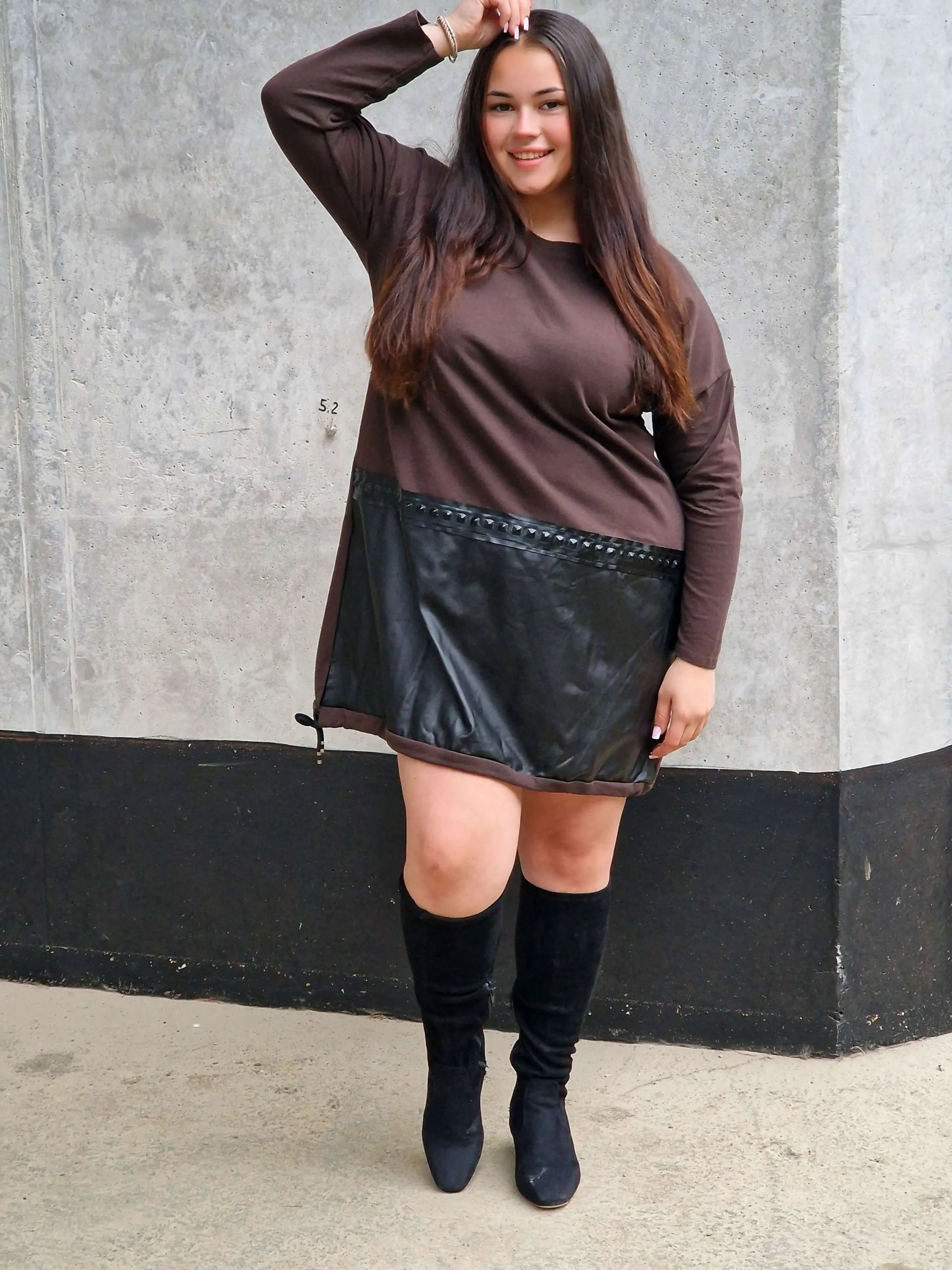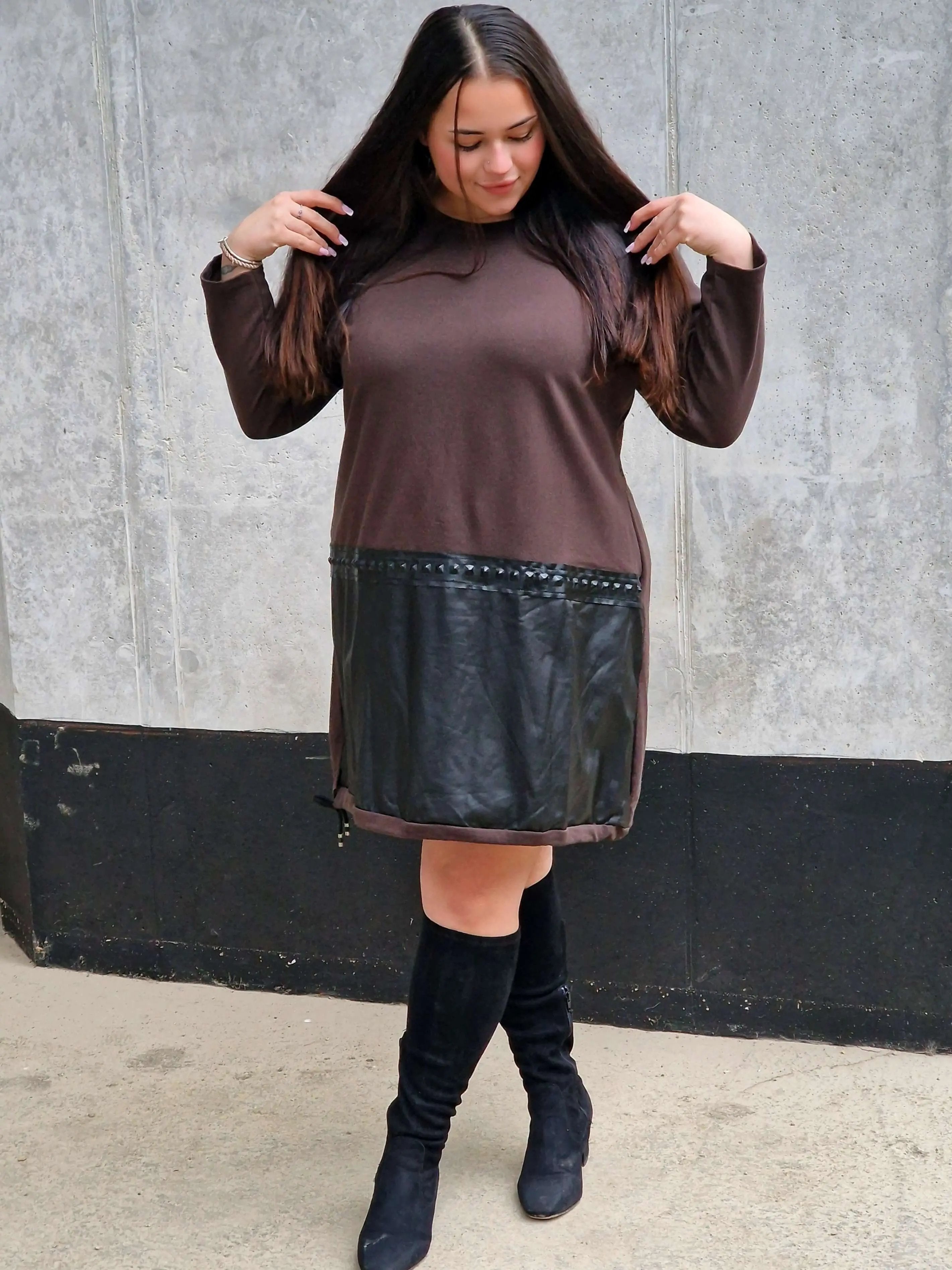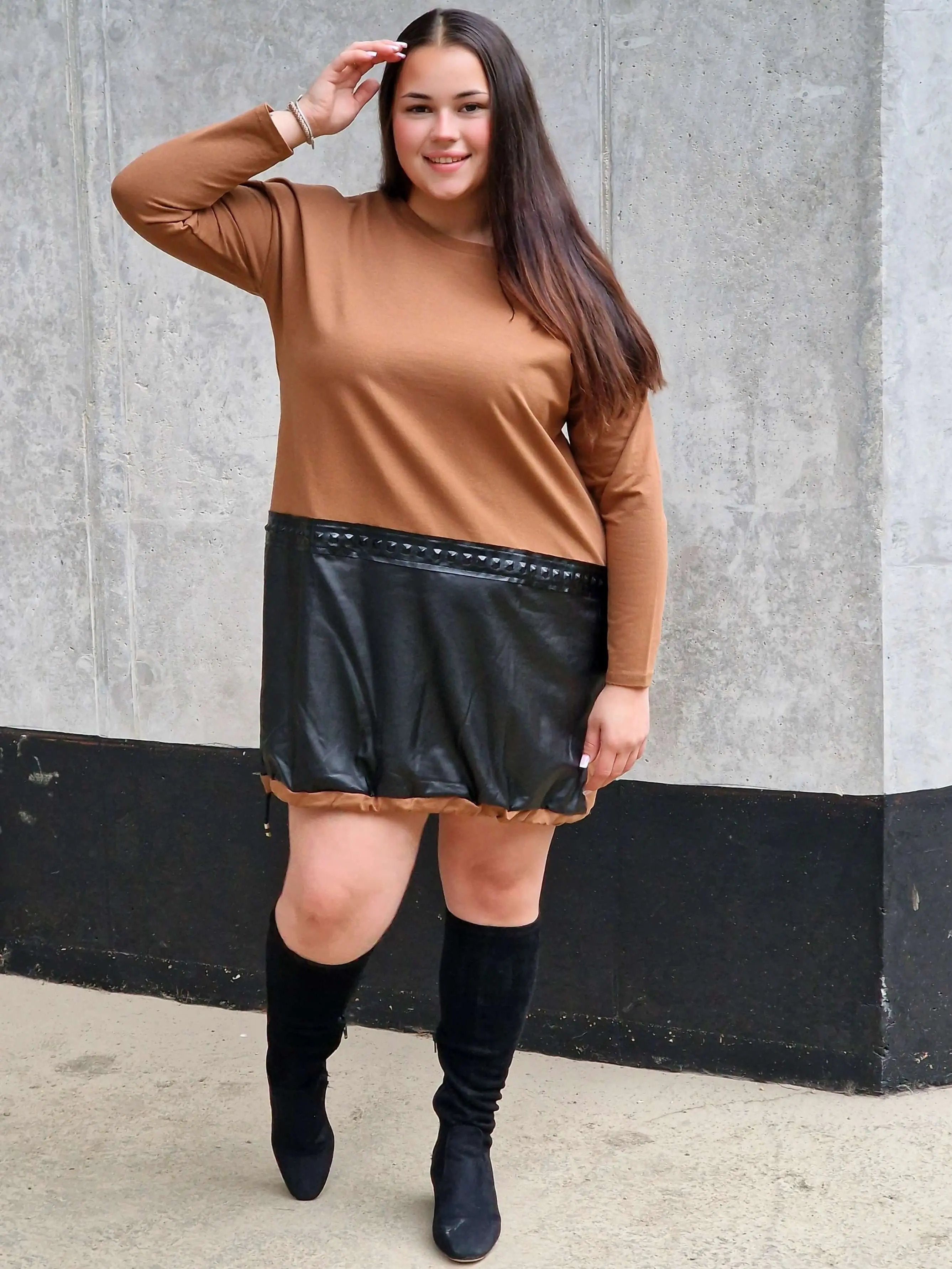 Ta sukienka z eko-skórą to absolutny MUST HAVE dla kobiet, które kochają wyróżniać się z tłumu 😍 Połączenie miękkiej dzianiny z efektownym panelem ze skóry daje niepowtarzalny efekt – modny, odważny i kobiecy ✨
