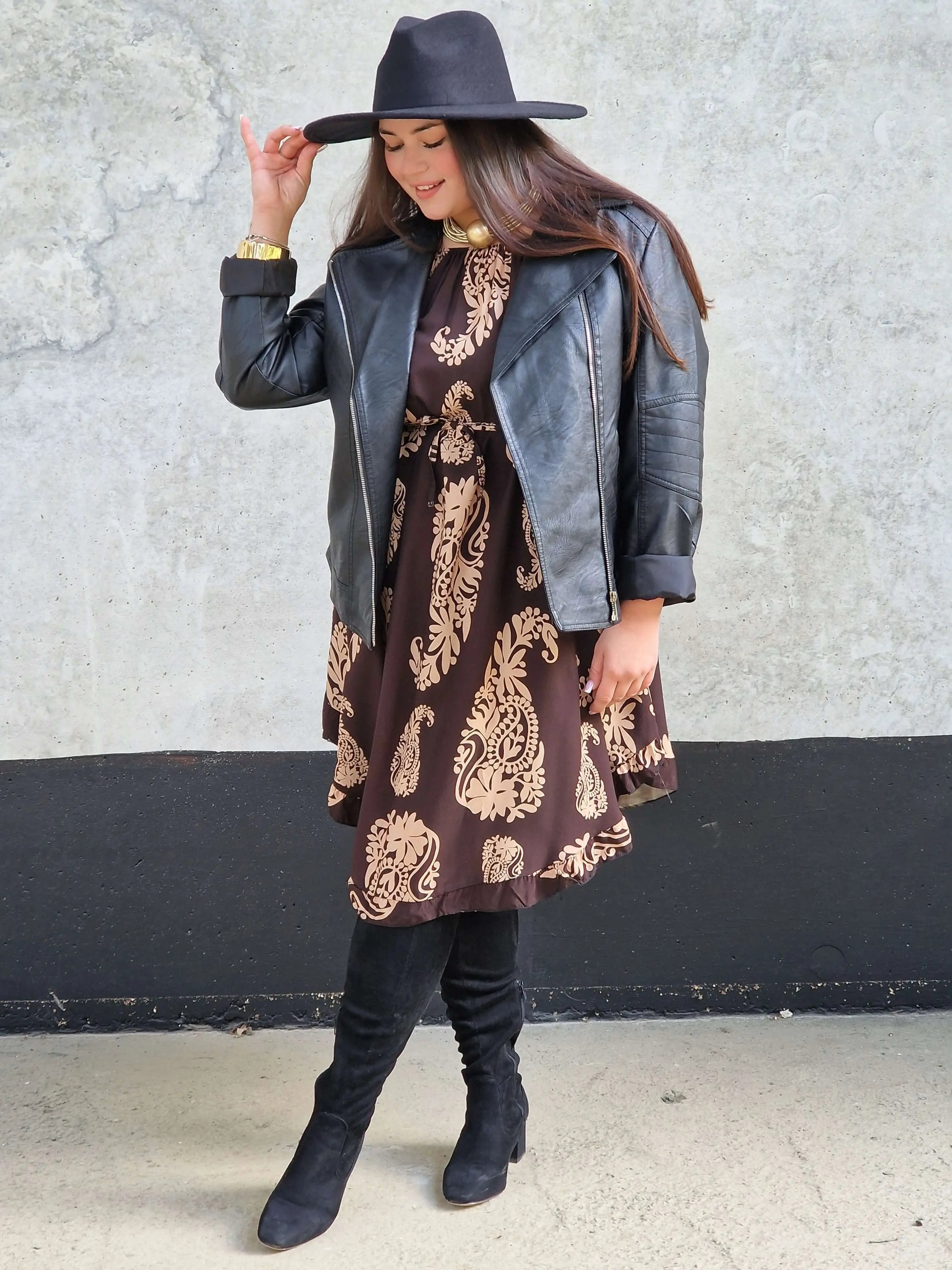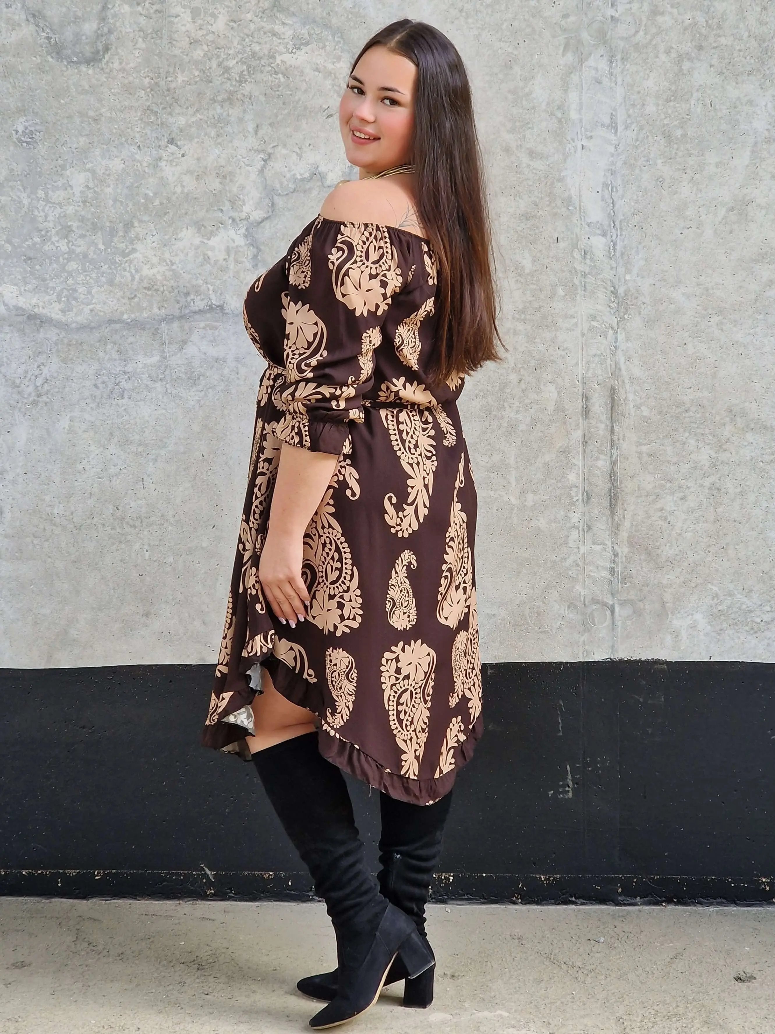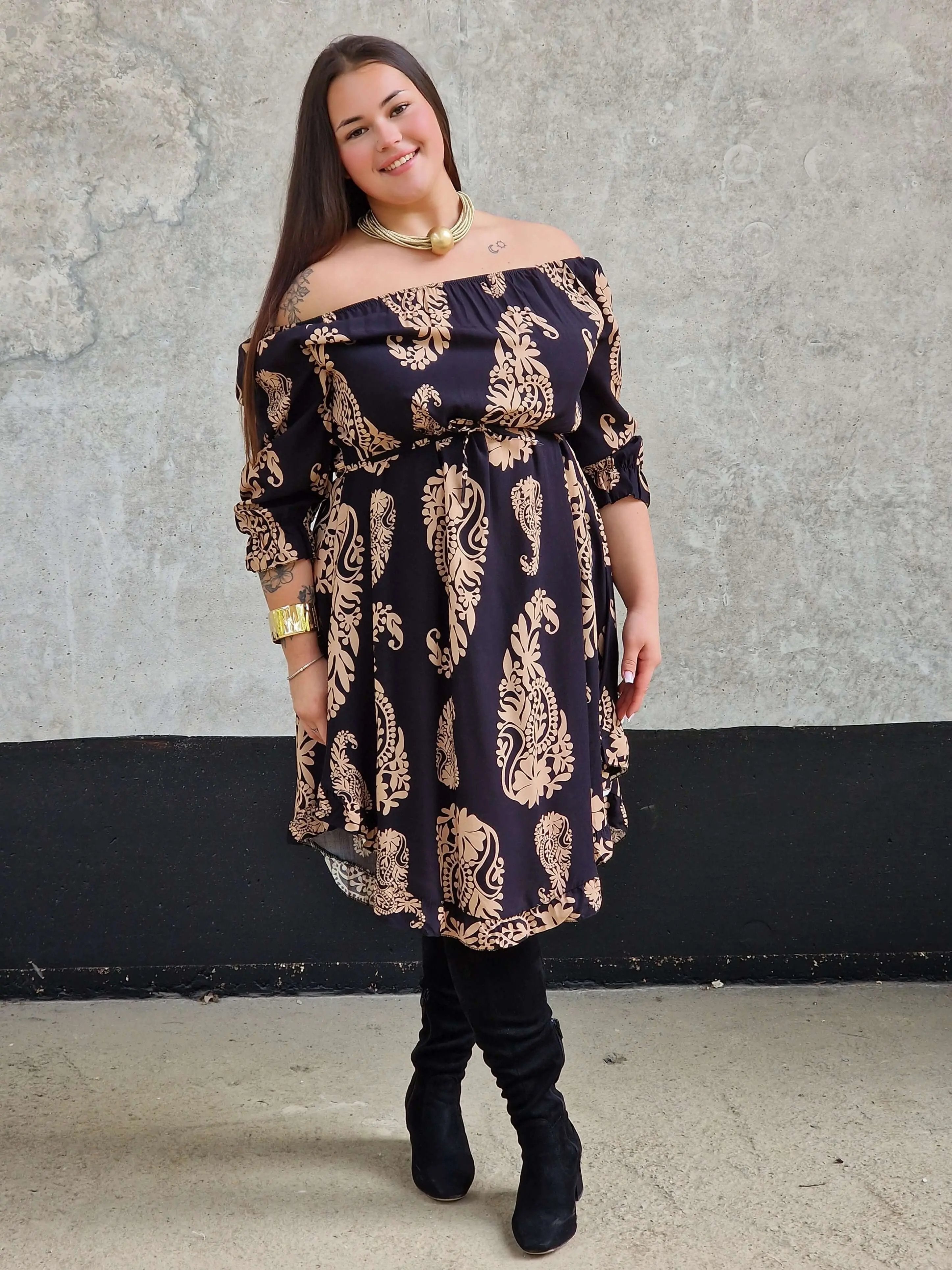 Sukienka hiszpanka plus size StylowaXL to połączenie elegancji i swobody, które zachwyca przy każdym ruchu. Jej wyjątkowy design łączy czarną tkaninę z beżowym, orientalnym wzorem, tworząc stylizację o niepowtarzalnym charakterze – kobiecą, zmysłową i pełną lekkości.