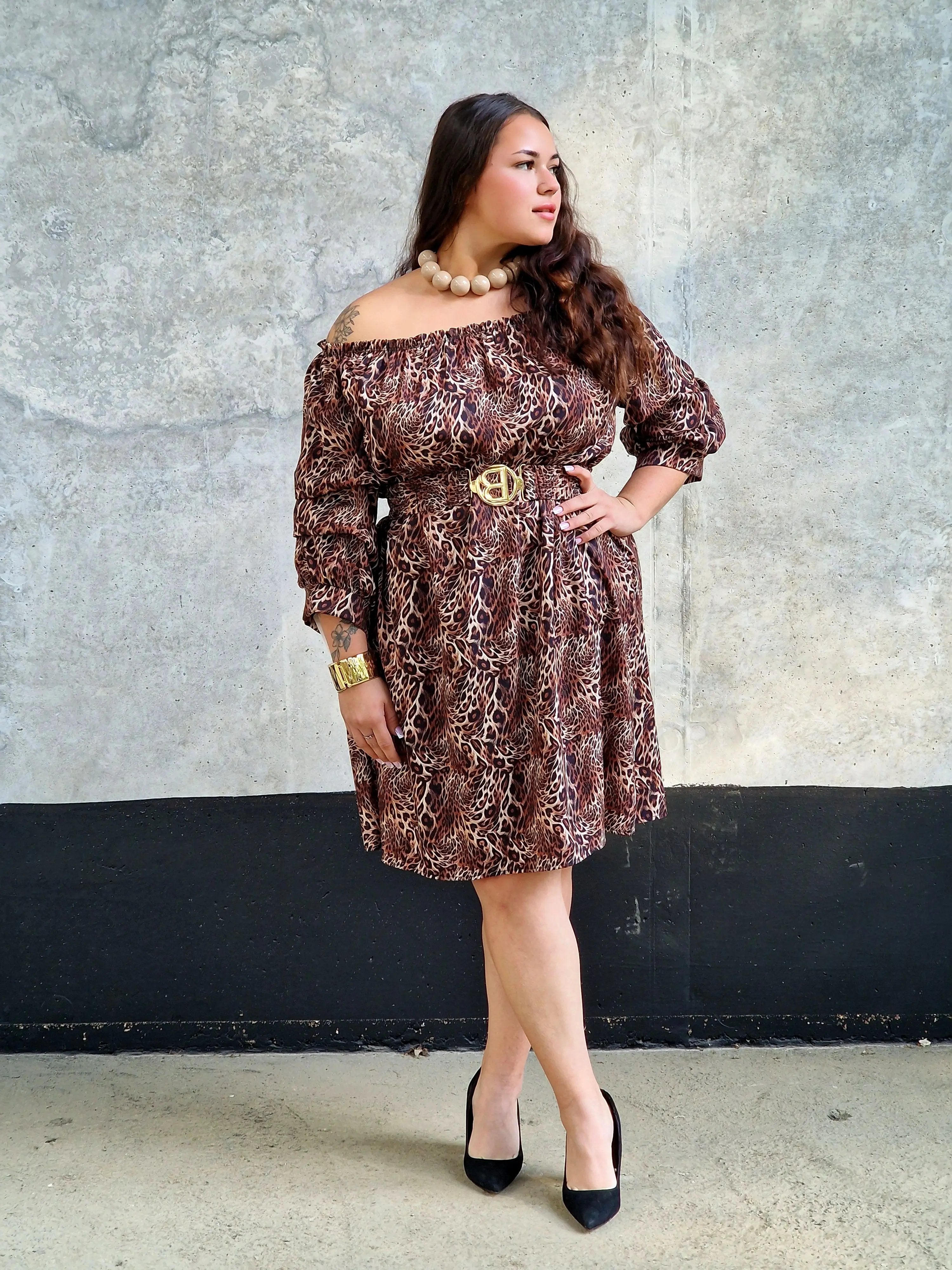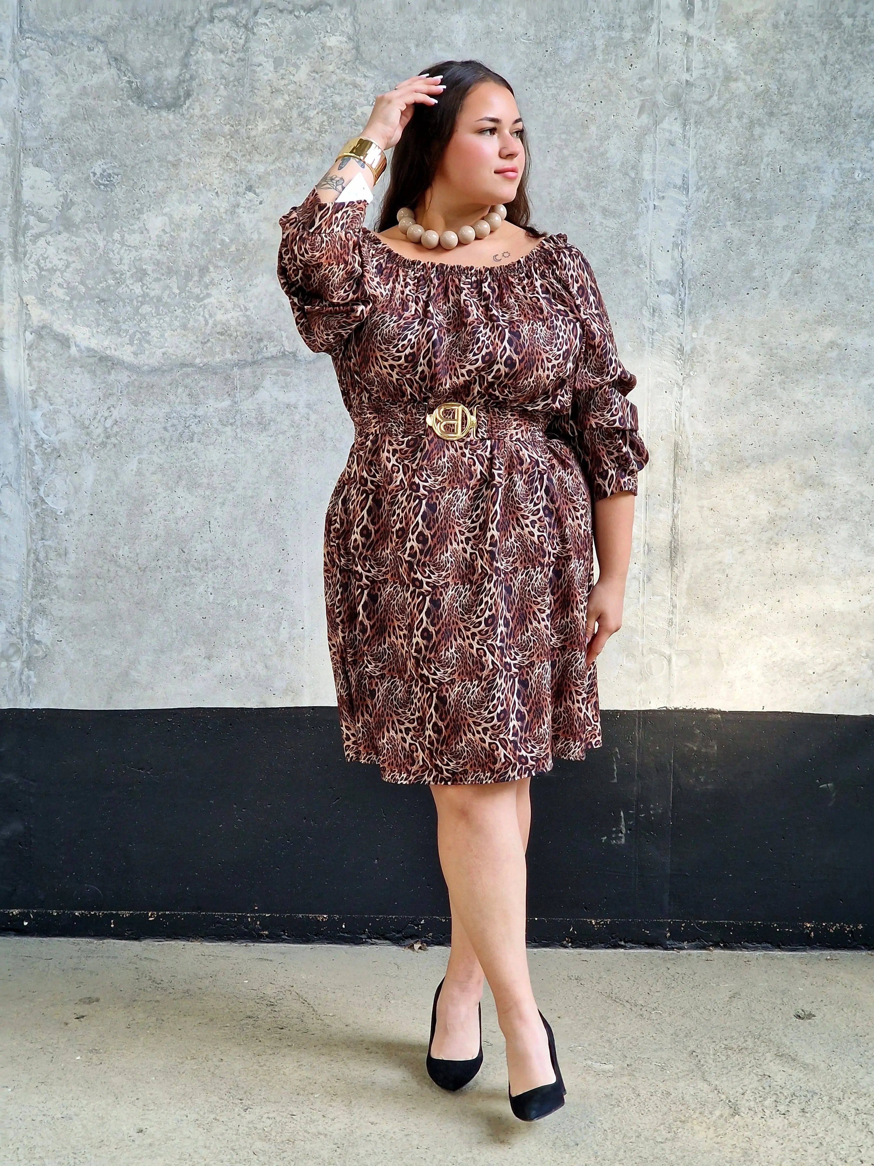 Sukienka przyciąga wzrok efektownym, zwierzęcym printem, idealnym na letnie spacery lub wieczorne wyjścia. Szeroki dekolt typu "off-shoulder" subtelnie eksponuje ramiona, podkreślając kobiecą sylwetkę. Marszczone, falbaniaste rękawy dodają całości delikatności i finezji, a elastyczna gumka w talii zapewnia wygodę noszenia.