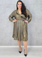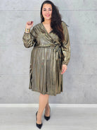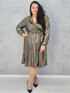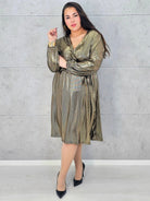 Sukienka plus size z efektem „WOW”, ta sukienka jest dla Ciebie! Srebrny materiał o holograficznym blasku przyciąga spojrzenia i idealnie odbija światło – zarówno na parkiecie, jak i podczas uroczystych okazji. Kopertowy dekolt pięknie podkreśla biust, a pasek w talii modeluje sylwetkę. W tej sukience poczujesz się wyjątkowo – bo właśnie taka jesteś!