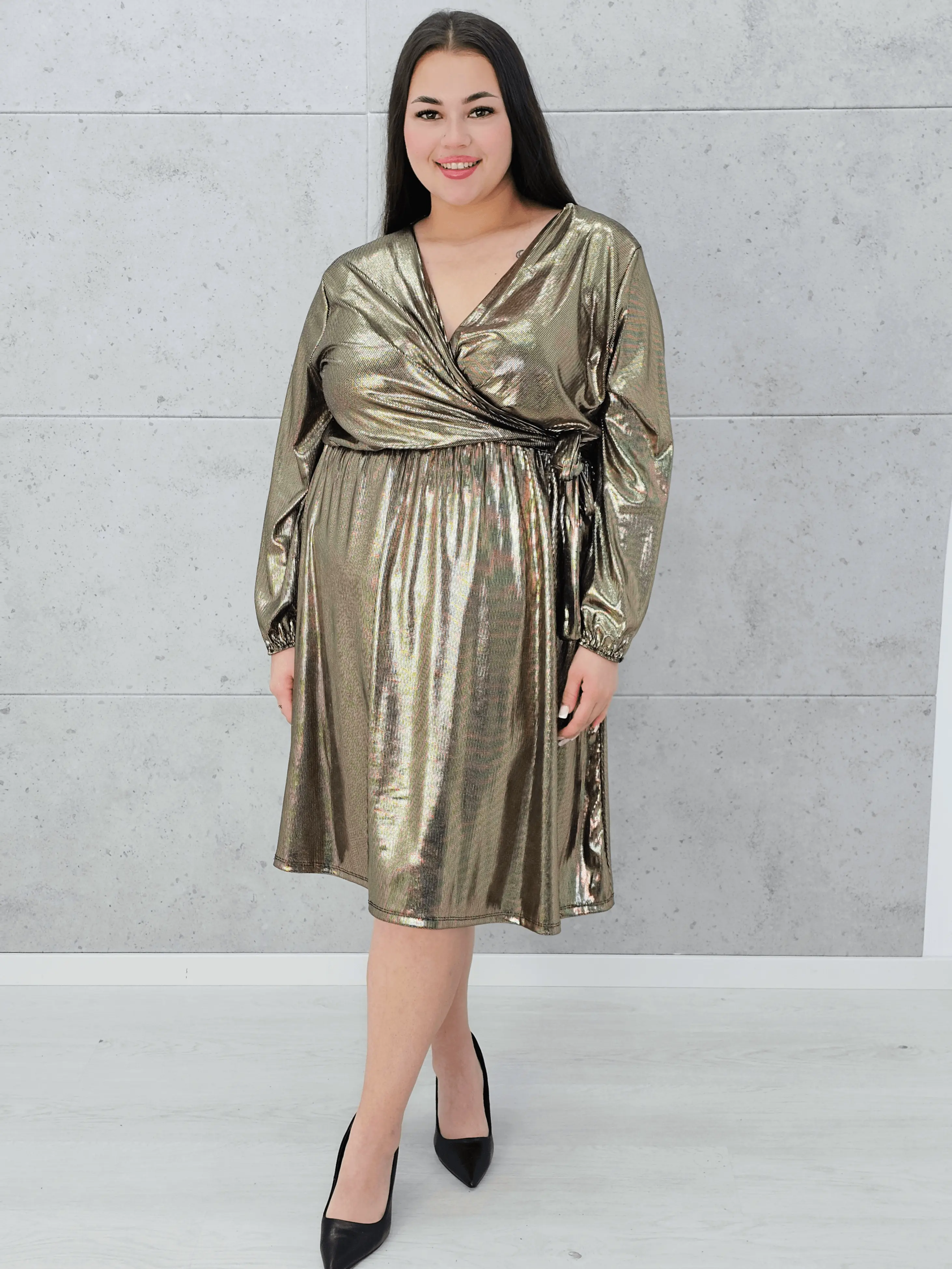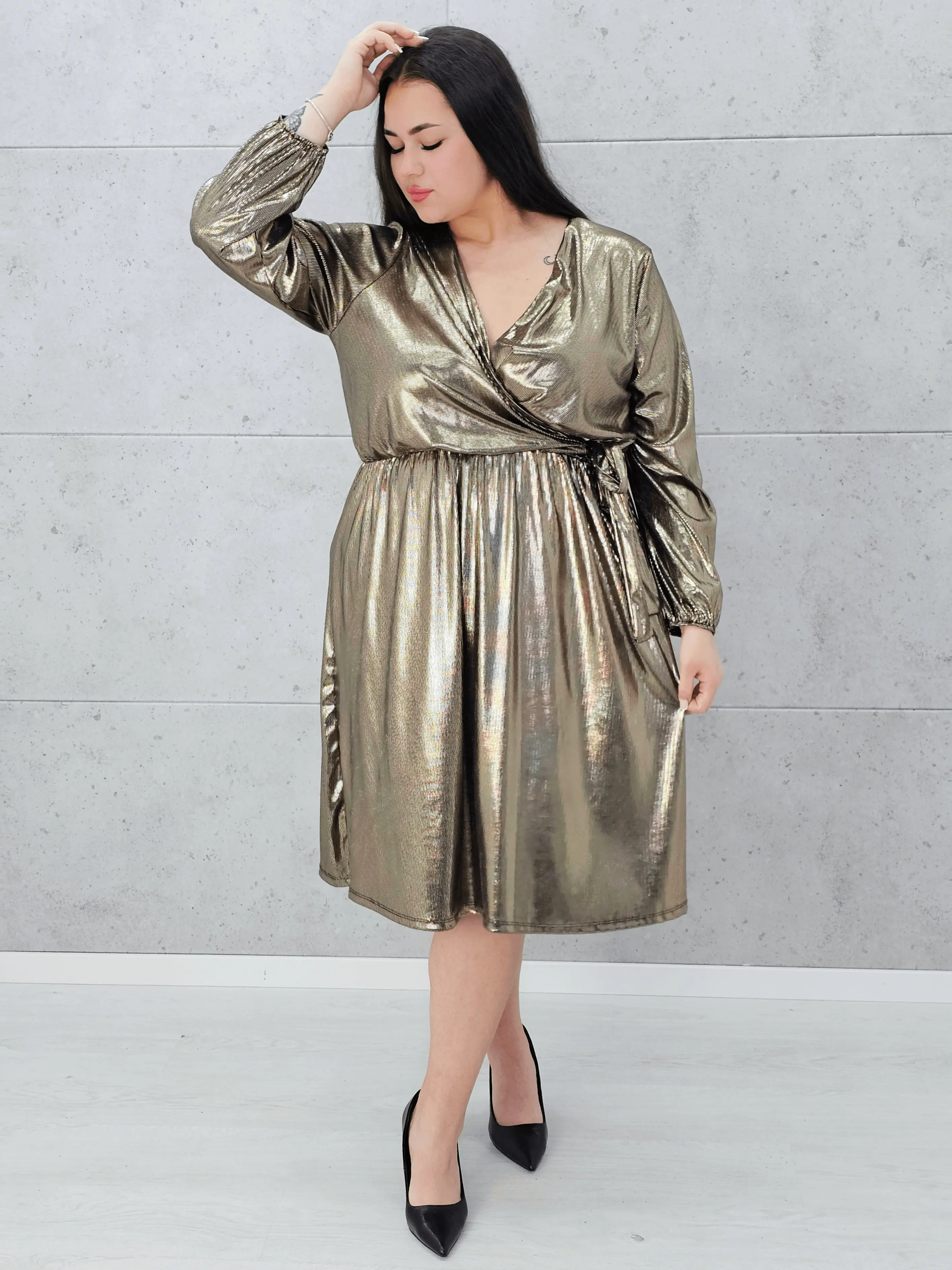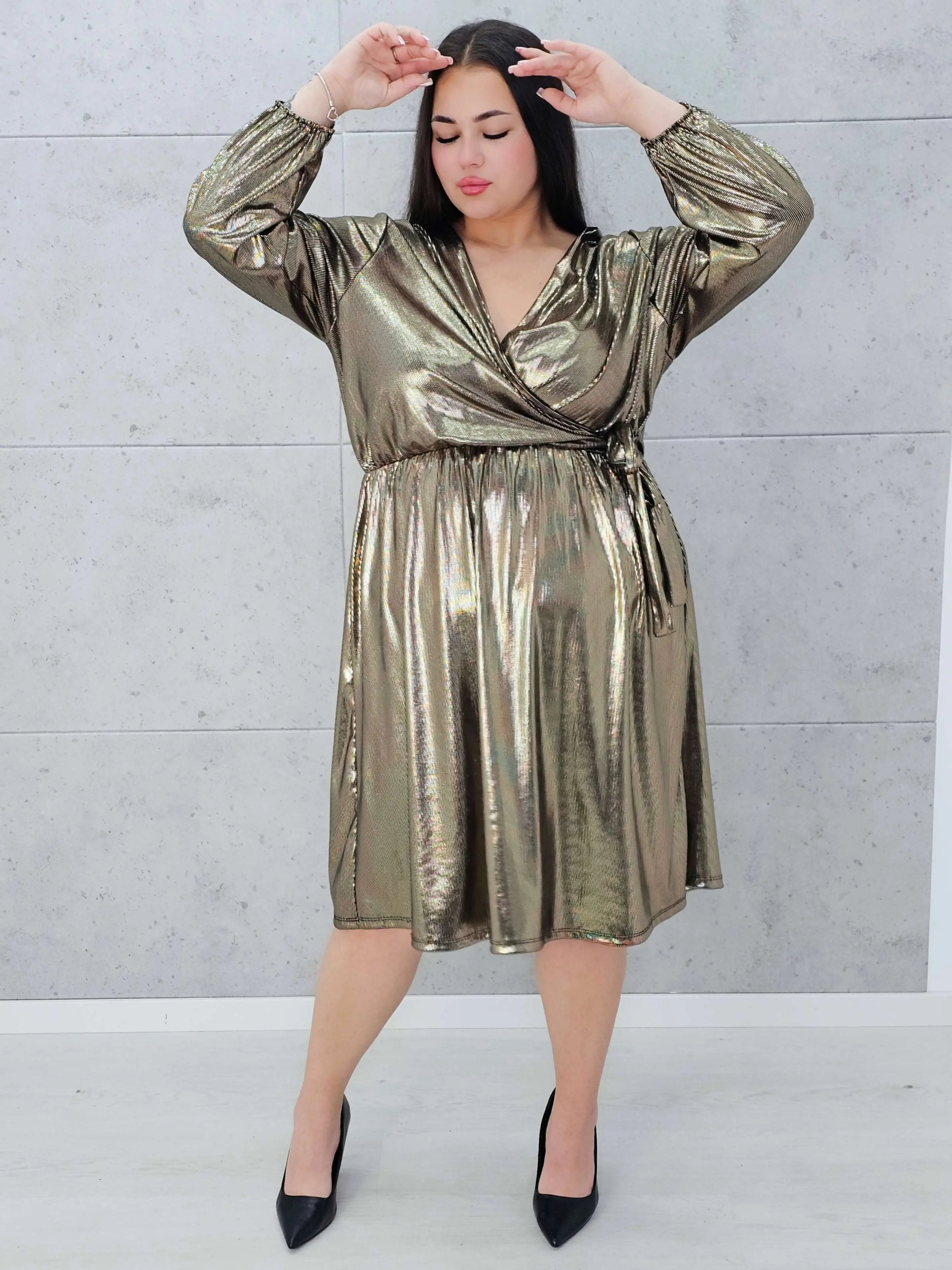 Jeśli kochasz efekt „WOW”, ta sukienka jest dla Ciebie! Srebrny materiał o holograficznym blasku przyciąga spojrzenia i idealnie odbija światło – zarówno na parkiecie, jak i podczas uroczystych okazji. Kopertowy dekolt pięknie podkreśla biust, a pasek w talii modeluje sylwetkę. W tej sukience poczujesz się wyjątkowo – bo właśnie taka jesteś!