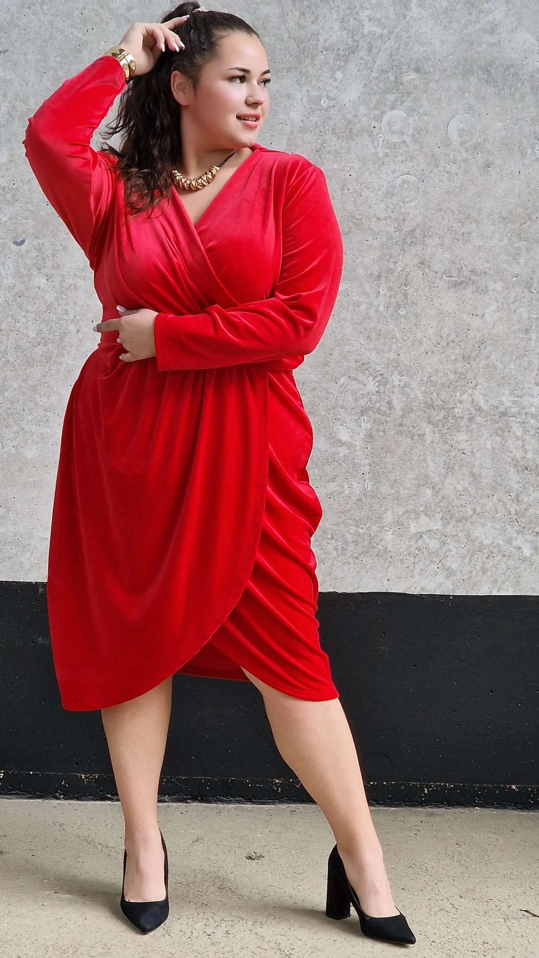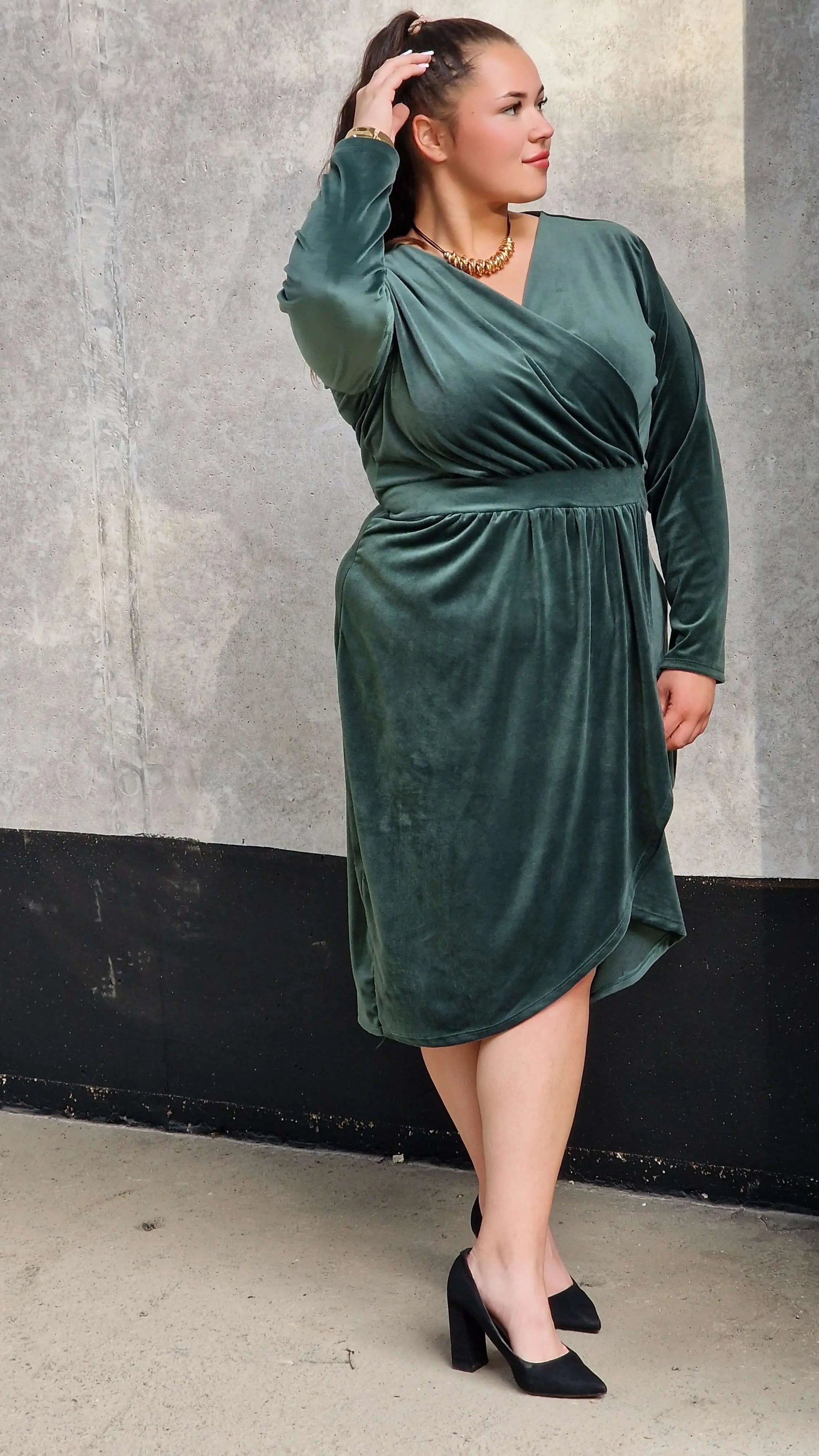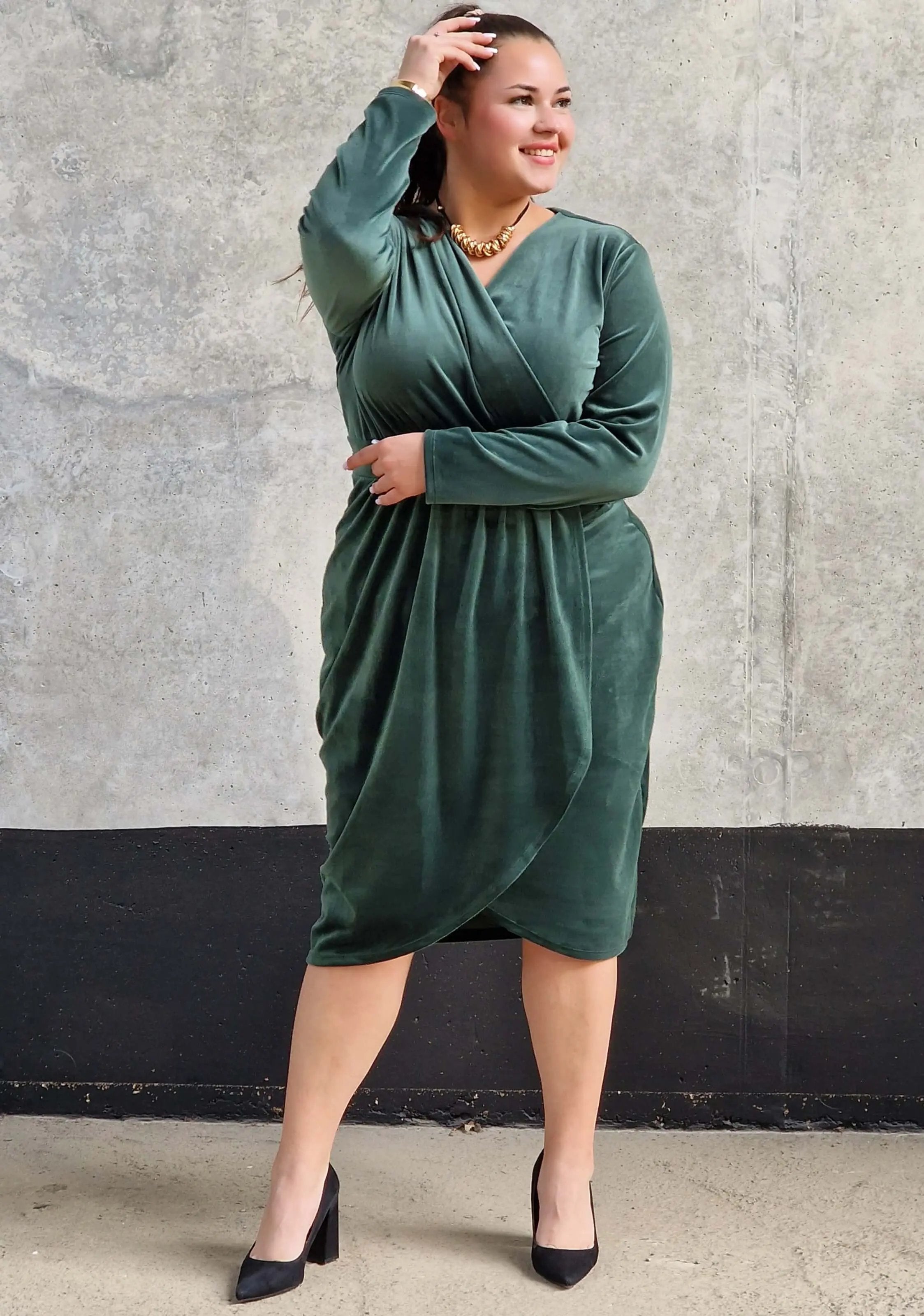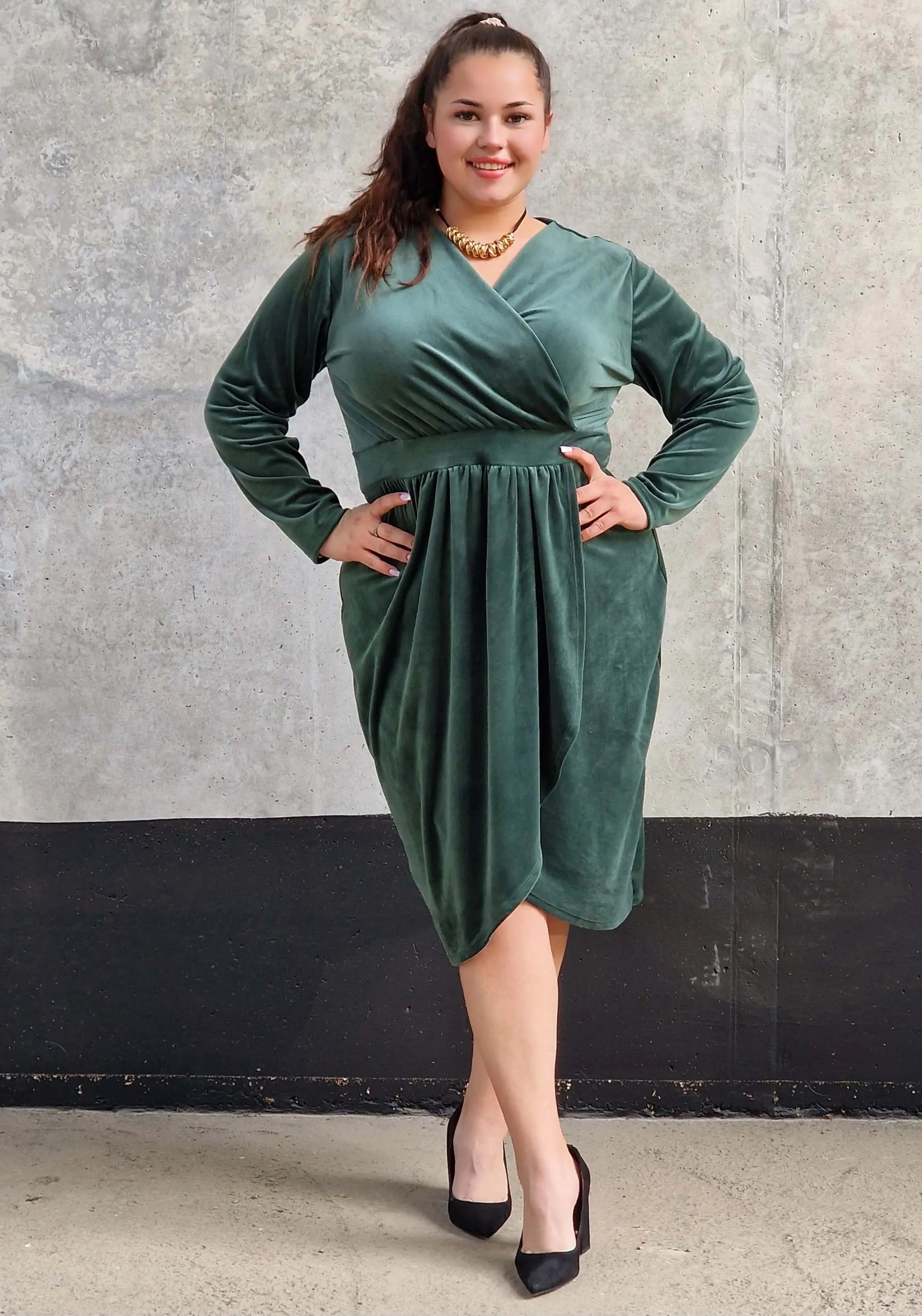 Szukasz sukienki, która połączy wygodę z elegancją? Ten welurowy model to prawdziwy hit! Miękki materiał otula ciało, a zakładany krój pięknie podkreśla kobiecą sylwetkę. Kopertowy dekolt, szeroki pas i efektowne drapowanie sprawiają, że wygląda zjawiskowo – zarówno w wersji dziennej, jak i wieczorowej. Do wyboru aż cztery kolory – wybierz swój!