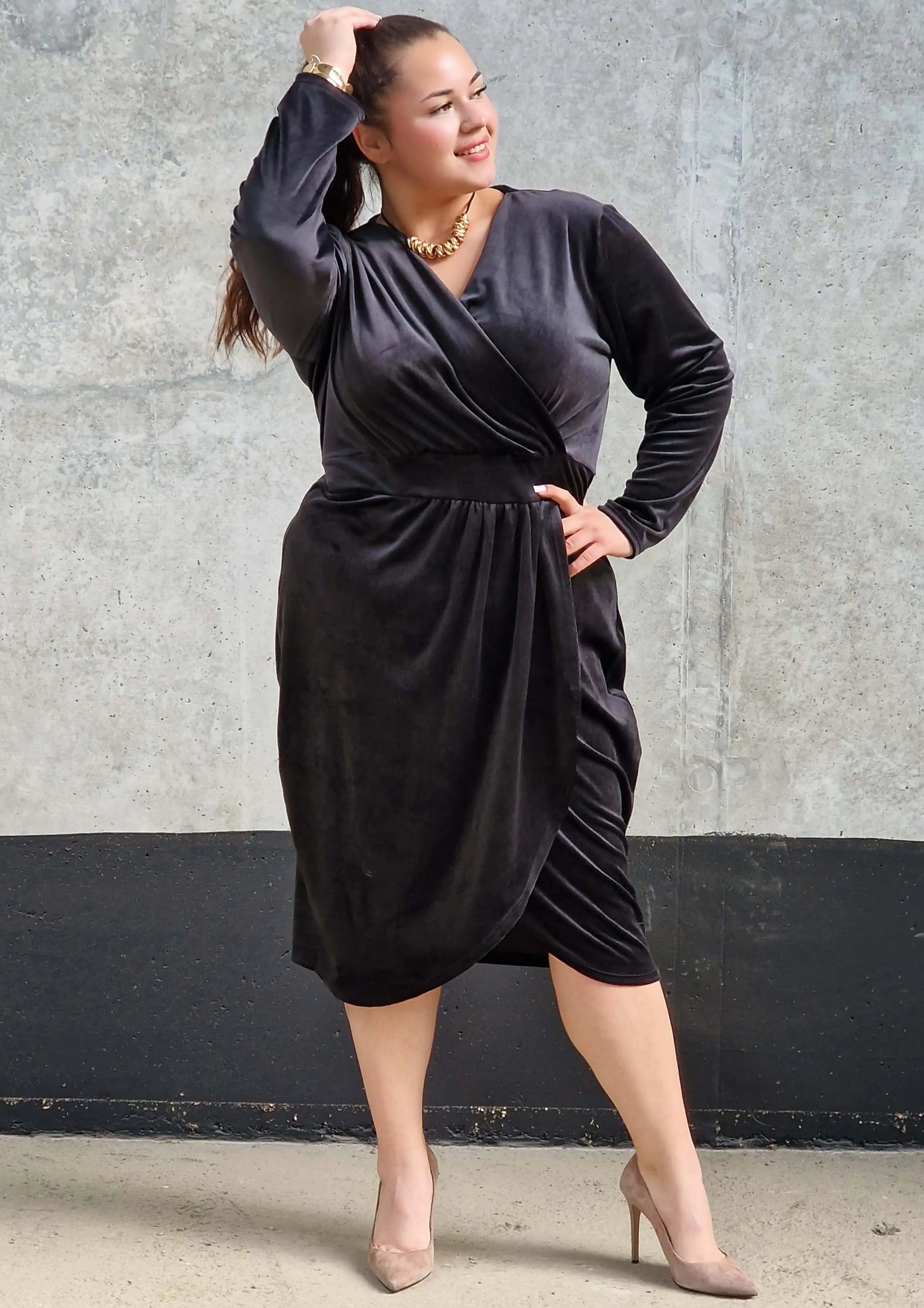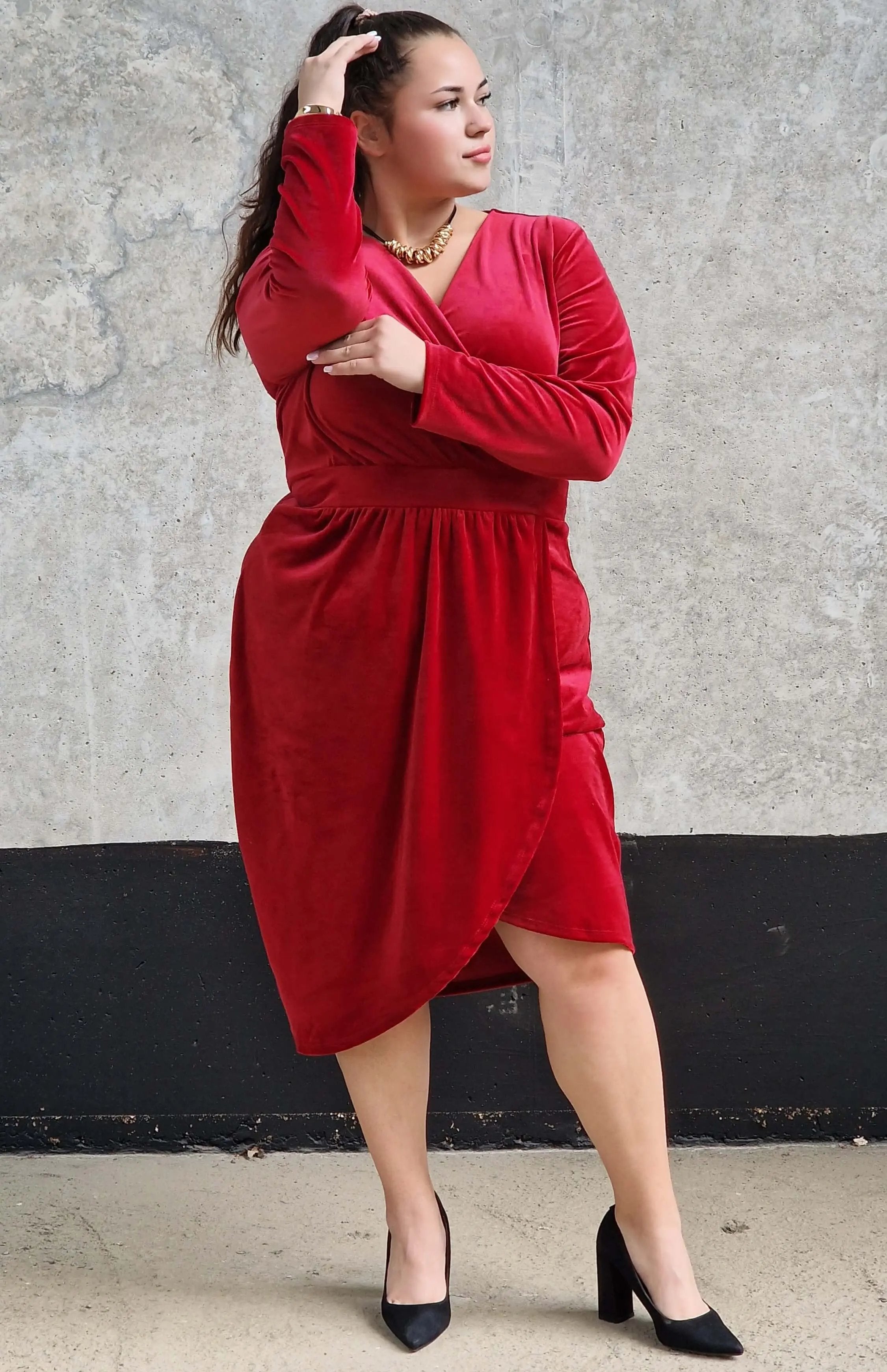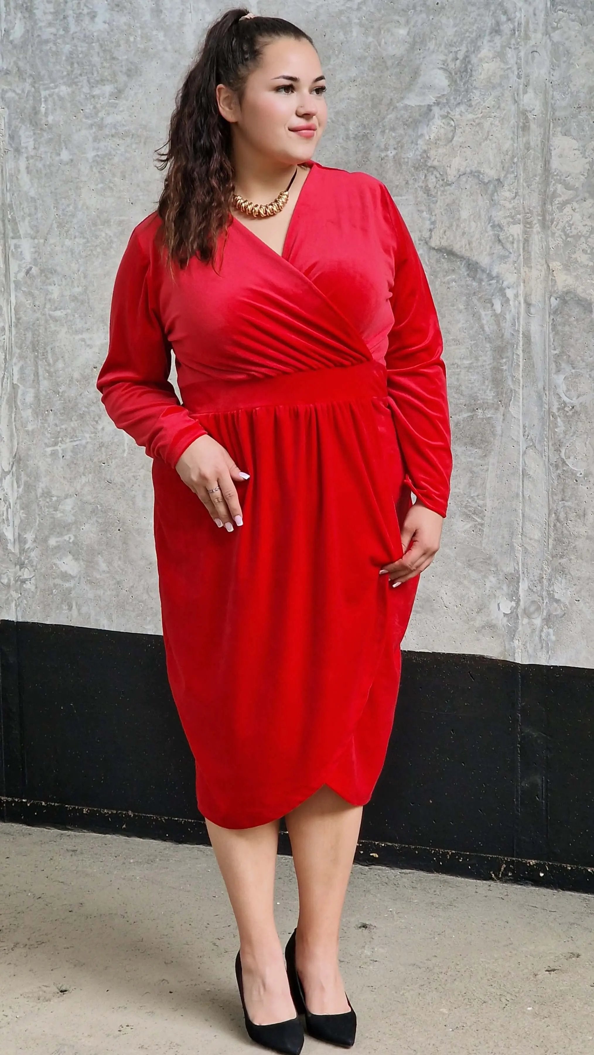 Szukasz sukienki, która połączy wygodę z elegancją? Ten welurowy model to prawdziwy hit! Miękki materiał otula ciało, a zakładany krój pięknie podkreśla kobiecą sylwetkę. Kopertowy dekolt, szeroki pas i efektowne drapowanie sprawiają, że wygląda zjawiskowo – zarówno w wersji dziennej, jak i wieczorowej. Do wyboru aż cztery kolory – wybierz swój!