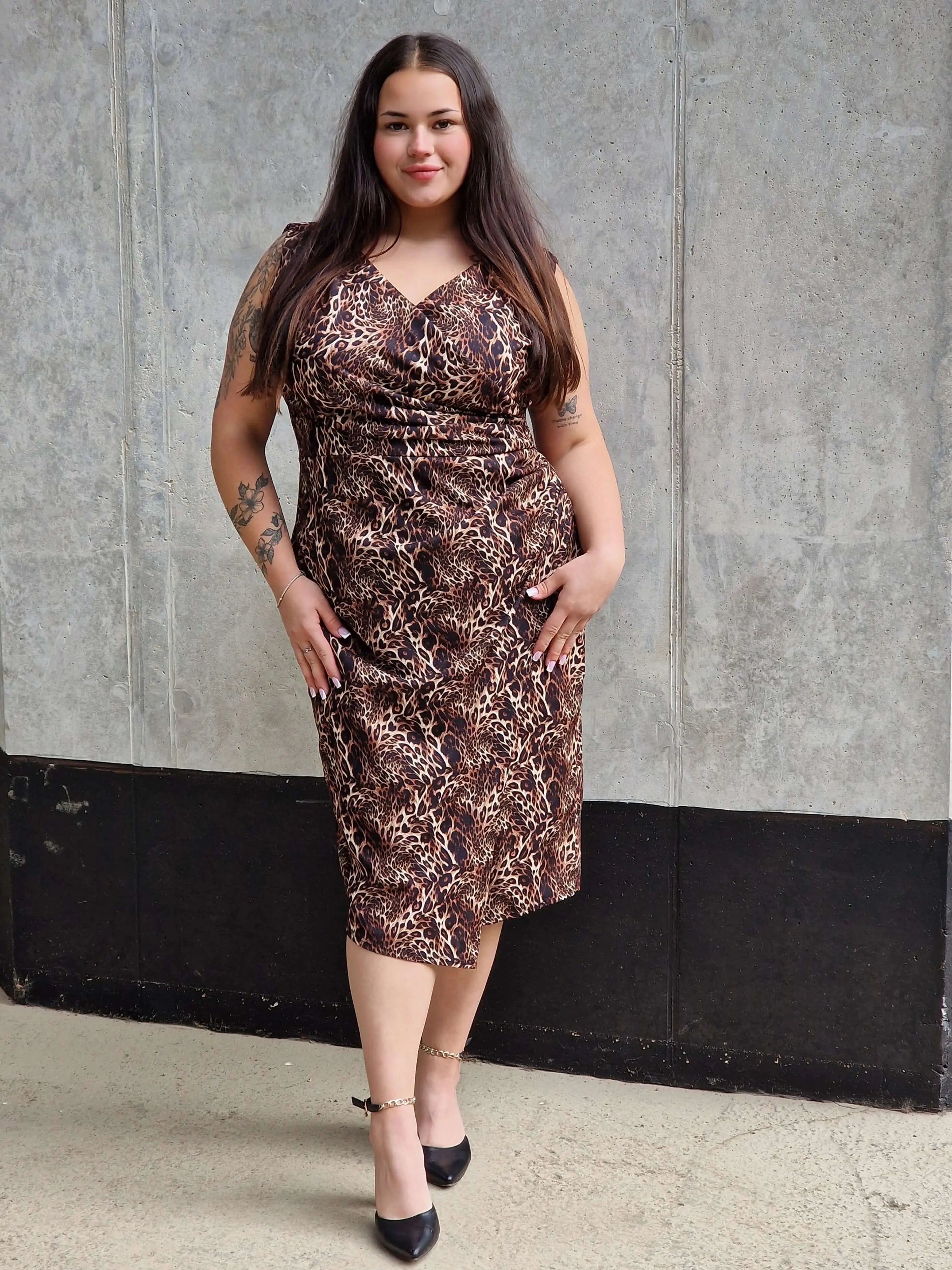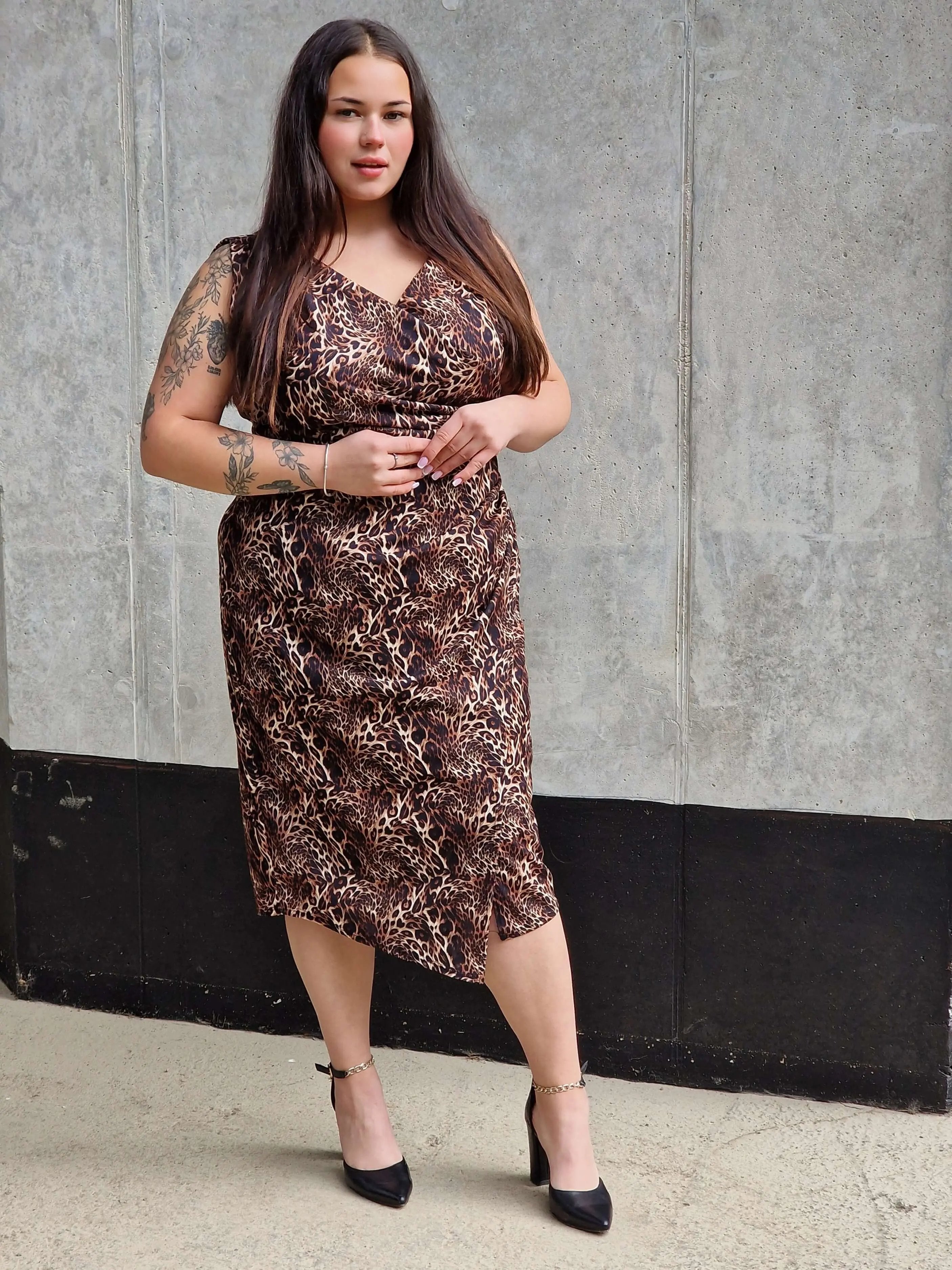 Dzięki kobiecemu krojowi z dekoltem i rozcięciem z przodu, ta sukienka pięknie podkreśla figurę i dodaje pewności siebie.