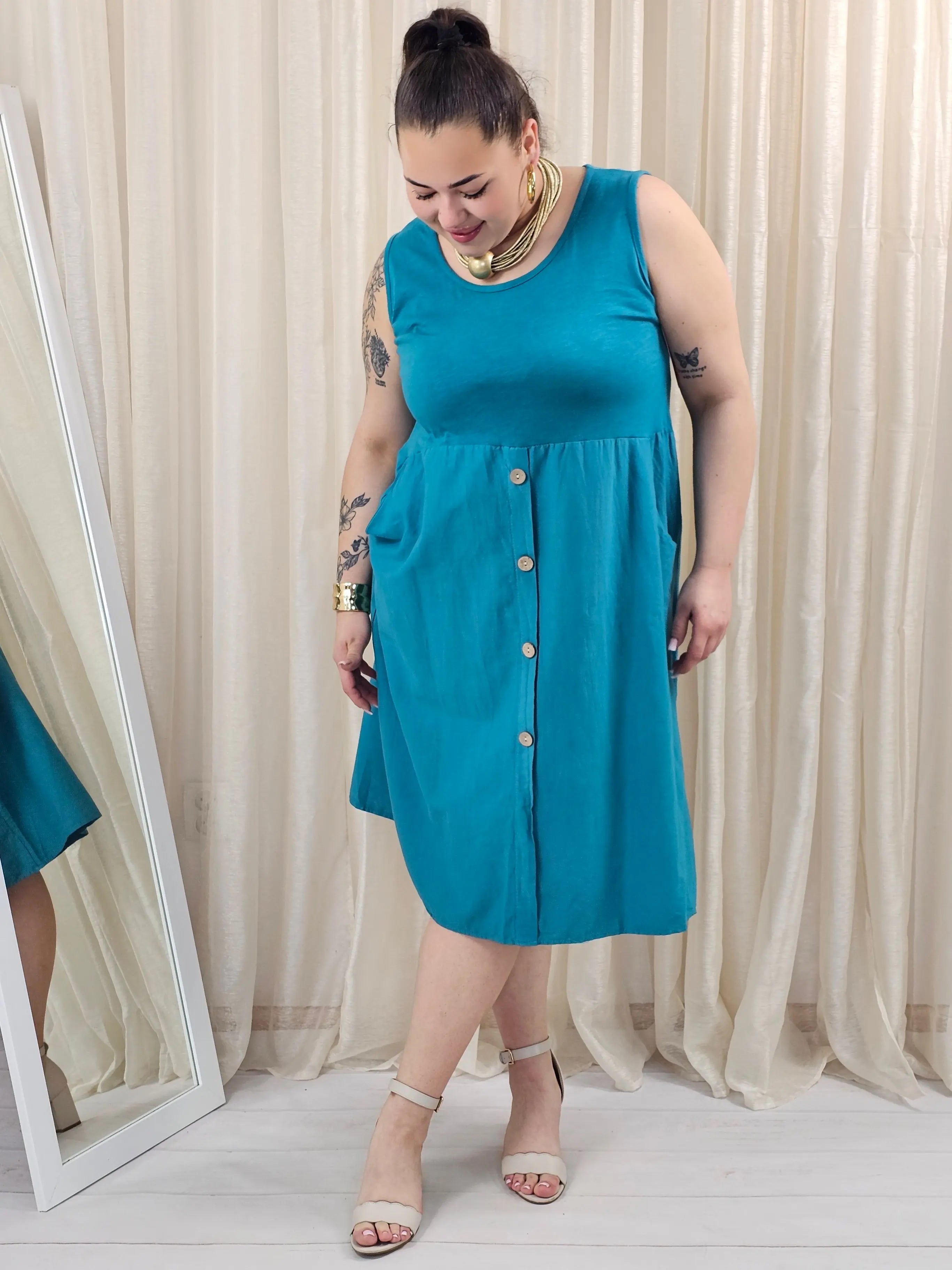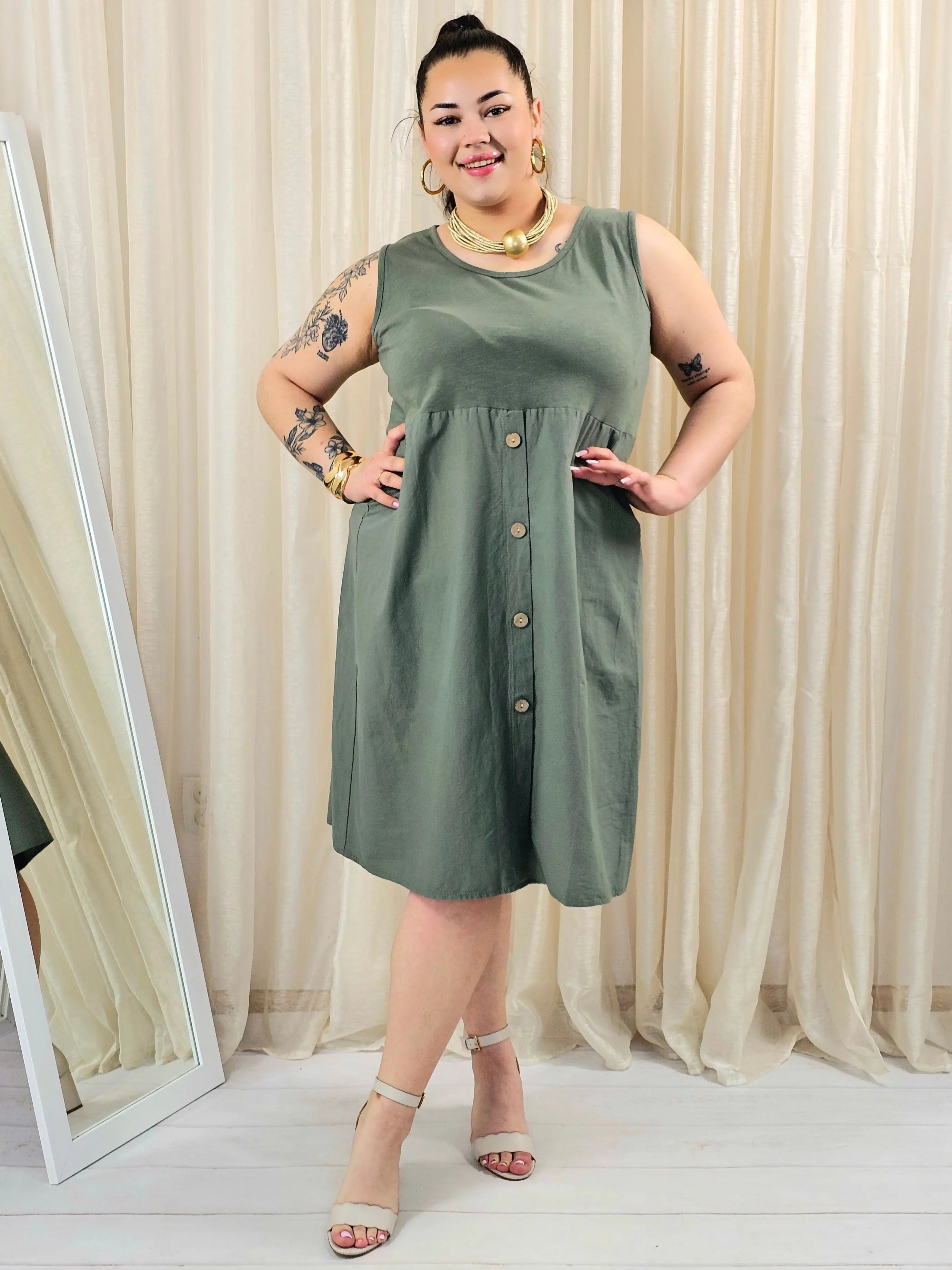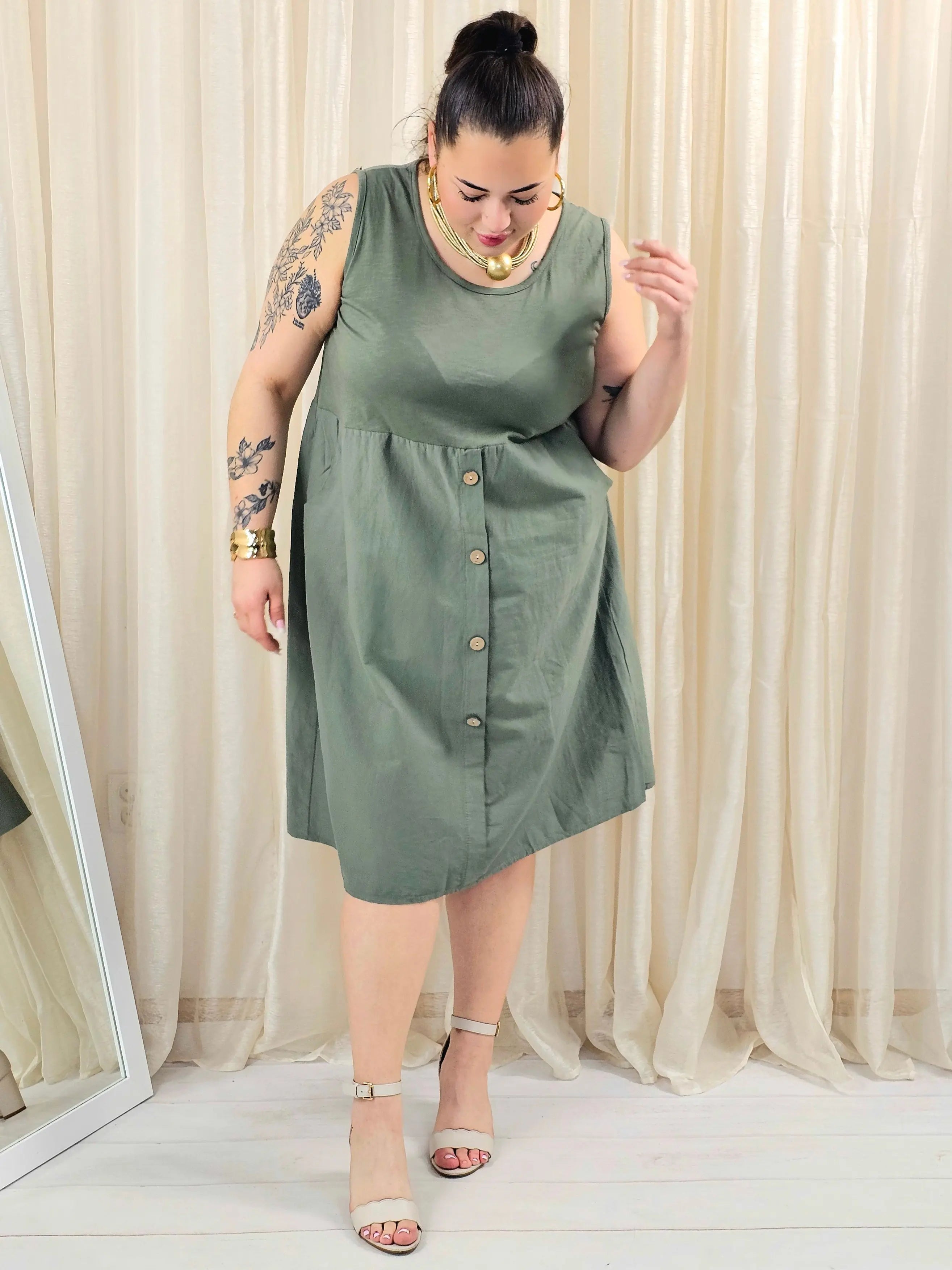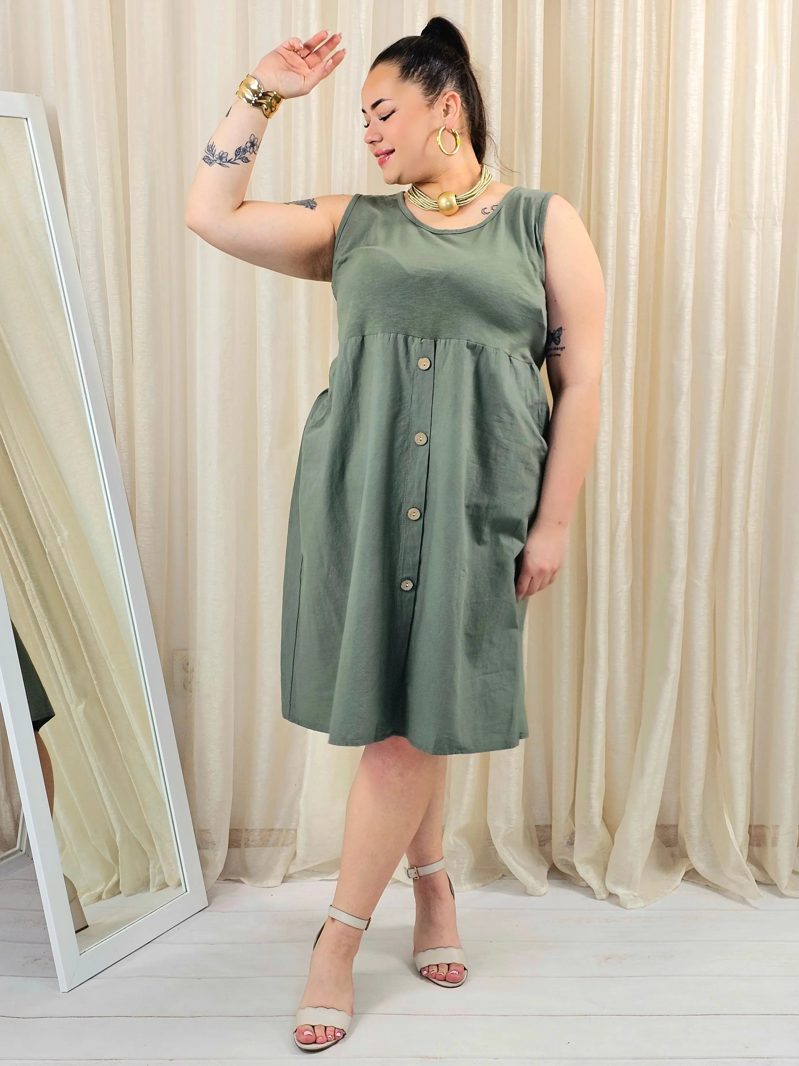 Podsumowując, sukienka na ramiączkach z zaokrąglonym dekoltem, odcinana pod biustem, guziczkami ozdobnymi w dolnej części i kieszeniami po bokach to elegancki i praktyczny wybór. Sukienka ta podkreśla kobiecą sylwetkę, dodaje klasy i wygody dzięki swojemu krojowi i dodatkom. Może być odpowiednia na wiele różnych okazji, od formalnych wydarzeń po codzienne spotkania.
