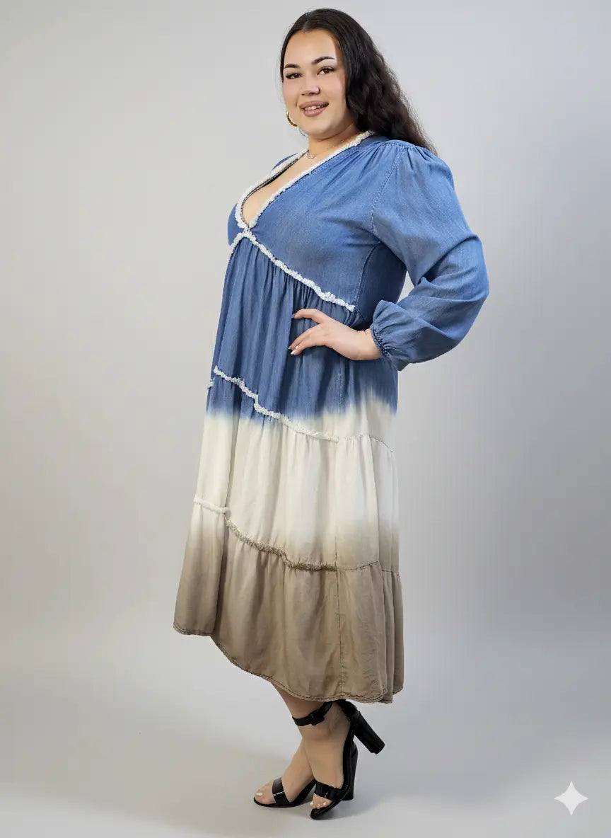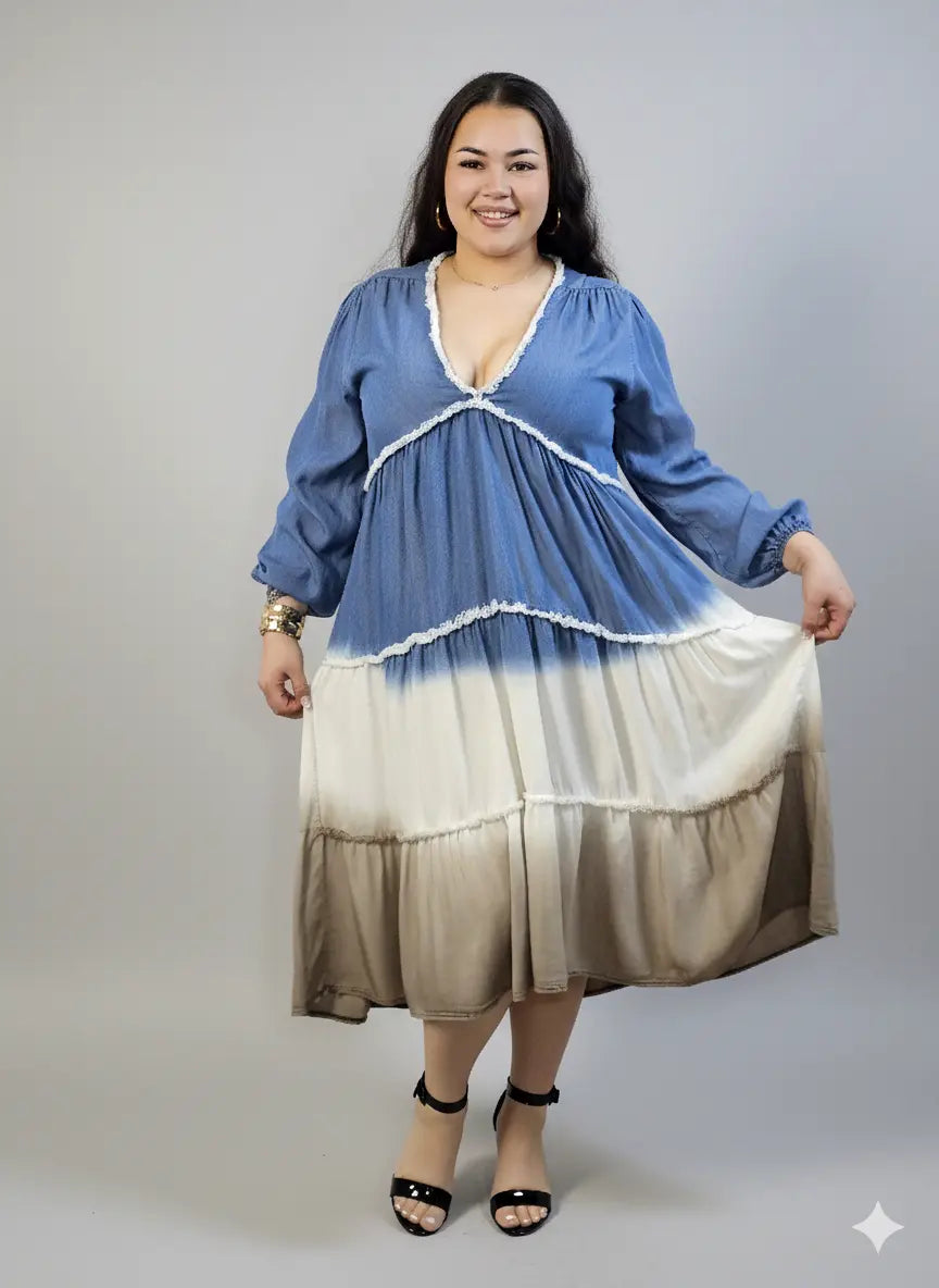 Dzięki warstwowym falbanom i dekoracyjnemu wykończeniu sukienka plus size wygląda lekko i stylowo, co sprawia, że pasuje zarówno na co dzień, jak i na wyjścia. To idealny wybór, jeśli szukasz modelu w duchu mody plus size dla kobiet, który robi efekt stylizacji bez wysiłku.