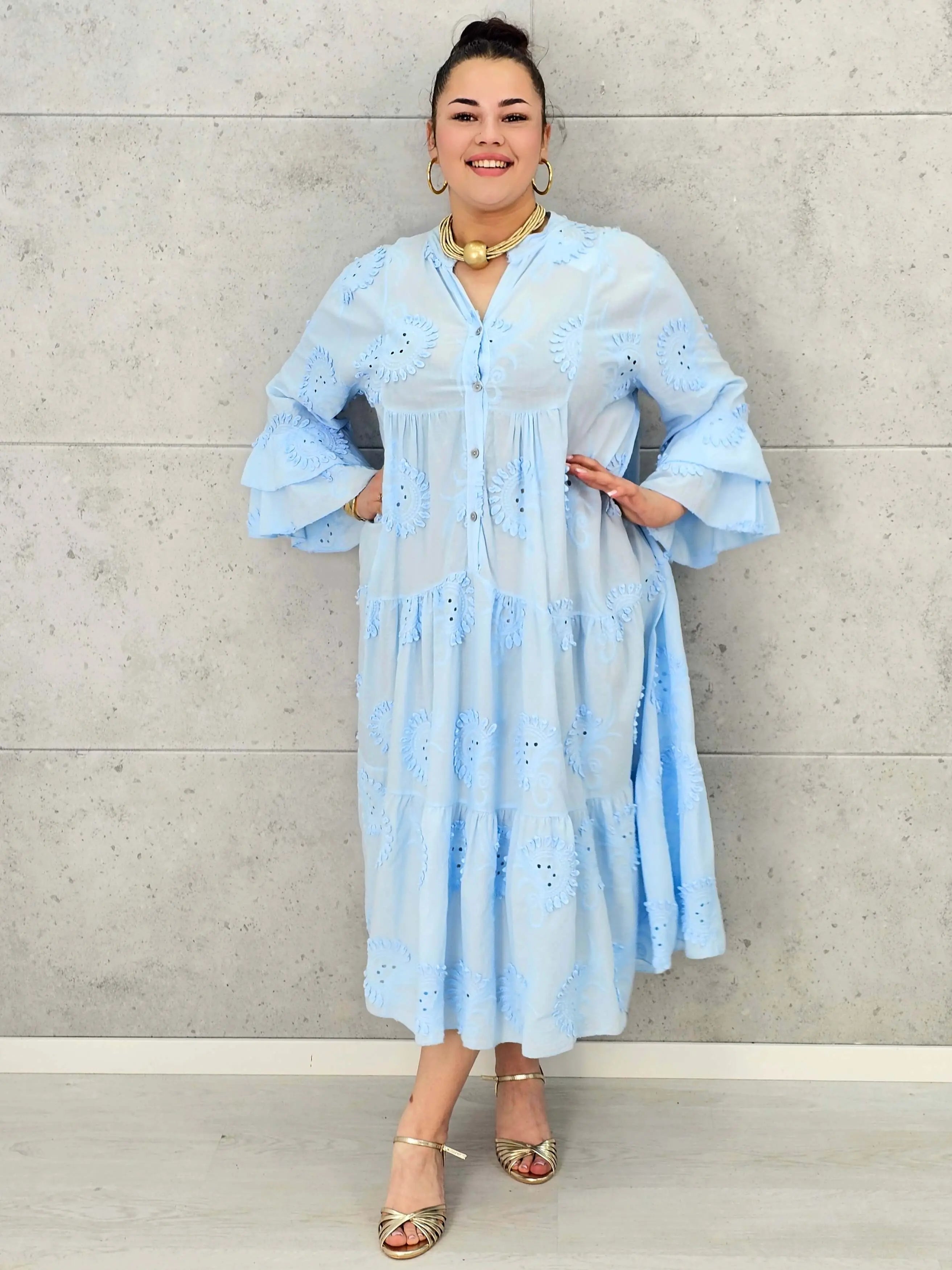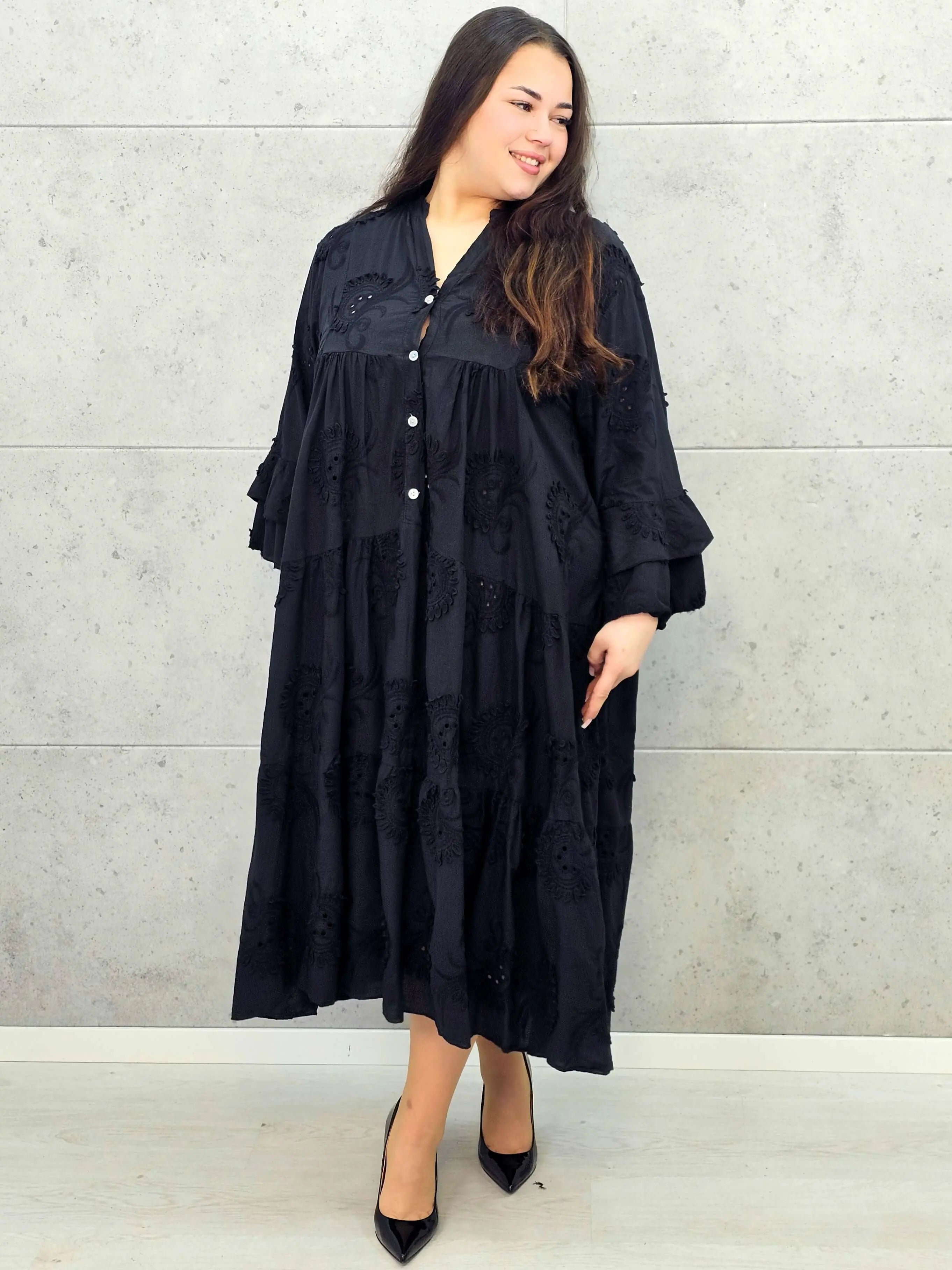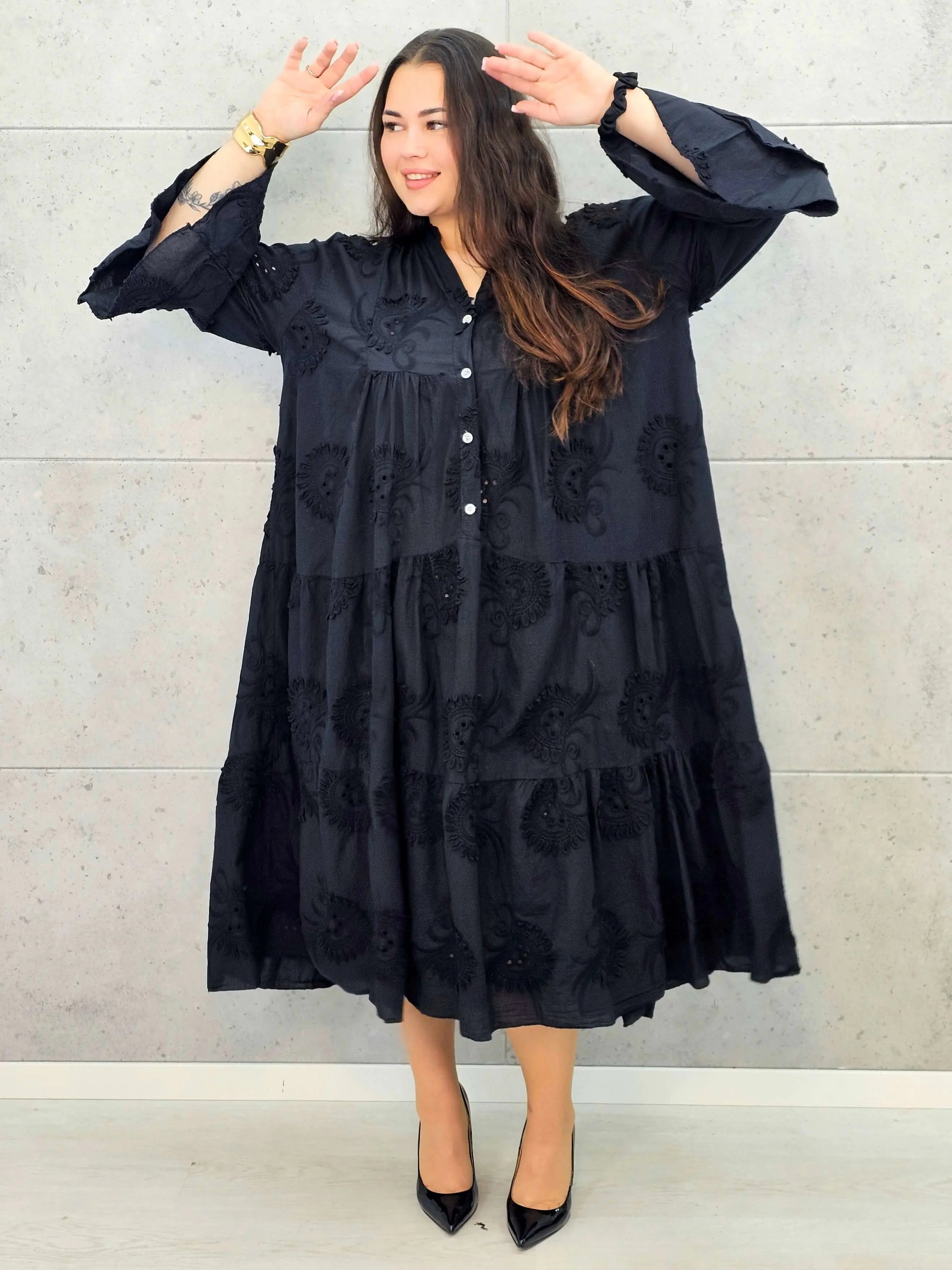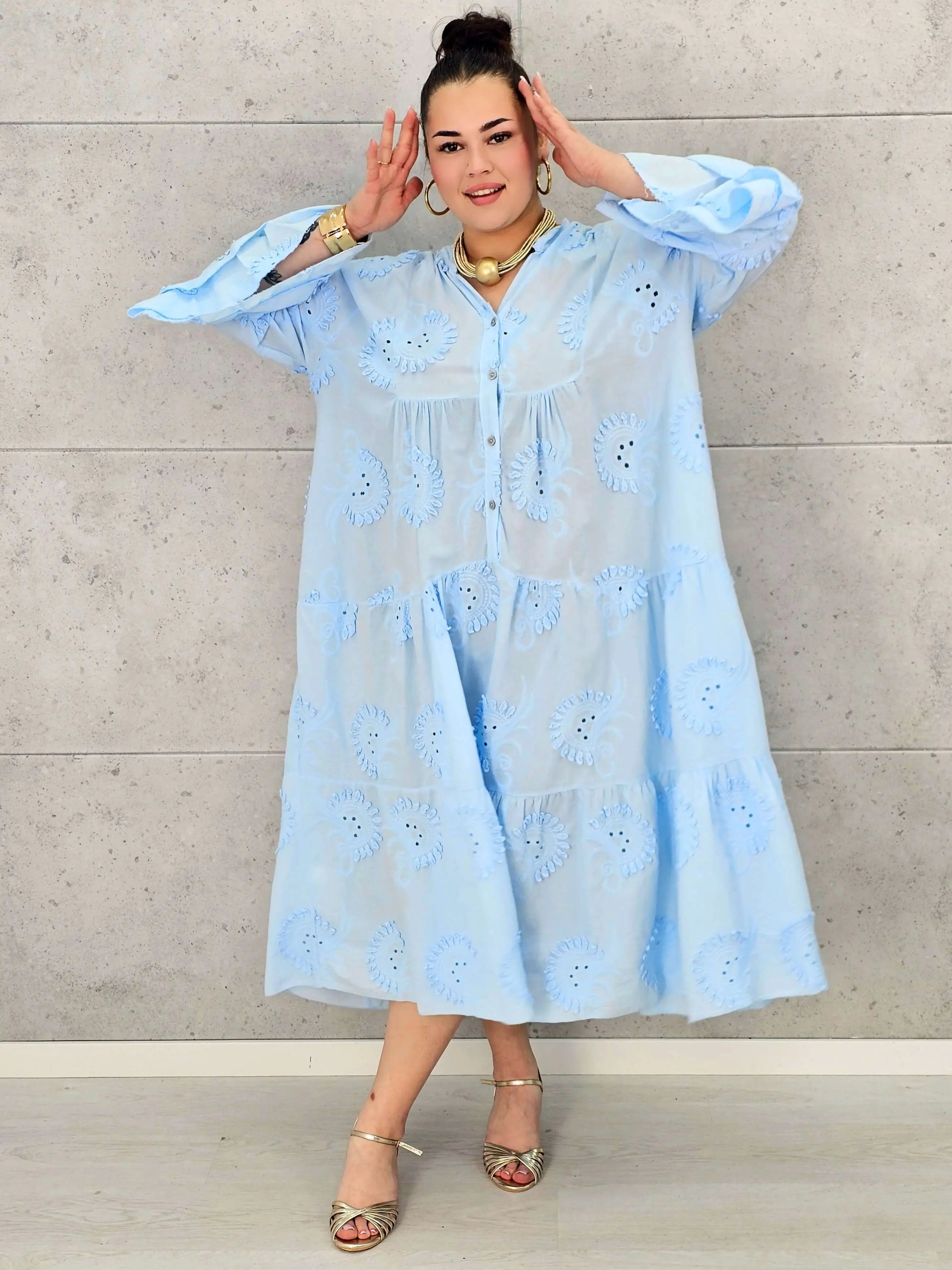 Sukienka plus size w stylu boho to doskonała propozycja dla kobiet, które cenią komfort, lekkość i modne detale charakterystyczne dla mody plus size. Luźny, swobodny krój pięknie układa się na sylwetce XXL, nie opina ciała i zapewnia pełną wygodę przez cały dzień. Haftowany materiał oraz delikatne przeszycia nadają całości wyjątkowego, romantycznego charakteru.